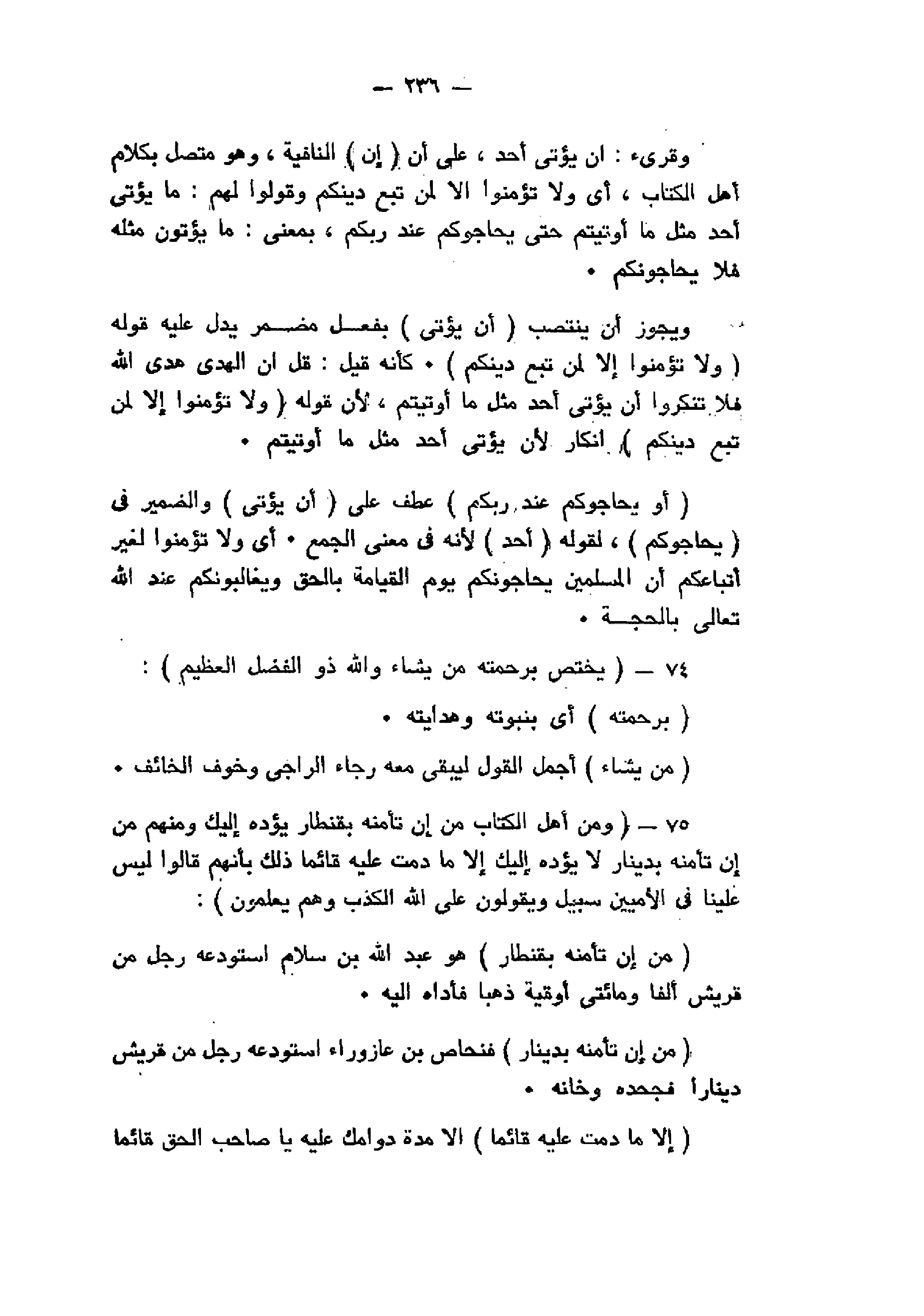 وقرىء: ان يؤتى أحد، على أن (إن) النافية، وهو متصل بكلام أهل الكتاب، أي ولا تؤمنوا الا لمن تبع دينكم وقولوا لهم: ما يؤتى أحد مثل ما أوتيتم حتى يحاجوكم عند ربكم، بمعنى: ما يؤتون مثله فلا يحاجونكم.