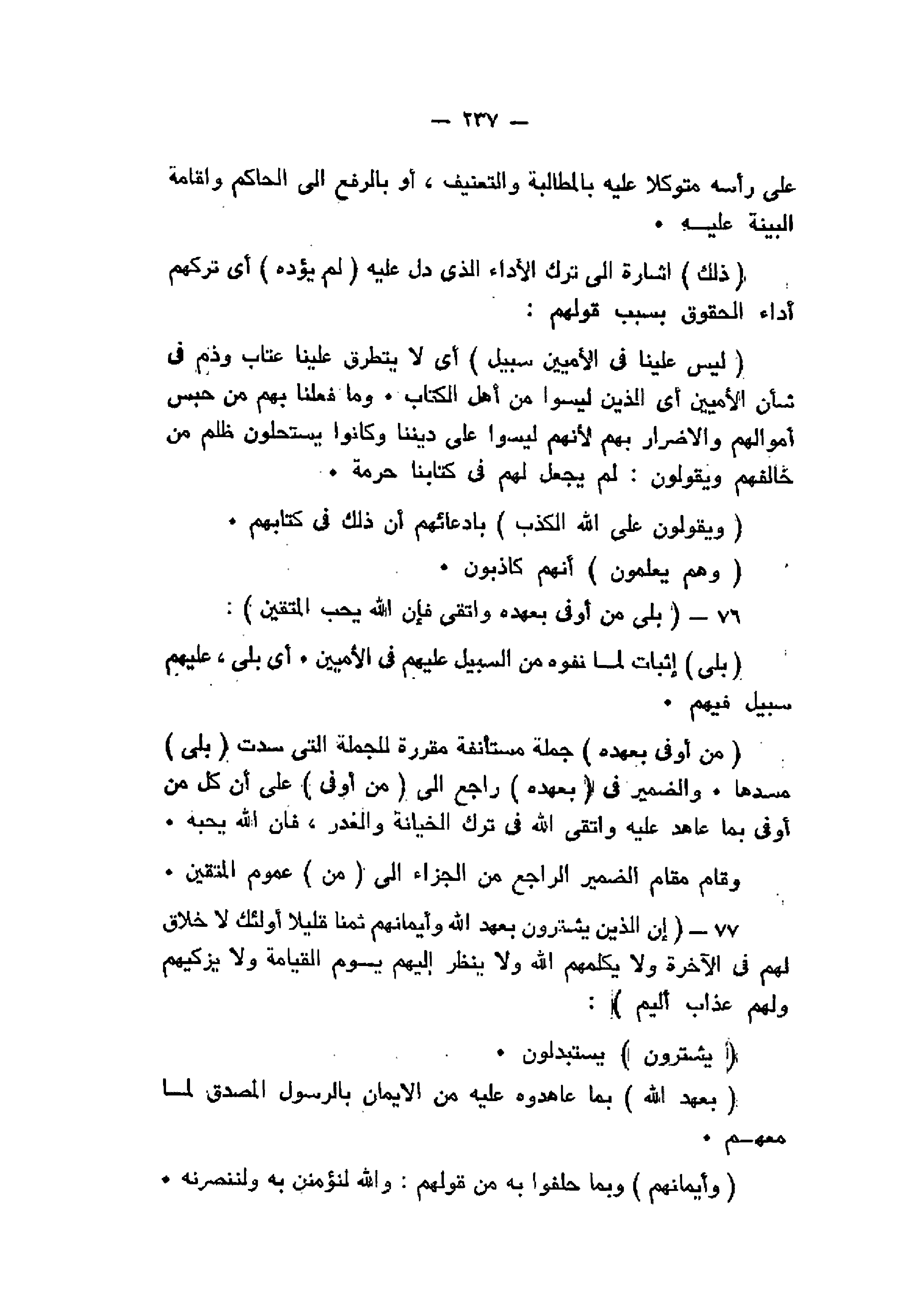 بَلى مَنْ أَوْفى بِعَهْدِهِ وَاتَّقى فَإِنَّ اللَّهَ يُحِبُّ الْمُتَّقِينَ (76) إِنَّ الَّذِينَ يَشْتَرُونَ بِعَهْدِ اللَّهِ وَأَيْمانِهِمْ ثَمَناً قَلِيلاً أُولئِكَ لا خَلاقَ لَهُمْ فِي الْآخِرَةِ وَلا يُكَلِّمُهُمُ اللَّهُ وَلا يَنْظُرُ إِلَيْهِمْ يَوْمَ الْقِيامَةِ وَلا يُزَكِّيهِمْ وَلَهُمْ عَذابٌ أَلِيمٌ (77)