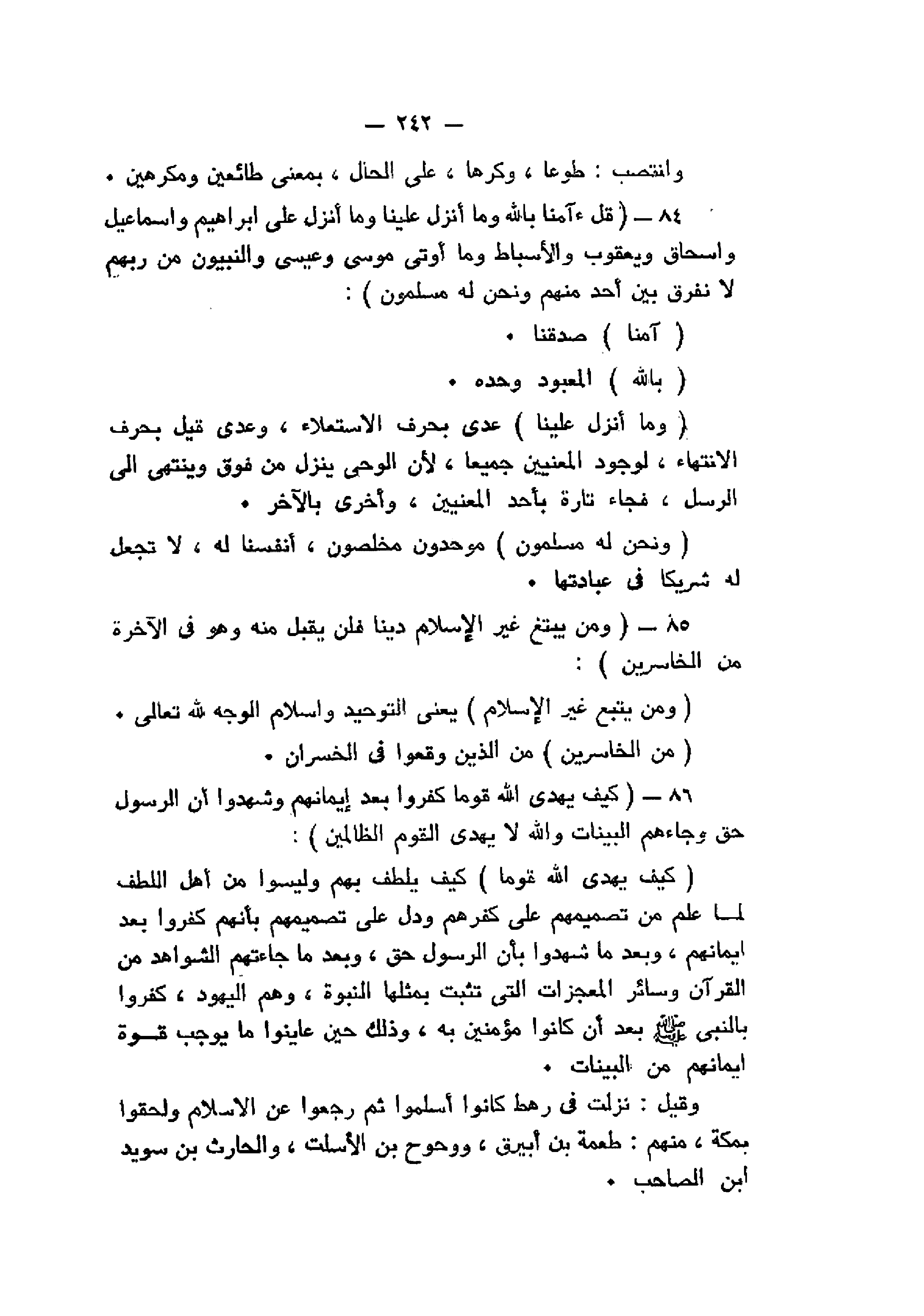 قُلْ آمَنَّا بِاللَّهِ وَما أُنْزِلَ عَلَيْنا وَما أُنْزِلَ عَلى إِبْراهِيمَ وَإِسْماعِيلَ وَإِسْحاقَ وَيَعْقُوبَ وَالْأَسْباطِ وَما أُوتِيَ مُوسى وَعِيسى وَالنَّبِيُّونَ مِنْ رَبِّهِمْ لا نُفَرِّقُ بَيْنَ أَحَدٍ مِنْهُمْ وَنَحْنُ لَهُ مُسْلِمُونَ (84) وَمَنْ يَبْتَغِ غَيْرَ الْإِسْلامِ دِيناً فَلَنْ يُقْبَلَ مِنْهُ وَهُوَ فِي الْآخِرَةِ مِنَ الْخاسِرِينَ (85) كَيْفَ يَهْدِي اللَّهُ قَوْماً كَفَرُوا بَعْدَ إِيمانِهِمْ وَشَهِدُوا أَنَّ الرَّسُولَ حَقٌّ وَجاءَهُمُ الْبَيِّناتُ وَاللَّهُ لا يَهْدِي الْقَوْمَ الظَّالِمِينَ (86)