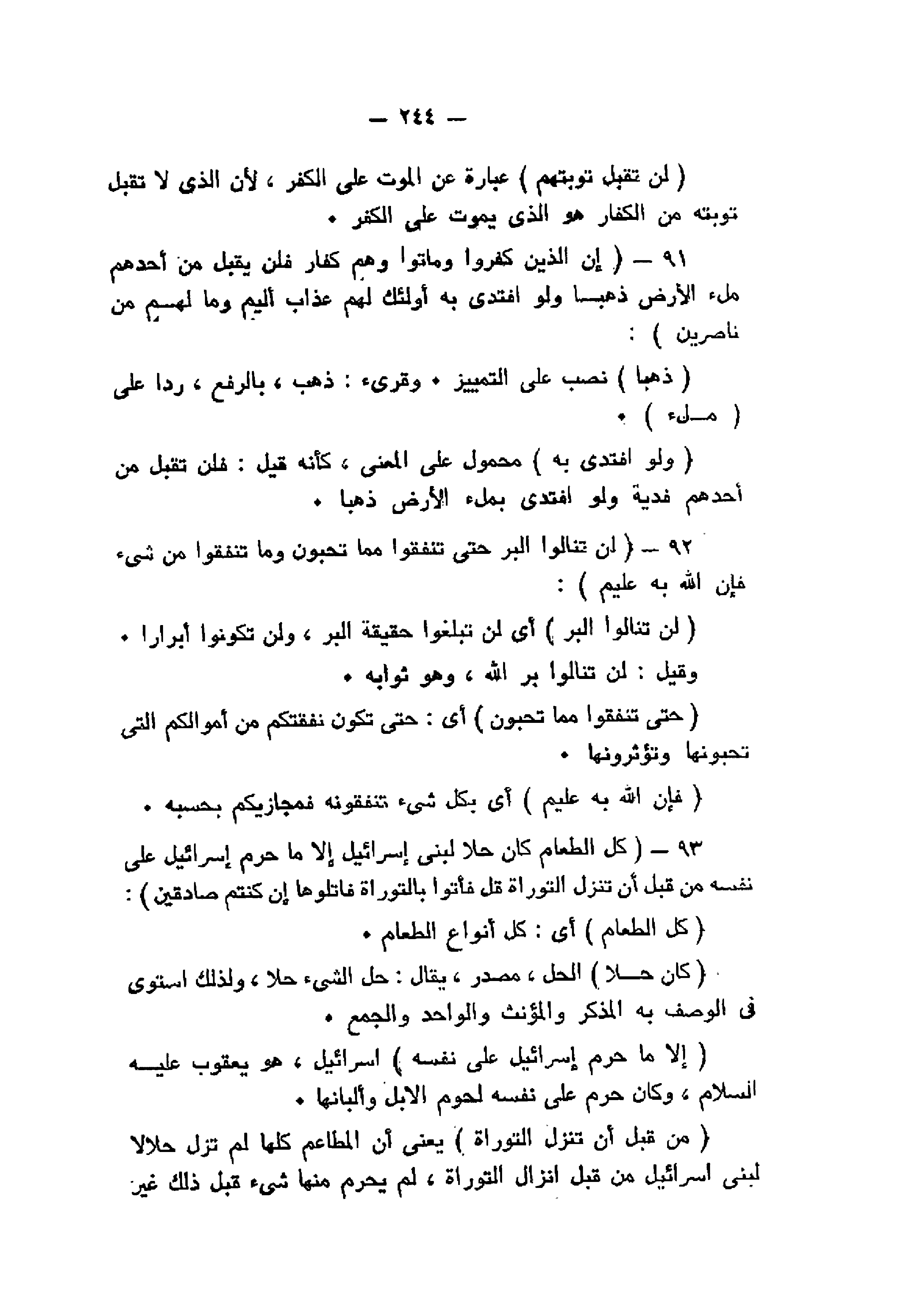 إِنَّ الَّذِينَ كَفَرُوا وَماتُوا وَهُمْ كُفَّارٌ فَلَنْ يُقْبَلَ مِنْ أَحَدِهِمْ مِلْءُ الْأَرْضِ ذَهَباً وَلَوِ افْتَدى بِهِ أُولئِكَ لَهُمْ عَذابٌ أَلِيمٌ وَما لَهُمْ مِنْ ناصِرِينَ (91) لَنْ تَنالُوا الْبِرَّ حَتَّى تُنْفِقُوا مِمَّا تُحِبُّونَ وَما تُنْفِقُوا مِنْ شَيْءٍ فَإِنَّ اللَّهَ بِهِ عَلِيمٌ (92) كُلُّ الطَّعامِ كانَ حِلاًّ لِبَنِي إِسْرائِيلَ إِلاَّ ما حَرَّمَ إِسْرائِيلُ عَلى نَفْسِهِ مِنْ قَبْلِ أَنْ تُنَزَّلَ التَّوْراةُ قُلْ فَأْتُوا بِالتَّوْراةِ فَاتْلُوها إِنْ كُنْتُمْ صادِقِينَ (93)