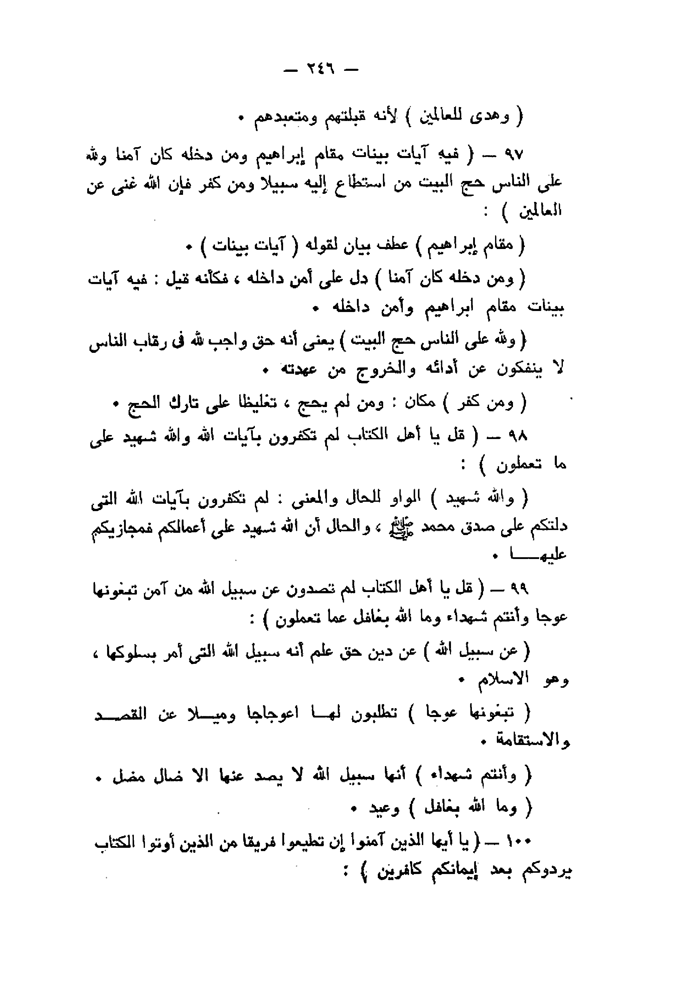 فِيهِ آياتٌ بَيِّناتٌ مَقامُ إِبْراهِيمَ وَمَنْ دَخَلَهُ كانَ آمِناً وَلِلَّهِ عَلَى النَّاسِ حِجُّ الْبَيْتِ مَنِ اسْتَطاعَ إِلَيْهِ سَبِيلاً وَمَنْ كَفَرَ فَإِنَّ اللَّهَ غَنِيٌّ عَنِ الْعالَمِينَ (97) قُلْ يا أَهْلَ الْكِتابِ لِمَ تَكْفُرُونَ بِآياتِ اللَّهِ وَاللَّهُ شَهِيدٌ عَلى ما تَعْمَلُونَ (98) قُلْ يا أَهْلَ الْكِتابِ لِمَ تَصُدُّونَ عَنْ سَبِيلِ اللَّهِ مَنْ آمَنَ تَبْغُونَها عِوَجاً وَأَنْتُمْ شُهَداءُ وَمَا اللَّهُ بِغافِلٍ عَمَّا تَعْمَلُونَ (99)