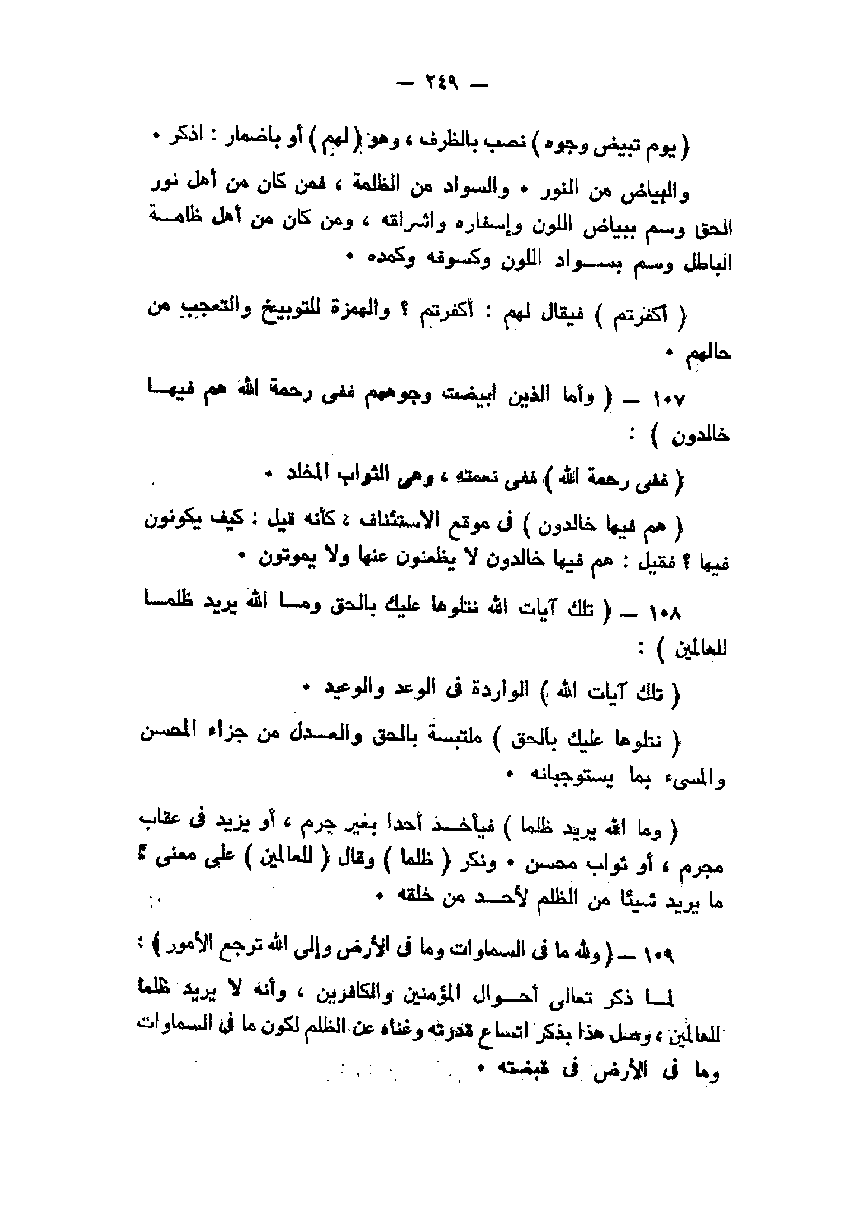 وَأَمَّا الَّذِينَ ابْيَضَّتْ وُجُوهُهُمْ فَفِي رَحْمَتِ اللَّهِ هُمْ فِيها خالِدُونَ (107) تِلْكَ آياتُ اللَّهِ نَتْلُوها عَلَيْكَ بِالْحَقِّ وَمَا اللَّهُ يُرِيدُ ظُلْماً لِلْعالَمِينَ (108) وَلِلَّهِ ما فِي السَّماواتِ وَما فِي الْأَرْضِ وَإِلَى اللَّهِ تُرْجَعُ الْأُمُورُ (109)