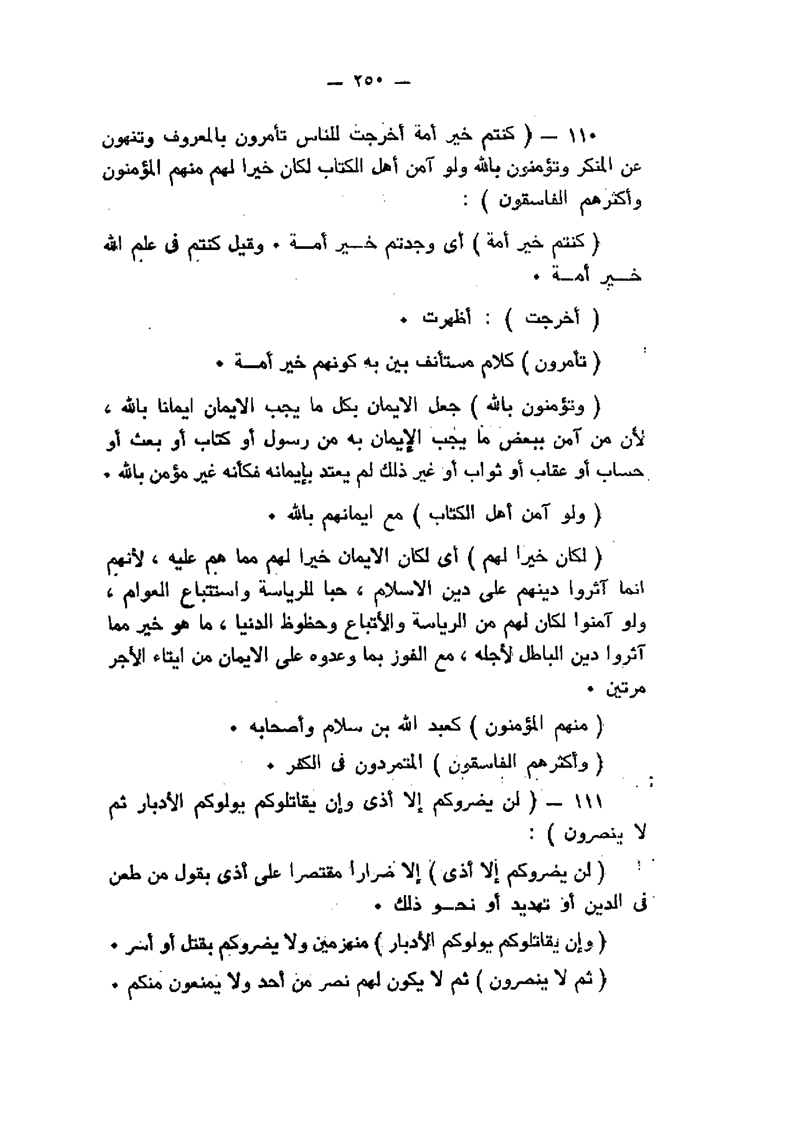 كُنْتُمْ خَيْرَ أُمَّةٍ أُخْرِجَتْ لِلنَّاسِ تَأْمُرُونَ بِالْمَعْرُوفِ وَتَنْهَوْنَ عَنِ الْمُنْكَرِ وَتُؤْمِنُونَ بِاللَّهِ وَلَوْ آمَنَ أَهْلُ الْكِتابِ لَكانَ خَيْراً لَهُمْ مِنْهُمُ الْمُؤْمِنُونَ وَأَكْثَرُهُمُ الْفاسِقُونَ (110) لَنْ يَضُرُّوكُمْ إِلاَّ أَذىً وَإِنْ يُقاتِلُوكُمْ يُوَلُّوكُمُ الْأَدْبارَ ثُمَّ لا يُنْصَرُونَ (111)