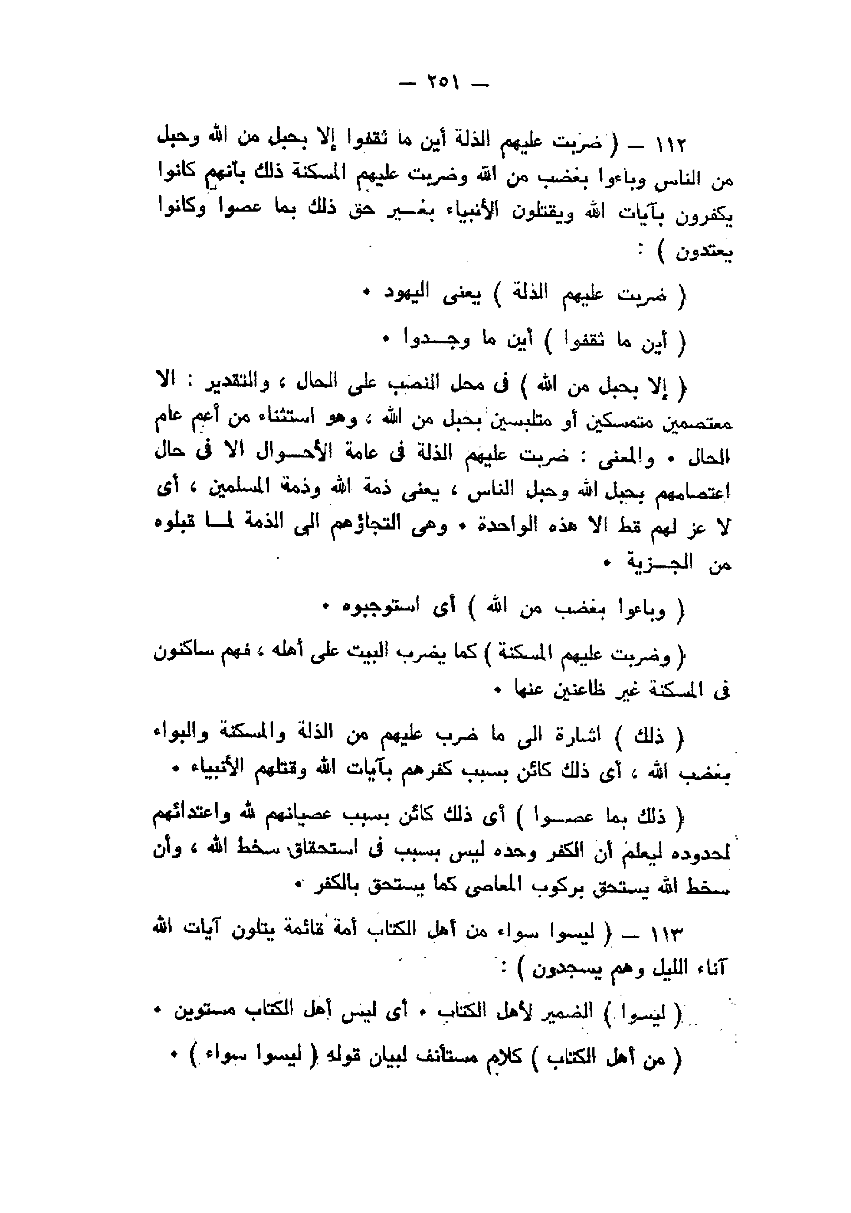 ضُرِبَتْ عَلَيْهِمُ الذِّلَّةُ أَيْنَ ما ثُقِفُوا إِلاَّ بِحَبْلٍ مِنَ اللَّهِ وَحَبْلٍ مِنَ النَّاسِ وَباؤُ بِغَضَبٍ مِنَ اللَّهِ وَضُرِبَتْ عَلَيْهِمُ الْمَسْكَنَةُ ذلِكَ بِأَنَّهُمْ كانُوا يَكْفُرُونَ بِآياتِ اللَّهِ وَيَقْتُلُونَ الْأَنْبِياءَ بِغَيْرِ حَقٍّ ذلِكَ بِما عَصَوْا وَكانُوا يَعْتَدُونَ (112) لَيْسُوا سَواءً مِنْ أَهْلِ الْكِتابِ أُمَّةٌ قائِمَةٌ يَتْلُونَ آياتِ اللَّهِ آناءَ اللَّيْلِ وَهُمْ يَسْجُدُونَ (113)
