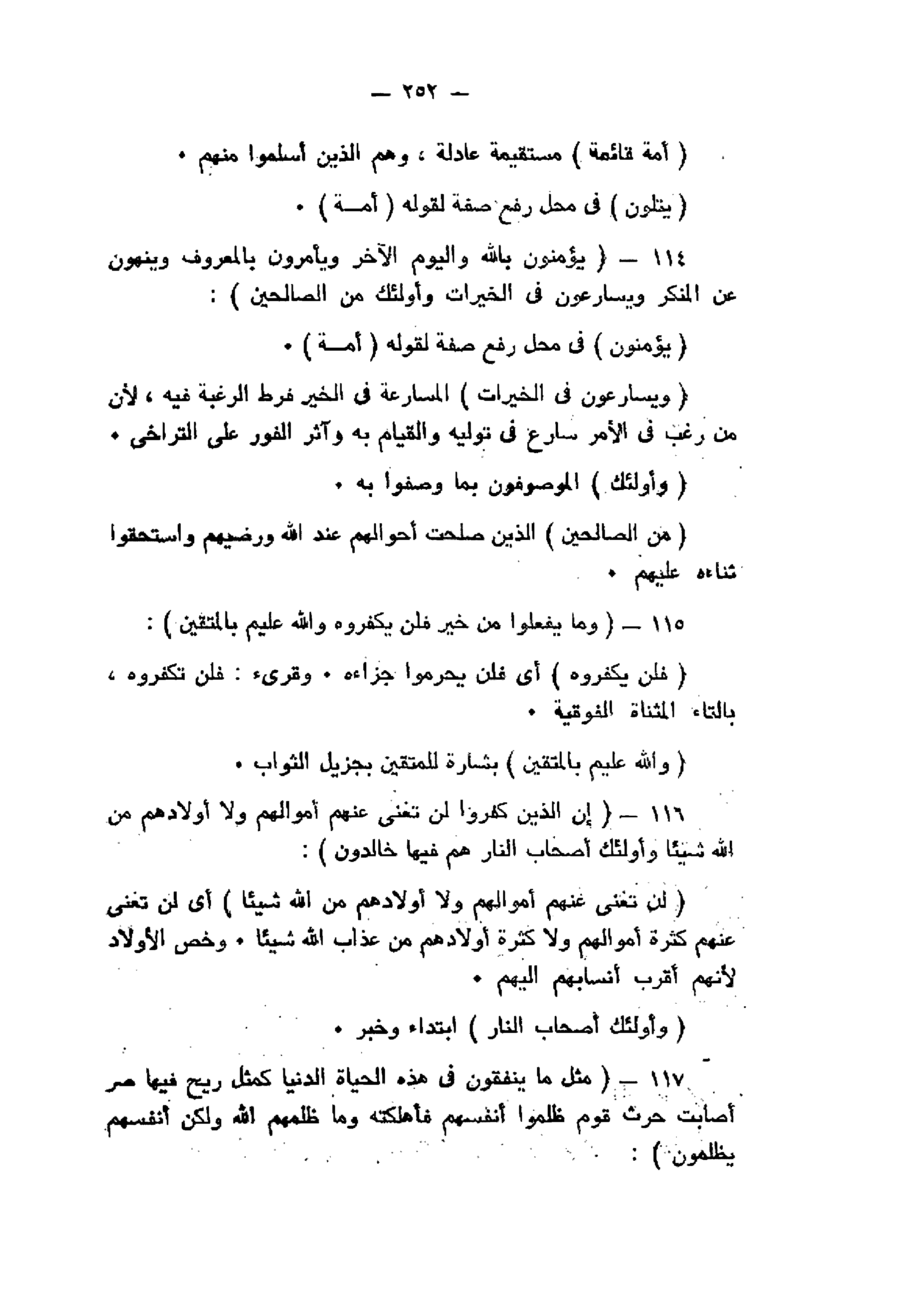 يُؤْمِنُونَ بِاللَّهِ وَالْيَوْمِ الْآخِرِ وَيَأْمُرُونَ بِالْمَعْرُوفِ وَيَنْهَوْنَ عَنِ الْمُنْكَرِ وَيُسارِعُونَ فِي الْخَيْراتِ وَأُولئِكَ مِنَ الصَّالِحِينَ (114) وَما يَفْعَلُوا مِنْ خَيْرٍ فَلَنْ يُكْفَرُوهُ وَاللَّهُ عَلِيمٌ بِالْمُتَّقِينَ (115) إِنَّ الَّذِينَ كَفَرُوا لَنْ تُغْنِيَ عَنْهُمْ أَمْوالُهُمْ وَلا أَوْلادُهُمْ مِنَ اللَّهِ شَيْئاً وَأُولئِكَ أَصْحابُ النَّارِ هُمْ فِيها خالِدُونَ (116) مَثَلُ ما يُنْفِقُونَ فِي هذِهِ الْحَياةِ الدُّنْيا كَمَثَلِ رِيحٍ فِيها صِرٌّ أَصابَتْ حَرْثَ قَوْمٍ ظَلَمُوا أَنْفُسَهُمْ فَأَهْلَكَتْهُ وَما ظَلَمَهُمُ اللَّهُ وَلكِنْ أَنْفُسَهُمْ يَظْلِمُونَ (117)