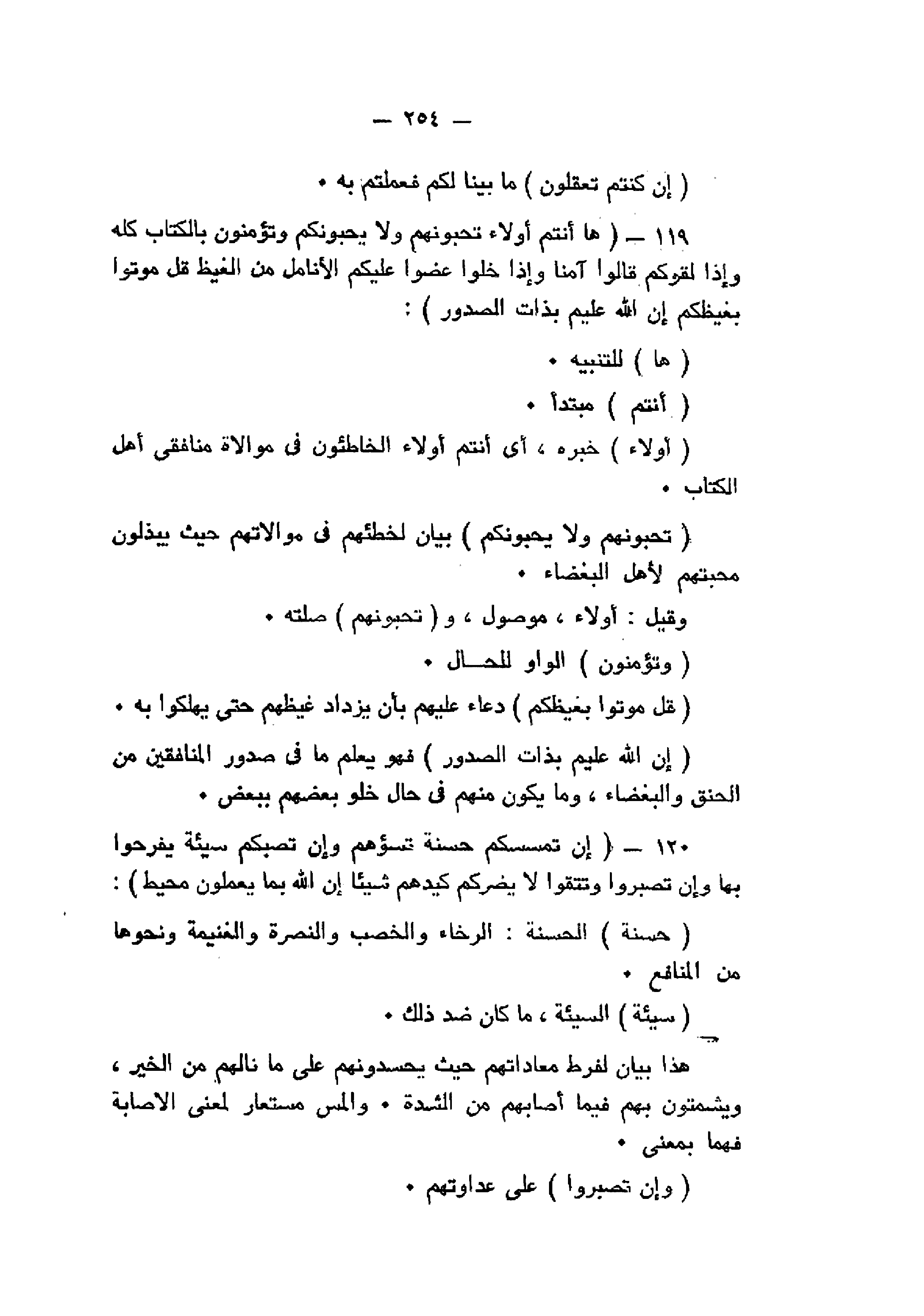 ها أَنْتُمْ أُولاءِ تُحِبُّونَهُمْ وَلا يُحِبُّونَكُمْ وَتُؤْمِنُونَ بِالْكِتابِ كُلِّهِ وَإِذا لَقُوكُمْ قالُوا آمَنَّا وَإِذا خَلَوْا عَضُّوا عَلَيْكُمُ الْأَنامِلَ مِنَ الْغَيْظِ قُلْ مُوتُوا بِغَيْظِكُمْ إِنَّ اللَّهَ عَلِيمٌ بِذاتِ الصُّدُورِ (119) إِنْ تَمْسَسْكُمْ حَسَنَةٌ تَسُؤْهُمْ وَإِنْ تُصِبْكُمْ سَيِّئَةٌ يَفْرَحُوا بِها وَإِنْ تَصْبِرُوا وَتَتَّقُوا لا يَضُرُّكُمْ كَيْدُهُمْ شَيْئاً إِنَّ اللَّهَ بِما يَعْمَلُونَ مُحِيطٌ (120)
