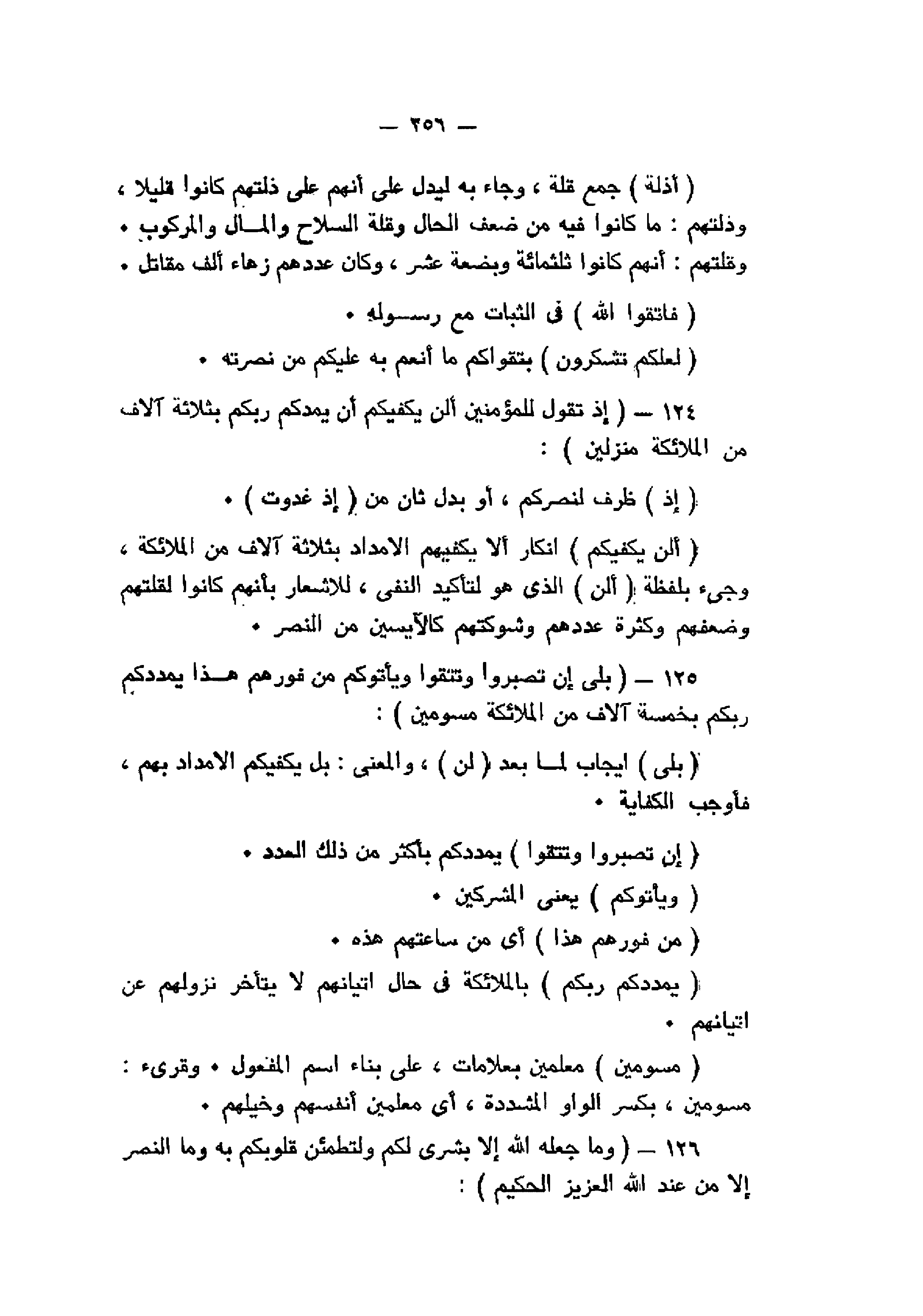 إِذْ تَقُولُ لِلْمُؤْمِنِينَ أَلَنْ يَكْفِيَكُمْ أَنْ يُمِدَّكُمْ رَبُّكُمْ بِثَلاثَةِ آلافٍ مِنَ الْمَلائِكَةِ مُنْزَلِينَ (124) بَلى إِنْ تَصْبِرُوا وَتَتَّقُوا وَيَأْتُوكُمْ مِنْ فَوْرِهِمْ هذا يُمْدِدْكُمْ رَبُّكُمْ بِخَمْسَةِ آلافٍ مِنَ الْمَلائِكَةِ مُسَوِّمِينَ (125) وَما جَعَلَهُ اللَّهُ إِلاَّ بُشْرى لَكُمْ وَلِتَطْمَئِنَّ قُلُوبُكُمْ بِهِ وَمَا النَّصْرُ إِلاَّ مِنْ عِنْدِ اللَّهِ الْعَزِيزِ الْحَكِيمِ (126)
