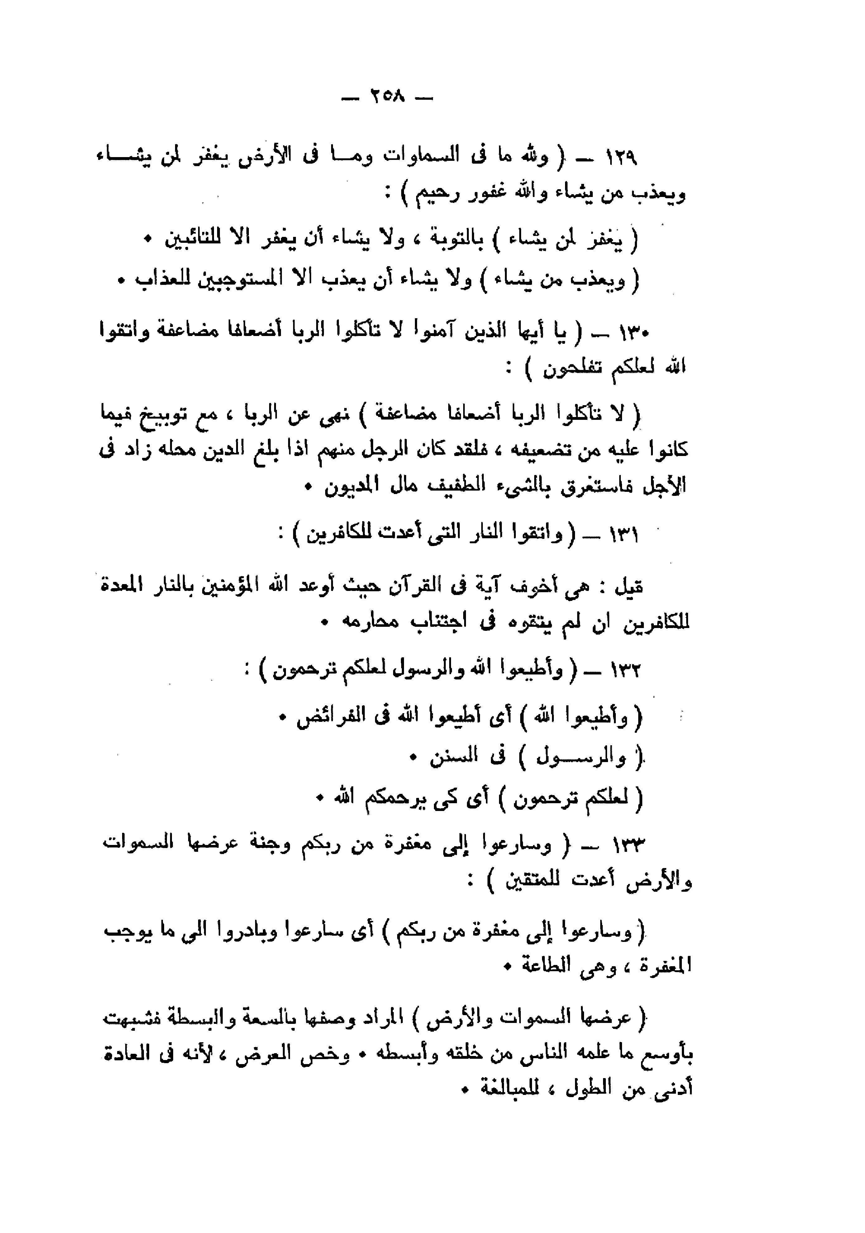 وَلِلَّهِ ما فِي السَّماواتِ وَما فِي الْأَرْضِ يَغْفِرُ لِمَنْ يَشاءُ وَيُعَذِّبُ مَنْ يَشاءُ وَاللَّهُ غَفُورٌ رَحِيمٌ (129) يا أَيُّهَا الَّذِينَ آمَنُوا لا تَأْكُلُوا الرِّبَوا أَضْعافاً مُضاعَفَةً وَاتَّقُوا اللَّهَ لَعَلَّكُمْ تُفْلِحُونَ (130) وَاتَّقُوا النَّارَ الَّتِي أُعِدَّتْ لِلْكافِرِينَ (131) وَأَطِيعُوا اللَّهَ وَالرَّسُولَ لَعَلَّكُمْ تُرْحَمُونَ (132) وَسارِعُوا إِلى مَغْفِرَةٍ مِنْ رَبِّكُمْ وَجَنَّةٍ عَرْضُهَا السَّماواتُ وَالْأَرْضُ أُعِدَّتْ لِلْمُتَّقِينَ (133)