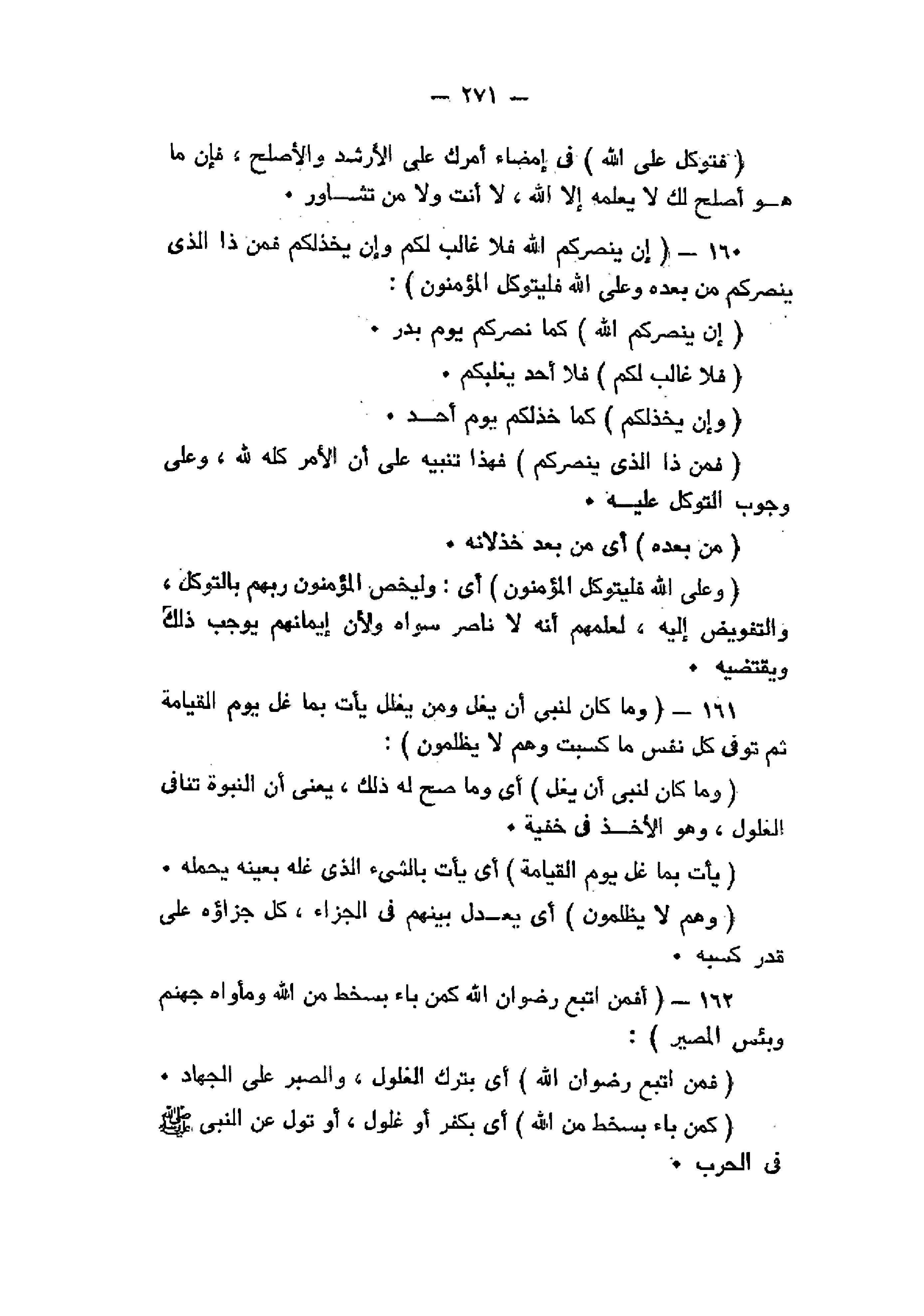 إِنْ يَنْصُرْكُمُ اللَّهُ فَلا غالِبَ لَكُمْ وَإِنْ يَخْذُلْكُمْ فَمَنْ ذَا الَّذِي يَنْصُرُكُمْ مِنْ بَعْدِهِ وَعَلَى اللَّهِ فَلْيَتَوَكَّلِ الْمُؤْمِنُونَ (160) وَما كانَ لِنَبِيٍّ أَنْ يَغُلَّ وَمَنْ يَغْلُلْ يَأْتِ بِما غَلَّ يَوْمَ الْقِيامَةِ ثُمَّ تُوَفَّى كُلُّ نَفْسٍ ما كَسَبَتْ وَهُمْ لا يُظْلَمُونَ (161) أَفَمَنِ اتَّبَعَ رِضْوانَ اللَّهِ كَمَنْ باءَ بِسَخَطٍ مِنَ اللَّهِ وَمَأْواهُ جَهَنَّمُ وَبِئْسَ الْمَصِيرُ (162)