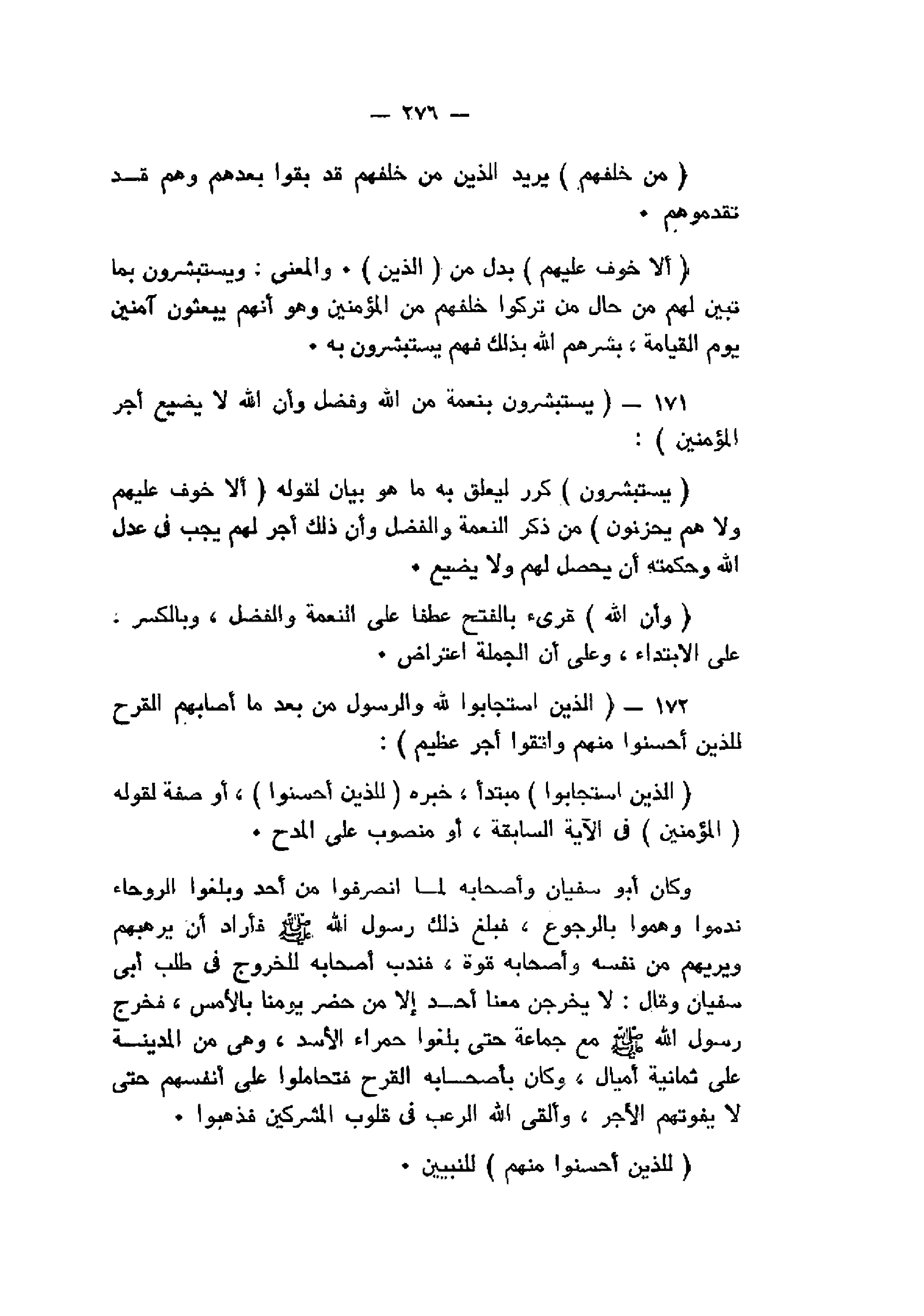 يَسْتَبْشِرُونَ بِنِعْمَةٍ مِنَ اللَّهِ وَفَضْلٍ وَأَنَّ اللَّهَ لا يُضِيعُ أَجْرَ الْمُؤْمِنِينَ (171) الَّذِينَ اسْتَجابُوا لِلَّهِ وَالرَّسُولِ مِنْ بَعْدِ ما أَصابَهُمُ الْقَرْحُ لِلَّذِينَ أَحْسَنُوا مِنْهُمْ وَاتَّقَوْا أَجْرٌ عَظِيمٌ (172)