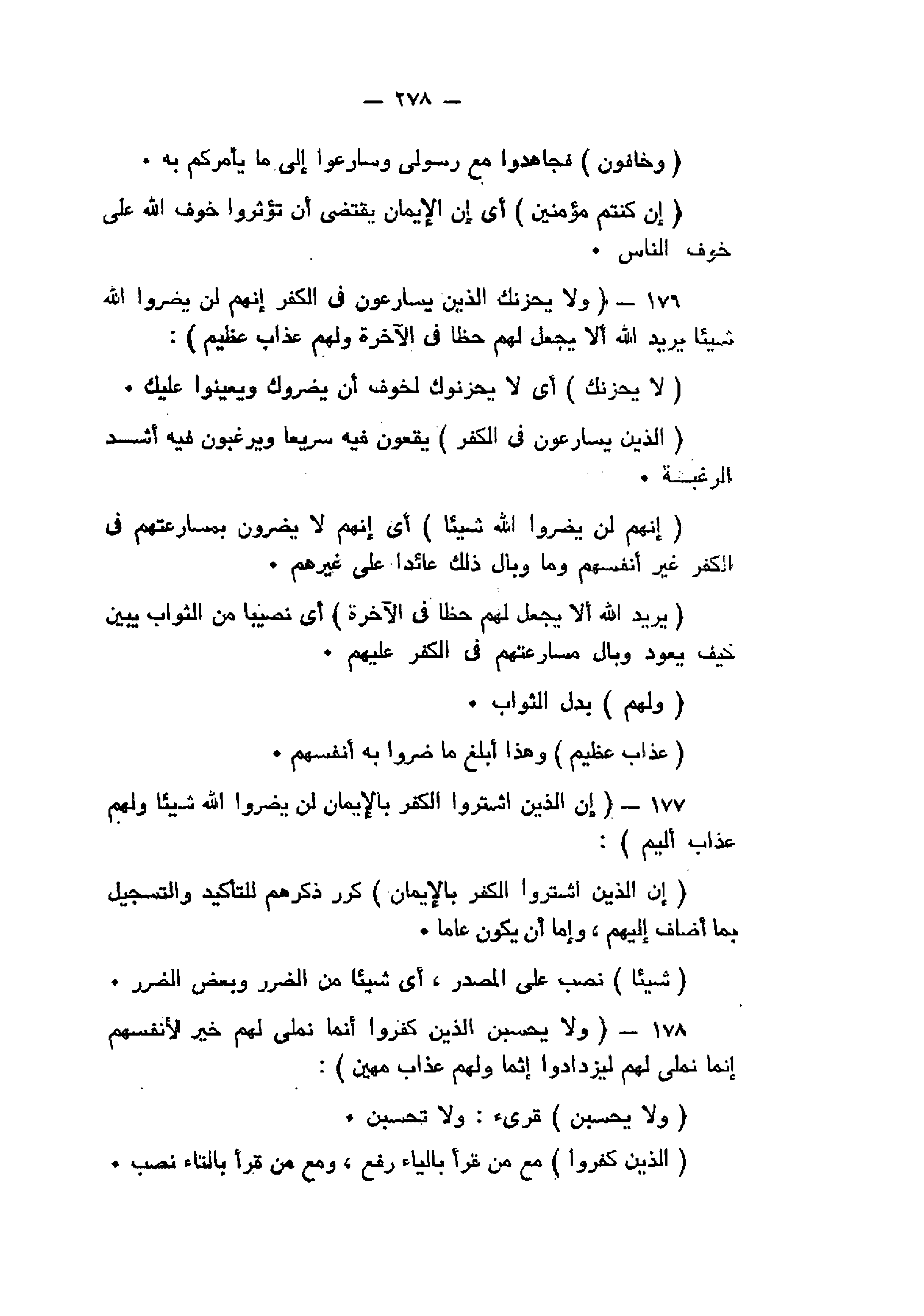 وَلا يَحْزُنْكَ الَّذِينَ يُسارِعُونَ فِي الْكُفْرِ إِنَّهُمْ لَنْ يَضُرُّوا اللَّهَ شَيْئاً يُرِيدُ اللَّهُ أَلاَّ يَجْعَلَ لَهُمْ حَظًّا فِي الْآخِرَةِ وَلَهُمْ عَذابٌ عَظِيمٌ (176) إِنَّ الَّذِينَ اشْتَرَوُا الْكُفْرَ بِالْإِيْمانِ لَنْ يَضُرُّوا اللَّهَ شَيْئاً وَلَهُمْ عَذابٌ أَلِيمٌ (177) وَلا يَحْسَبَنَّ الَّذِينَ كَفَرُوا أَنَّما نُمْلِي لَهُمْ خَيْرٌ لِأَنْفُسِهِمْ إِنَّما نُمْلِي لَهُمْ لِيَزْدادُوا إِثْماً وَلَهُمْ عَذابٌ مُهِينٌ (178)