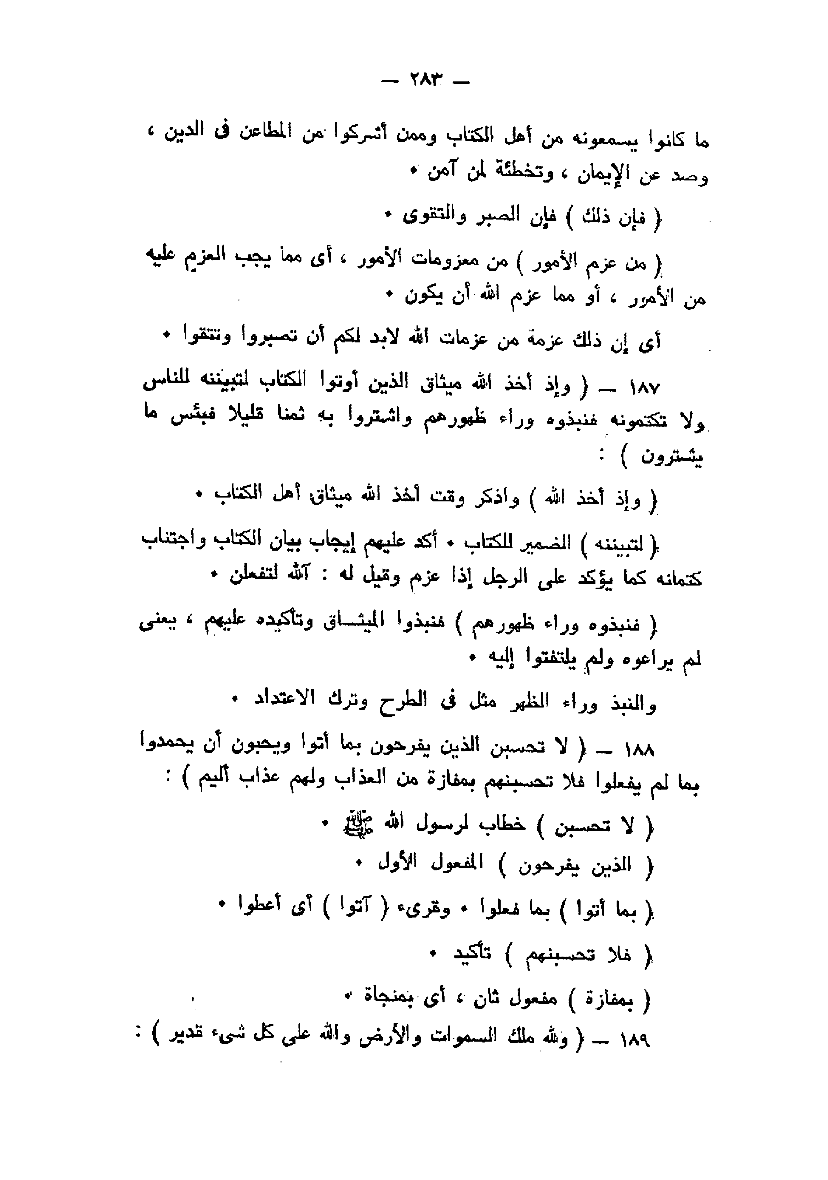 وَإِذْ أَخَذَ اللَّهُ مِيثاقَ الَّذِينَ أُوتُوا الْكِتابَ لَتُبَيِّنُنَّهُ لِلنَّاسِ وَلا تَكْتُمُونَهُ فَنَبَذُوهُ وَراءَ ظُهُورِهِمْ وَاشْتَرَوْا بِهِ ثَمَناً قَلِيلاً فَبِئْسَ ما يَشْتَرُونَ (187) لا تَحْسَبَنَّ الَّذِينَ يَفْرَحُونَ بِما أَتَوْا وَيُحِبُّونَ أَنْ يُحْمَدُوا بِما لَمْ يَفْعَلُوا فَلا تَحْسَبَنَّهُمْ بِمَفازَةٍ مِنَ الْعَذابِ وَلَهُمْ عَذابٌ أَلِيمٌ (188) وَلِلَّهِ مُلْكُ السَّماواتِ وَالْأَرْضِ وَاللَّهُ عَلى كُلِّ شَيْءٍ قَدِيرٌ (189)