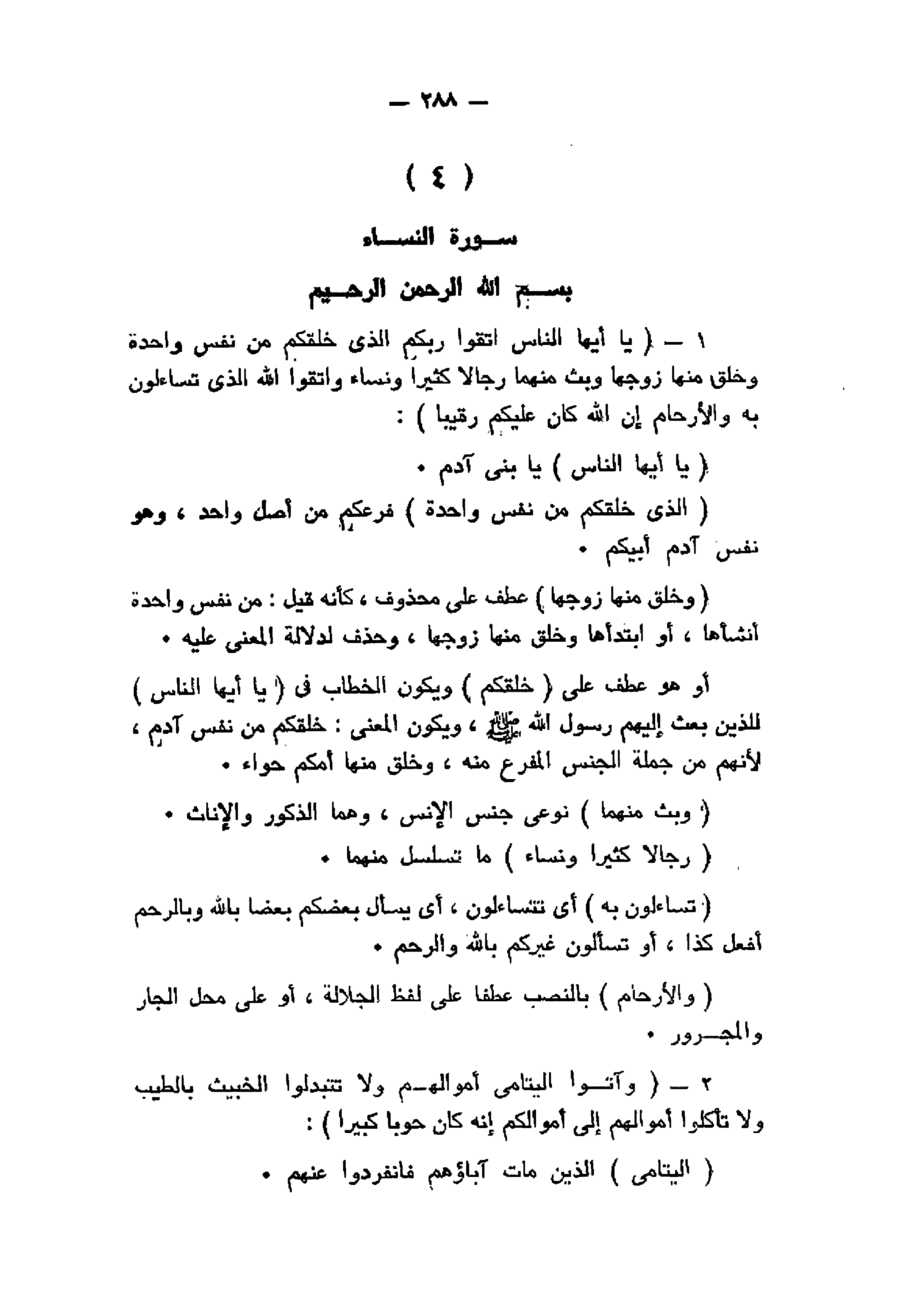 يا أَيُّهَا النَّاسُ اتَّقُوا رَبَّكُمُ الَّذِي خَلَقَكُمْ مِنْ نَفْسٍ واحِدَةٍ وَخَلَقَ مِنْها زَوْجَها وَبَثَّ مِنْهُما رِجالاً كَثِيراً وَنِساءً وَاتَّقُوا اللَّهَ الَّذِي تَسائَلُونَ بِهِ وَالْأَرْحامَ إِنَّ اللَّهَ كانَ عَلَيْكُمْ رَقِيباً (1) وَآتُوا الْيَتامى أَمْوالَهُمْ وَلا تَتَبَدَّلُوا الْخَبِيثَ بِالطَّيِّبِ وَلا تَأْكُلُوا أَمْوالَهُمْ إِلى أَمْوالِكُمْ إِنَّهُ كانَ حُوباً كَبِيراً (2)