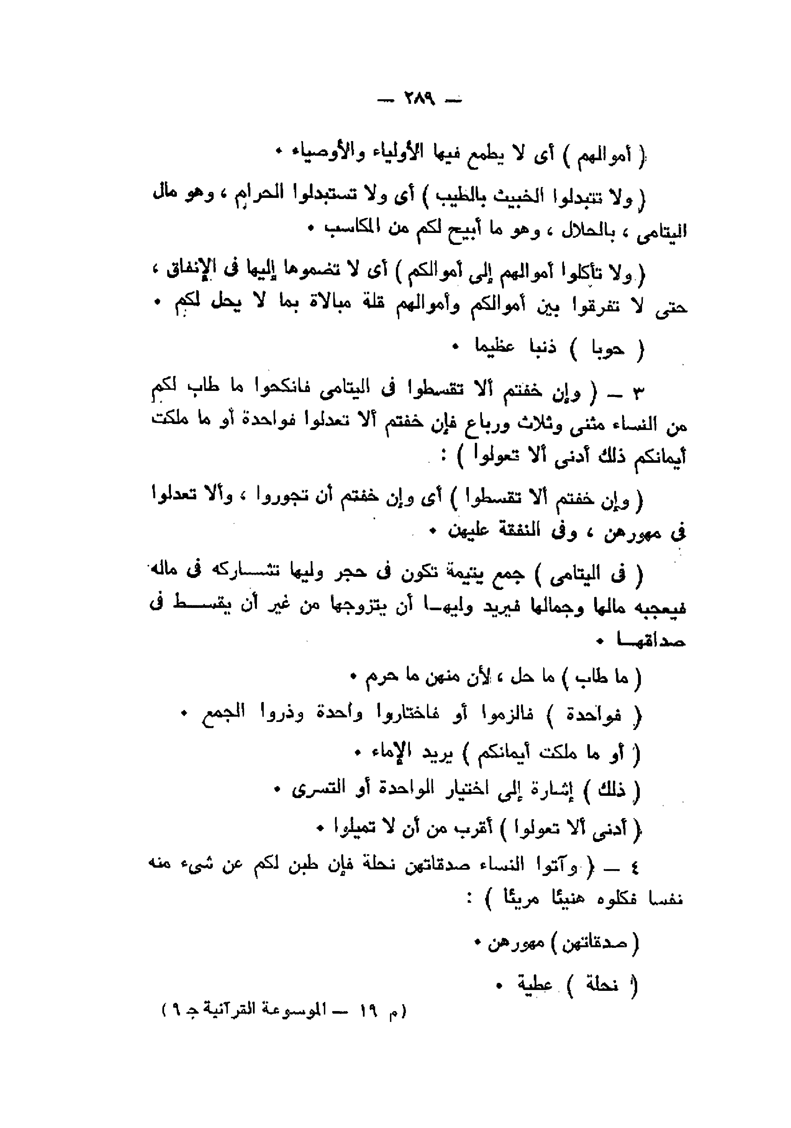 وَإِنْ خِفْتُمْ أَلاَّ تُقْسِطُوا فِي الْيَتامى فَانْكِحُوا ما طابَ لَكُمْ مِنَ النِّساءِ مَثْنى وَثُلاثَ وَرُباعَ فَإِنْ خِفْتُمْ أَلاَّ تَعْدِلُوا فَواحِدَةً أَوْ ما مَلَكَتْ أَيْمانُكُمْ ذلِكَ أَدْنى أَلاَّ تَعُولُوا (3) وَآتُوا النِّساءَ صَدُقاتِهِنَّ نِحْلَةً فَإِنْ طِبْنَ لَكُمْ عَنْ شَيْءٍ مِنْهُ نَفْساً فَكُلُوهُ هَنِيئاً مَرِيئاً (4)