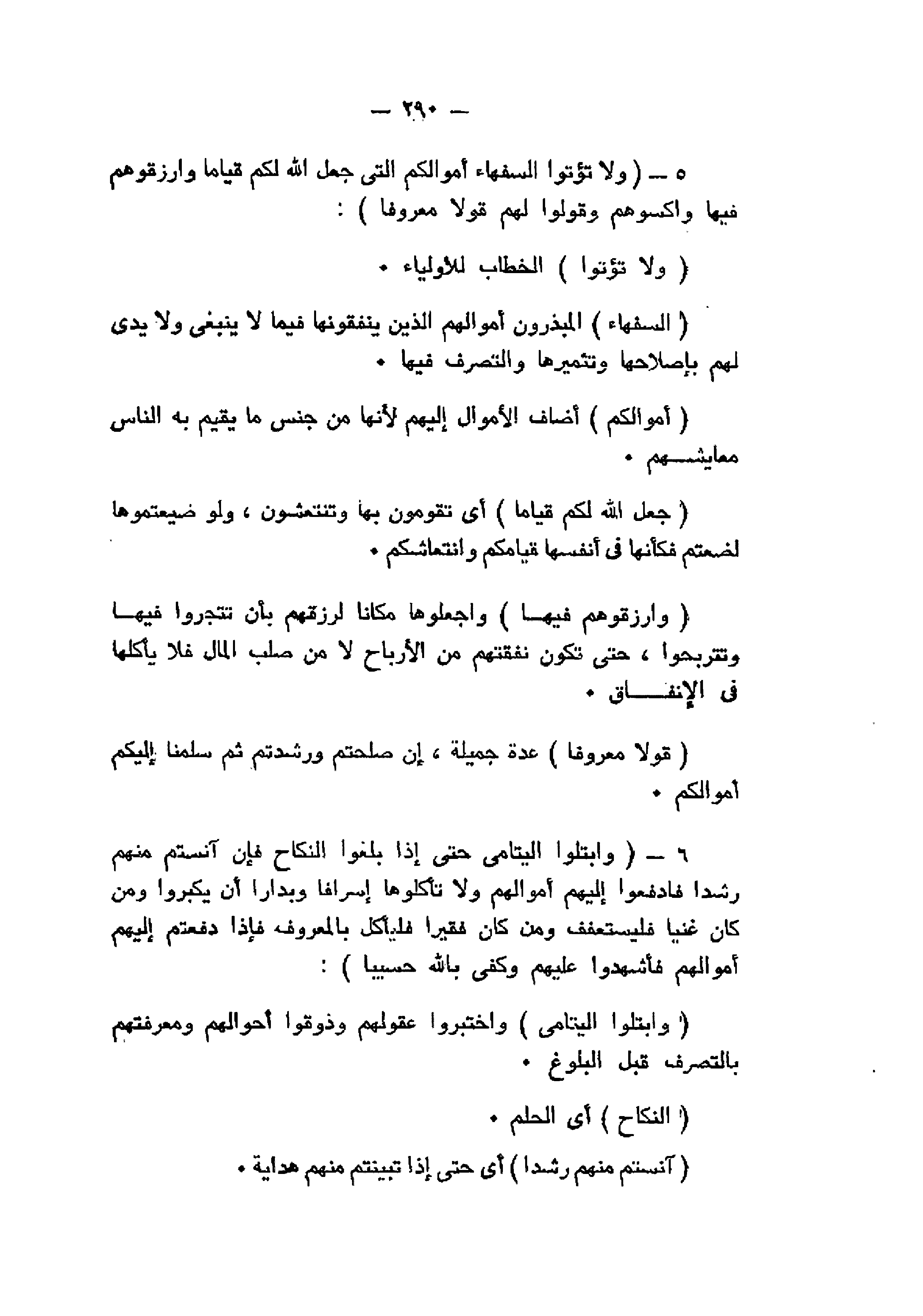 وَلا تُؤْتُوا السُّفَهاءَ أَمْوالَكُمُ الَّتِي جَعَلَ اللَّهُ لَكُمْ قِياماً وَارْزُقُوهُمْ فِيها وَاكْسُوهُمْ وَقُولُوا لَهُمْ قَوْلاً مَعْرُوفاً (5) وَابْتَلُوا الْيَتامى حَتَّى إِذا بَلَغُوا النِّكاحَ فَإِنْ آنَسْتُمْ مِنْهُمْ رُشْداً فَادْفَعُوا إِلَيْهِمْ أَمْوالَهُمْ وَلا تَأْكُلُوها إِسْرافاً وَبِداراً أَنْ يَكْبَرُوا وَمَنْ كانَ غَنِيًّا فَلْيَسْتَعْفِفْ وَمَنْ كانَ فَقِيراً فَلْيَأْكُلْ بِالْمَعْرُوفِ فَإِذا دَفَعْتُمْ إِلَيْهِمْ أَمْوالَهُمْ فَأَشْهِدُوا عَلَيْهِمْ وَكَفى بِاللَّهِ حَسِيباً (6)
