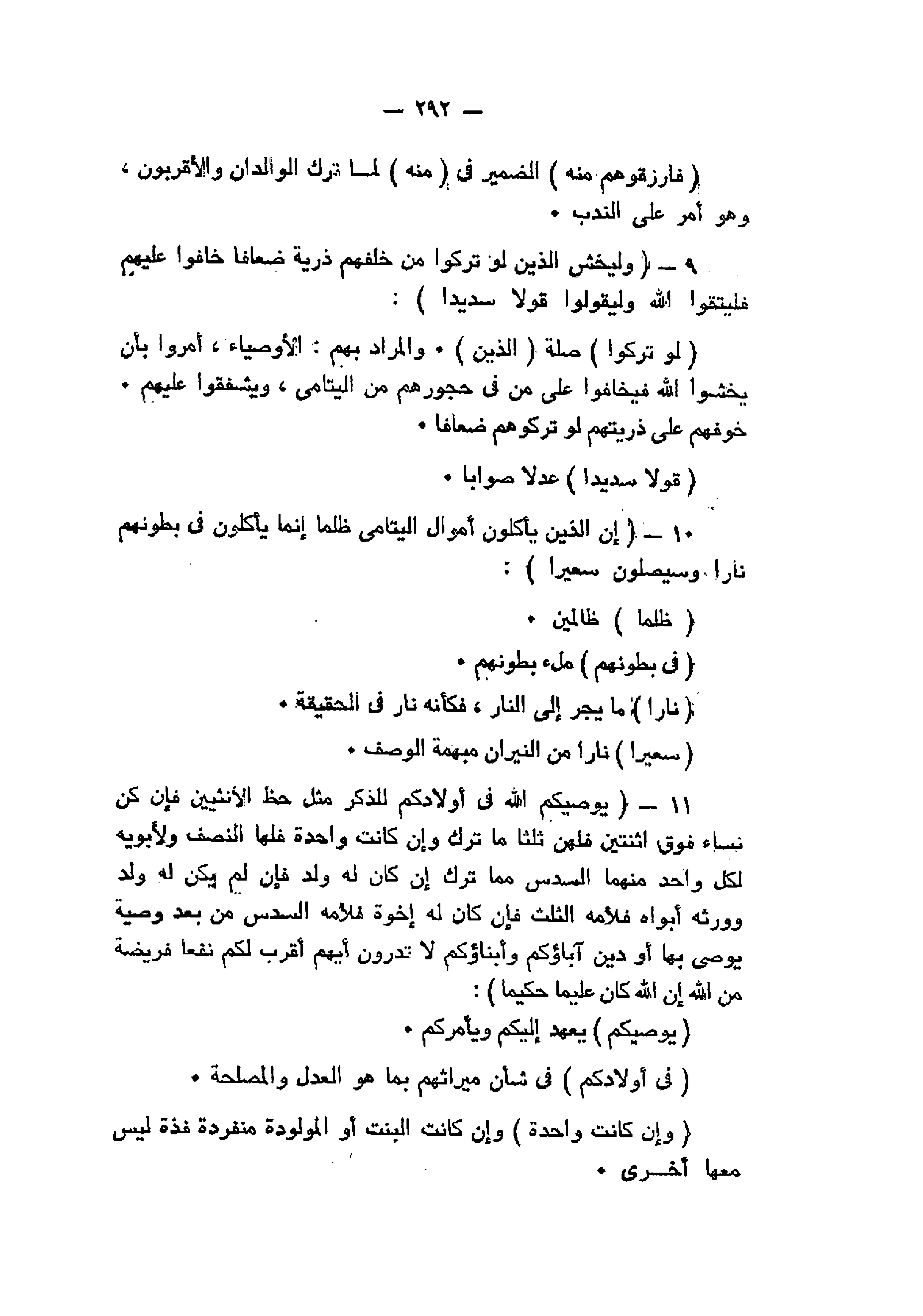 إِنَّ الَّذِينَ يَأْكُلُونَ أَمْوالَ الْيَتامى ظُلْماً إِنَّما يَأْكُلُونَ فِي بُطُونِهِمْ ناراً وَسَيَصْلَوْنَ سَعِيراً (10) يُوصِيكُمُ اللَّهُ فِي أَوْلادِكُمْ لِلذَّكَرِ مِثْلُ حَظِّ الْأُنْثَيَيْنِ فَإِنْ كُنَّ نِساءً فَوْقَ اثْنَتَيْنِ فَلَهُنَّ ثُلُثا ما تَرَكَ وَإِنْ كانَتْ واحِدَةً فَلَهَا النِّصْفُ وَلِأَبَوَيْهِ لِكُلِّ واحِدٍ مِنْهُمَا السُّدُسُ مِمَّا تَرَكَ إِنْ كانَ لَهُ وَلَدٌ فَإِنْ لَمْ يَكُنْ لَهُ وَلَدٌ وَوَرِثَهُ أَبَواهُ فَلِأُمِّهِ الثُّلُثُ فَإِنْ كانَ لَهُ إِخْوَةٌ فَلِأُمِّهِ السُّدُسُ مِنْ بَعْدِ وَصِيَّةٍ يُوصِي بِها أَوْ دَيْنٍ آباؤُكُمْ وَأَبْناؤُكُمْ لا تَدْرُونَ أَيُّهُمْ أَقْرَبُ لَكُمْ نَفْعاً فَرِيضَةً مِنَ اللَّهِ إِنَّ اللَّهَ كانَ عَلِيماً حَكِيماً (11)