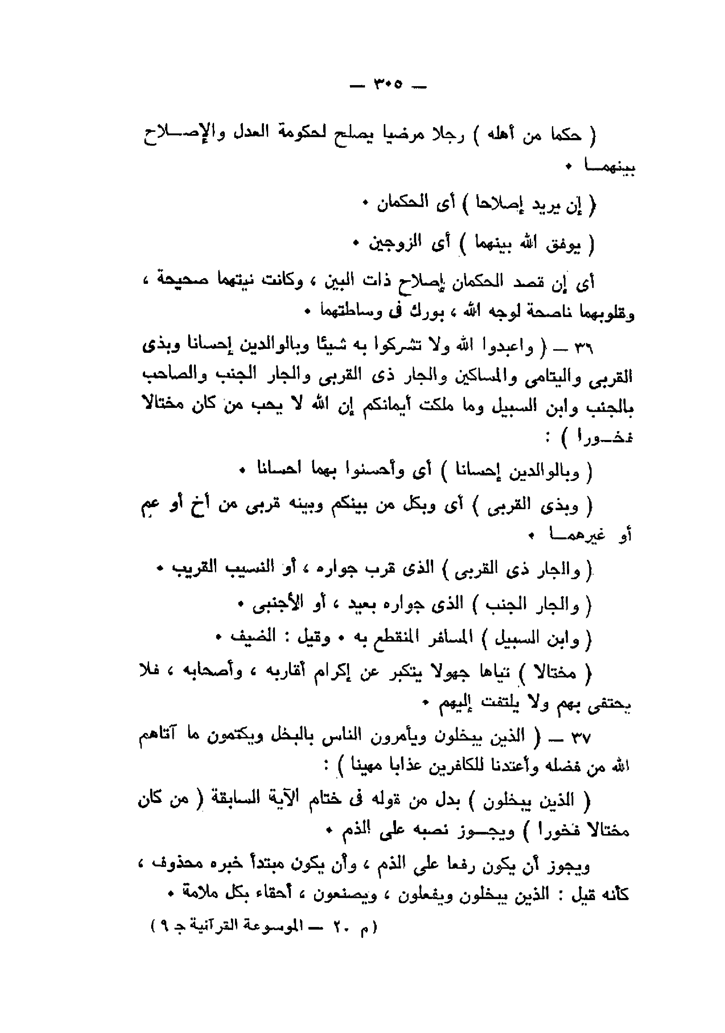 وَاعْبُدُوا اللَّهَ وَلا تُشْرِكُوا بِهِ شَيْئاً وَبِالْوالِدَيْنِ إِحْساناً وَبِذِي الْقُرْبى وَالْيَتامى وَالْمَساكِينِ وَالْجارِ ذِي الْقُرْبى وَالْجارِ الْجُنُبِ وَالصَّاحِبِ بِالْجَنْبِ وَابْنِ السَّبِيلِ وَما مَلَكَتْ أَيْمانُكُمْ إِنَّ اللَّهَ لا يُحِبُّ مَنْ كانَ مُخْتالاً فَخُوراً (36) الَّذِينَ يَبْخَلُونَ وَيَأْمُرُونَ النَّاسَ بِالْبُخْلِ وَيَكْتُمُونَ ما آتاهُمُ اللَّهُ مِنْ فَضْلِهِ وَأَعْتَدْنا لِلْكافِرِينَ عَذاباً مُهِيناً (37)
