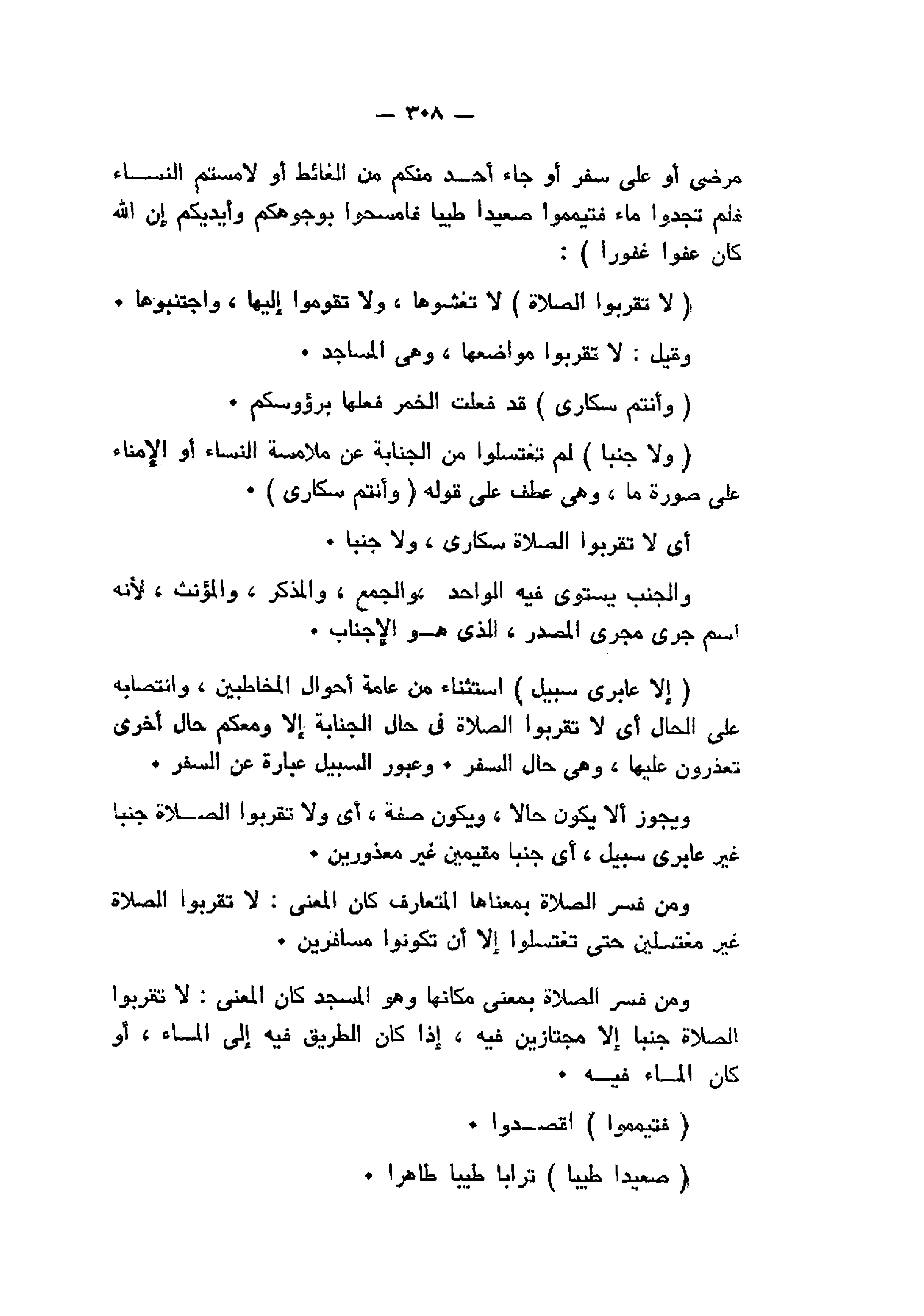 ومن فسر الصلاة بمعنى مكانها وهو المسجد كان المعنى: لا تقربوا الصلاة جنبا إلا مجتازين فيه، إذا كان الطريق فيه إلى الماء، أو كان الماء فيه.