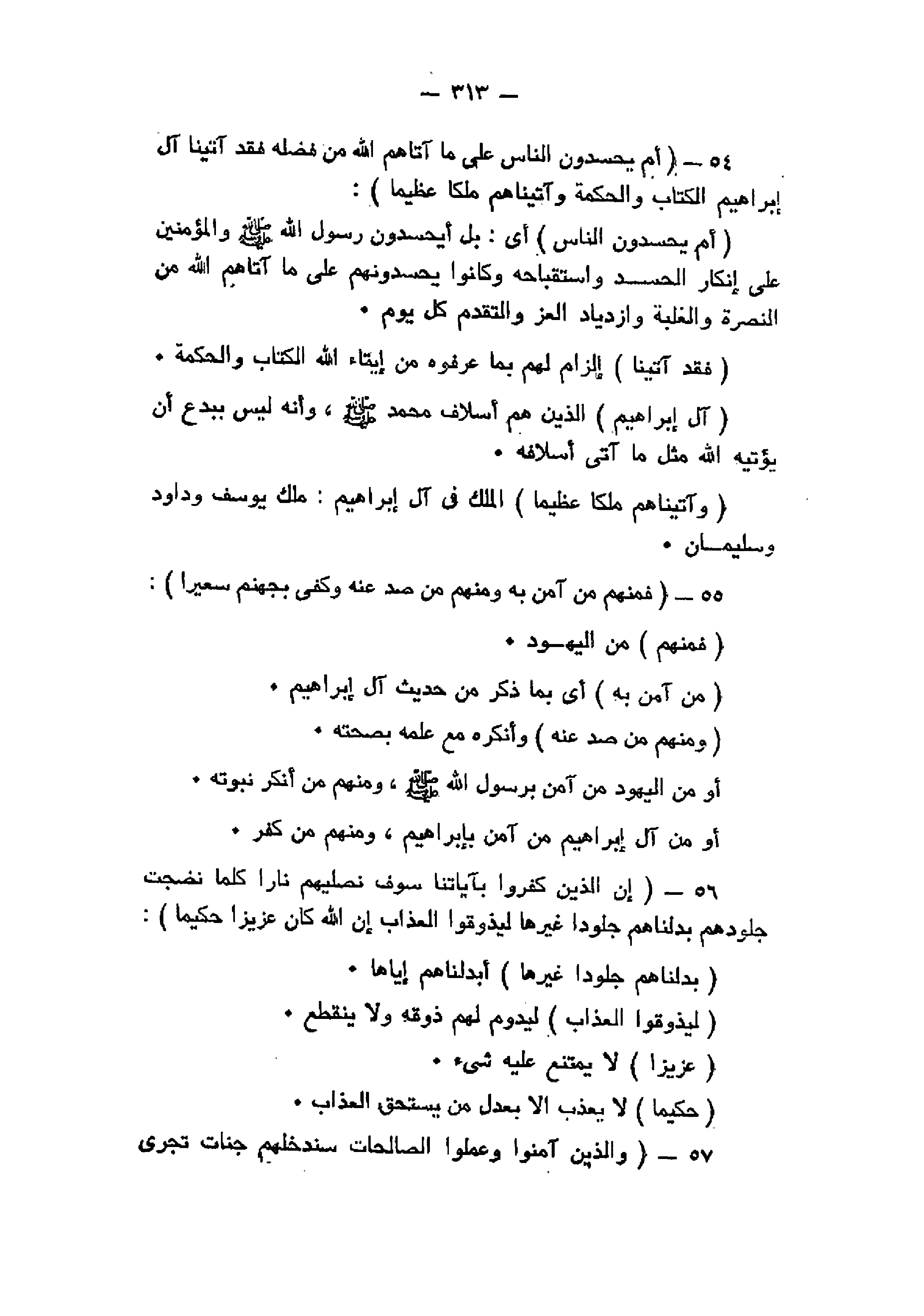 أَمْ يَحْسُدُونَ النَّاسَ عَلى ما آتاهُمُ اللَّهُ مِنْ فَضْلِهِ فَقَدْ آتَيْنا آلَ إِبْراهِيمَ الْكِتابَ وَالْحِكْمَةَ وَآتَيْناهُمْ مُلْكاً عَظِيماً (54) فَمِنْهُمْ مَنْ آمَنَ بِهِ وَمِنْهُمْ مَنْ صَدَّ عَنْهُ وَكَفى بِجَهَنَّمَ سَعِيراً (55) إِنَّ الَّذِينَ كَفَرُوا بِآياتِنا سَوْفَ نُصْلِيهِمْ ناراً كُلَّما نَضِجَتْ جُلُودُهُمْ بَدَّلْناهُمْ جُلُوداً غَيْرَها لِيَذُوقُوا الْعَذابَ إِنَّ اللَّهَ كانَ عَزِيزاً حَكِيماً (56) وَالَّذِينَ آمَنُوا وَعَمِلُوا الصَّالِحاتِ سَنُدْخِلُهُمْ جَنَّاتٍ تَجْرِي مِنْ تَحْتِهَا الْأَنْهارُ خالِدِينَ فِيها أَبَداً لَهُمْ فِيها أَزْواجٌ مُطَهَّرَةٌ وَنُدْخِلُهُمْ ظِلاًّ ظَلِيلاً (57)