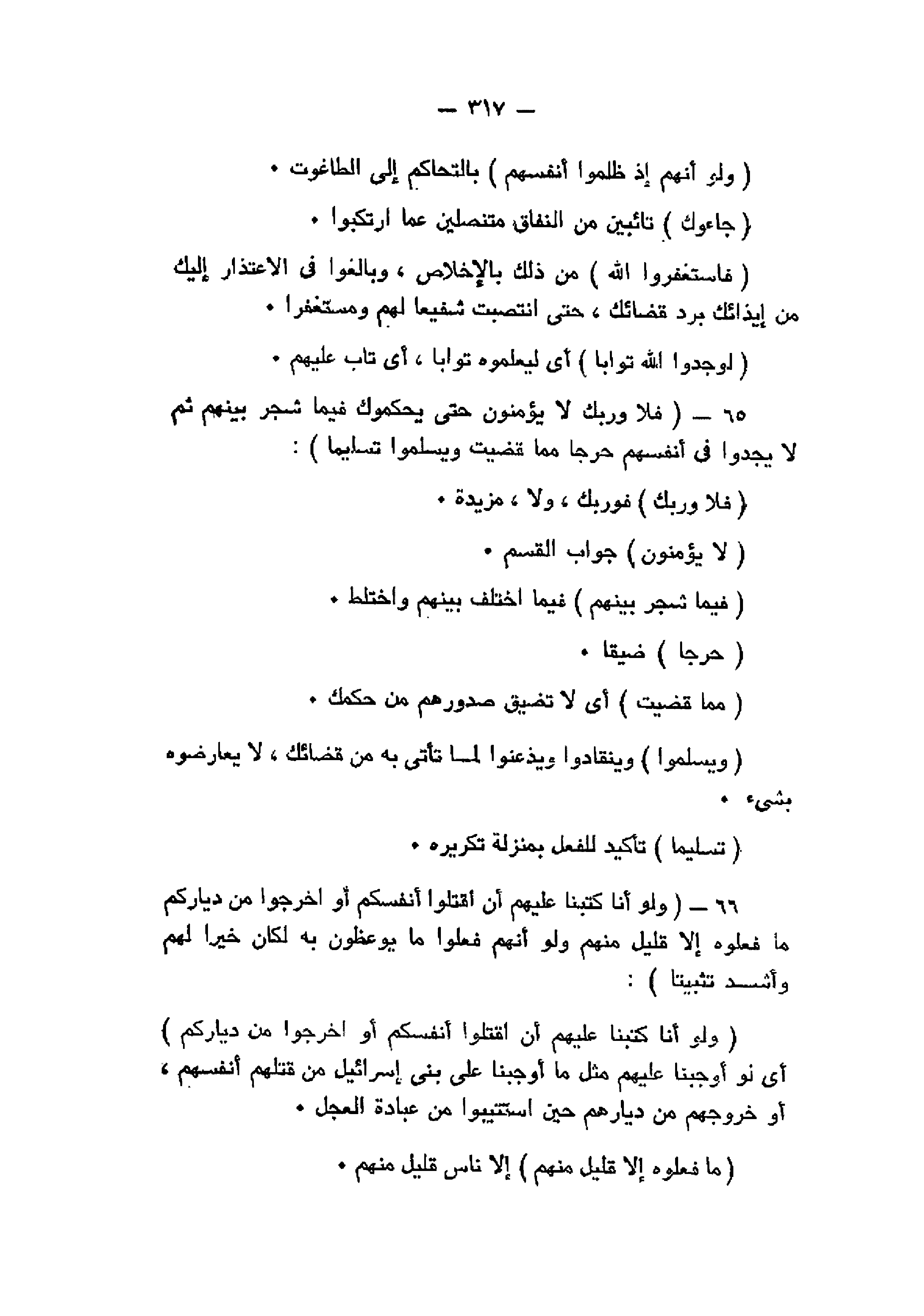 فَلا وَرَبِّكَ لا يُؤْمِنُونَ حَتَّى يُحَكِّمُوكَ فِيما شَجَرَ بَيْنَهُمْ ثُمَّ لا يَجِدُوا فِي أَنْفُسِهِمْ حَرَجاً مِمَّا قَضَيْتَ وَيُسَلِّمُوا تَسْلِيماً (65) وَلَوْ أَنَّا كَتَبْنا عَلَيْهِمْ أَنِ اقْتُلُوا أَنْفُسَكُمْ أَوِ اخْرُجُوا مِنْ دِيارِكُمْ ما فَعَلُوهُ إِلاَّ قَلِيلٌ مِنْهُمْ وَلَوْ أَنَّهُمْ فَعَلُوا ما يُوعَظُونَ بِهِ لَكانَ خَيْراً لَهُمْ وَأَشَدَّ تَثْبِيتاً (66)