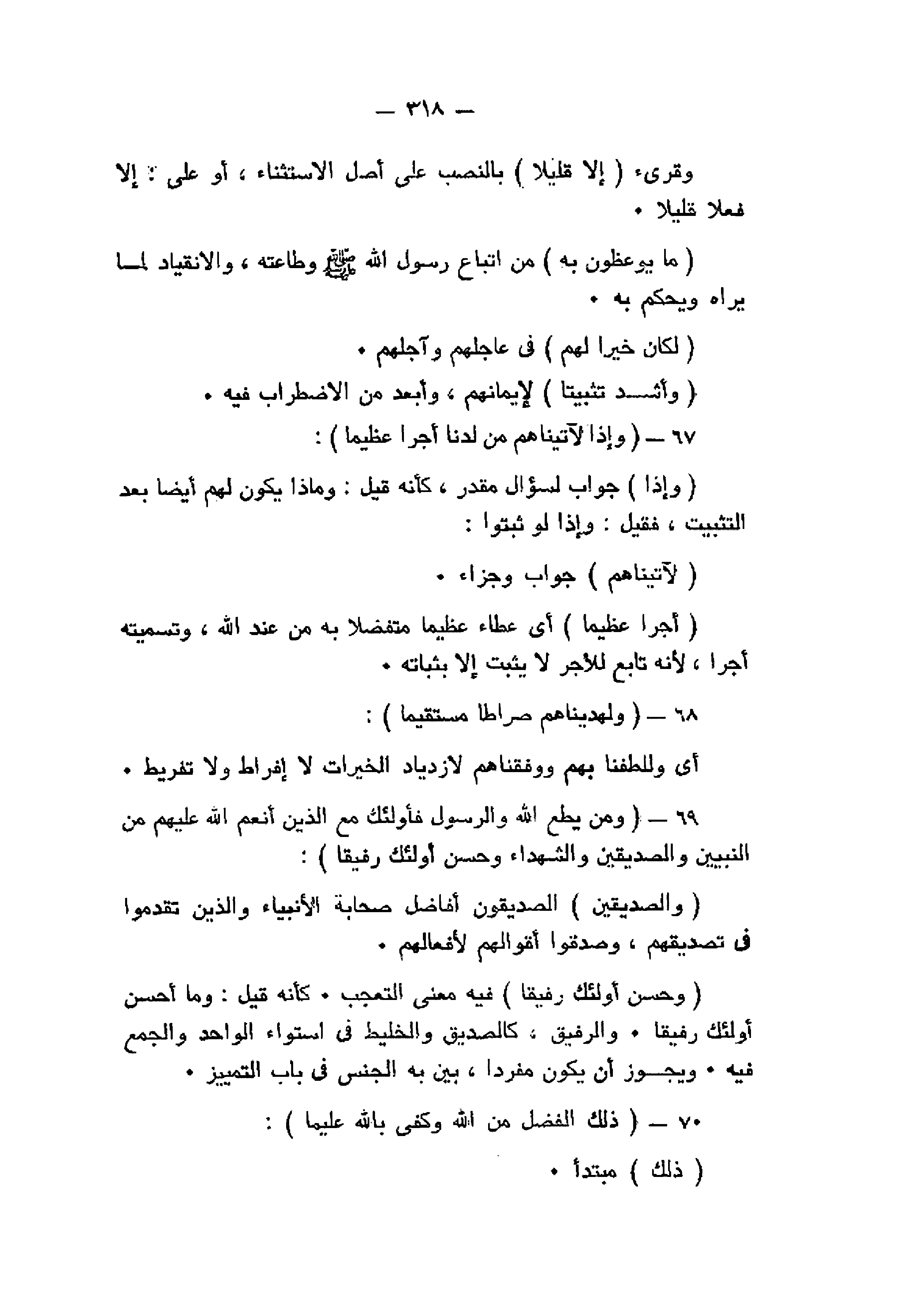 وَإِذاً لَآتَيْناهُمْ مِنْ لَدُنَّا أَجْراً عَظِيماً (67) وَلَهَدَيْناهُمْ صِراطاً مُسْتَقِيماً (68) وَمَنْ يُطِعِ اللَّهَ وَالرَّسُولَ فَأُولئِكَ مَعَ الَّذِينَ أَنْعَمَ اللَّهُ عَلَيْهِمْ مِنَ النَّبِيِّينَ وَالصِّدِّيقِينَ وَالشُّهَداءِ وَالصَّالِحِينَ وَحَسُنَ أُولئِكَ رَفِيقاً (69) ذلِكَ الْفَضْلُ مِنَ اللَّهِ وَكَفى بِاللَّهِ عَلِيماً (70)