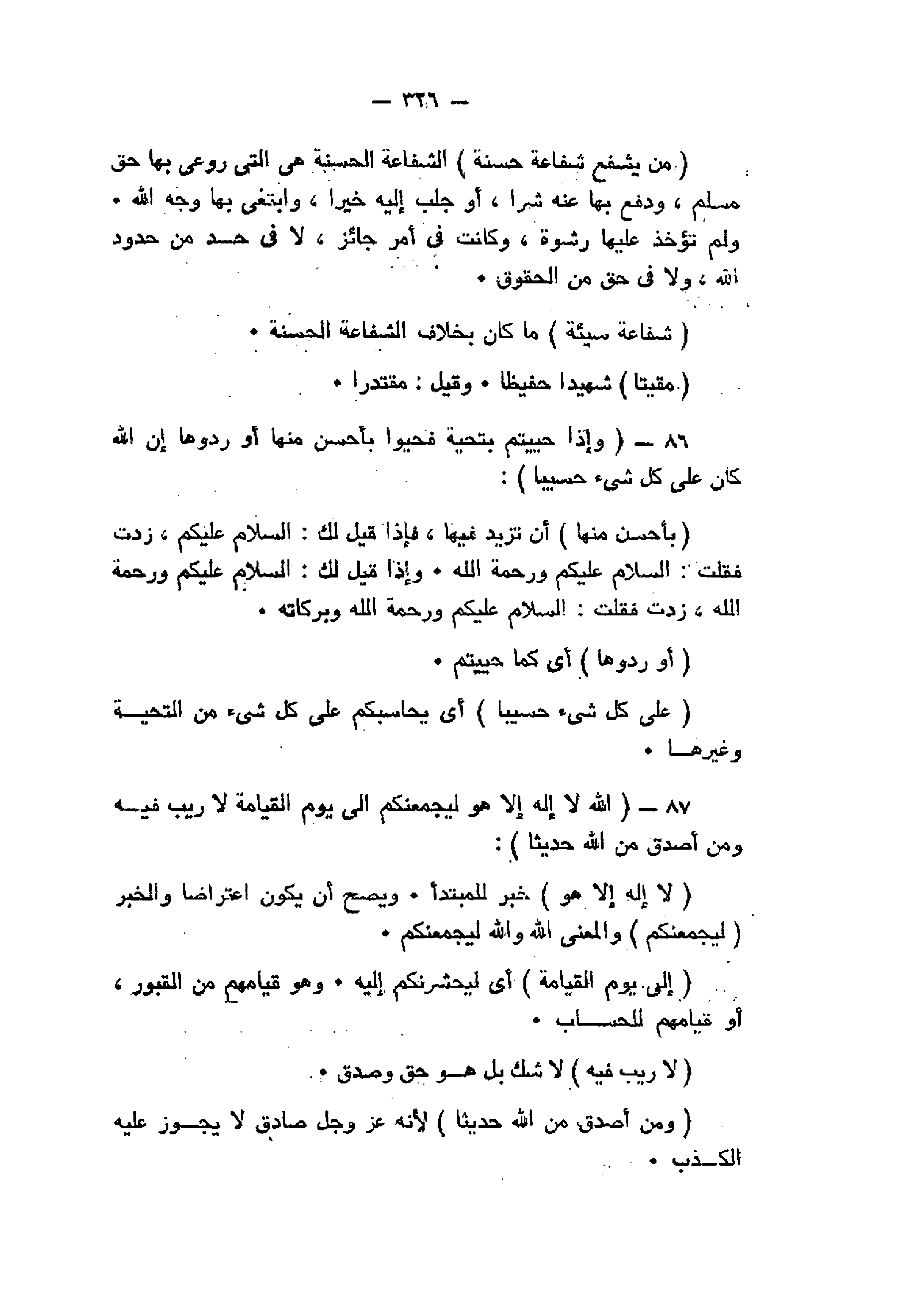 وَإِذا حُيِّيتُمْ بِتَحِيَّةٍ فَحَيُّوا بِأَحْسَنَ مِنْها أَوْ رُدُّوها إِنَّ اللَّهَ كانَ عَلى كُلِّ شَيْءٍ حَسِيباً (86) اللَّهُ لا إِلهَ إِلاَّ هُوَ لَيَجْمَعَنَّكُمْ إِلى يَوْمِ الْقِيامَةِ لا رَيْبَ فِيهِ وَمَنْ أَصْدَقُ مِنَ اللَّهِ حَدِيثاً (87)
