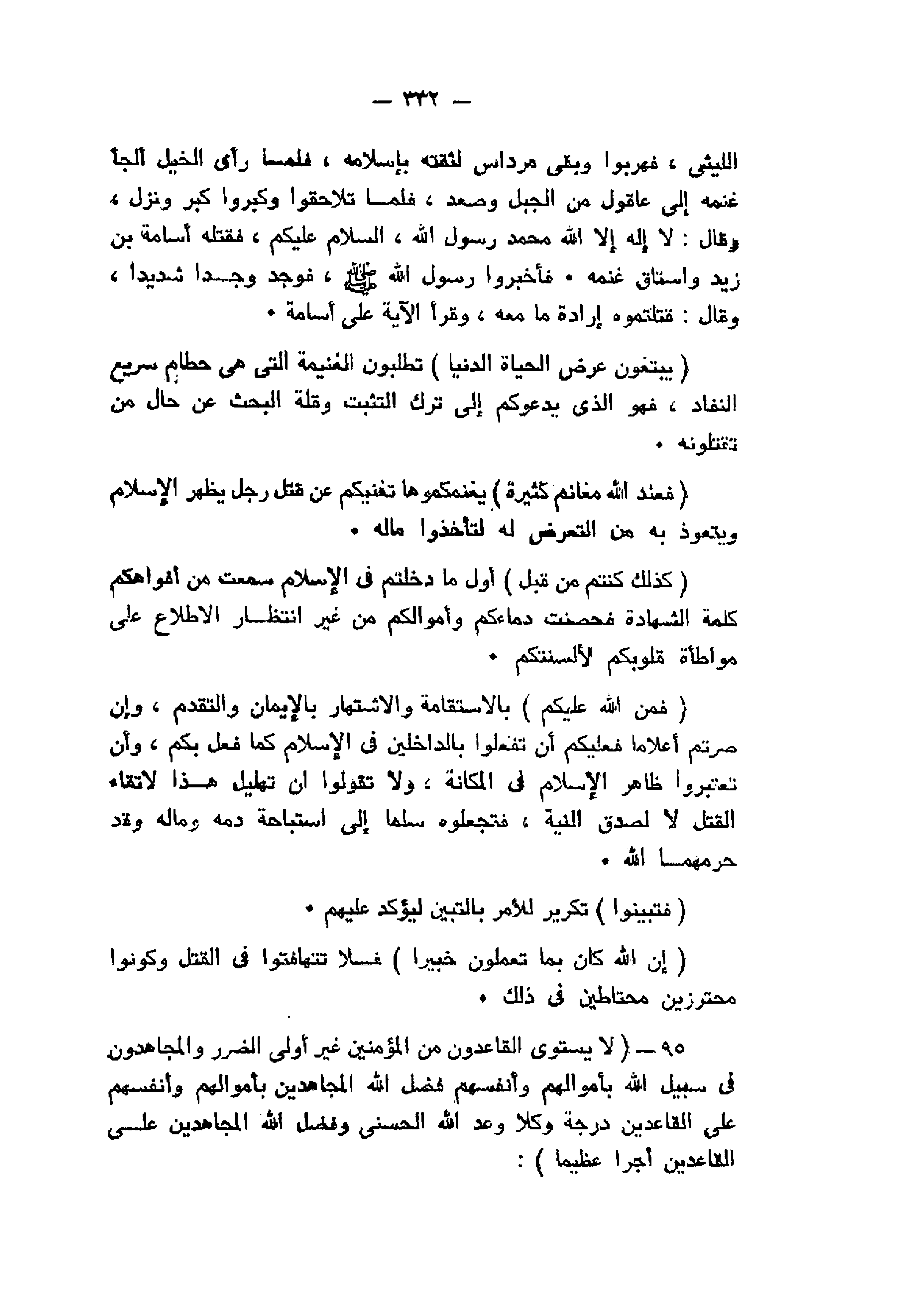 فأخبروا رسول الله صلّى الله عليه وآله وسلم، فوجد وجدا شديدا، وقال: قتلتموه إرادة ما معه، وقرأ الآية على أسامة.