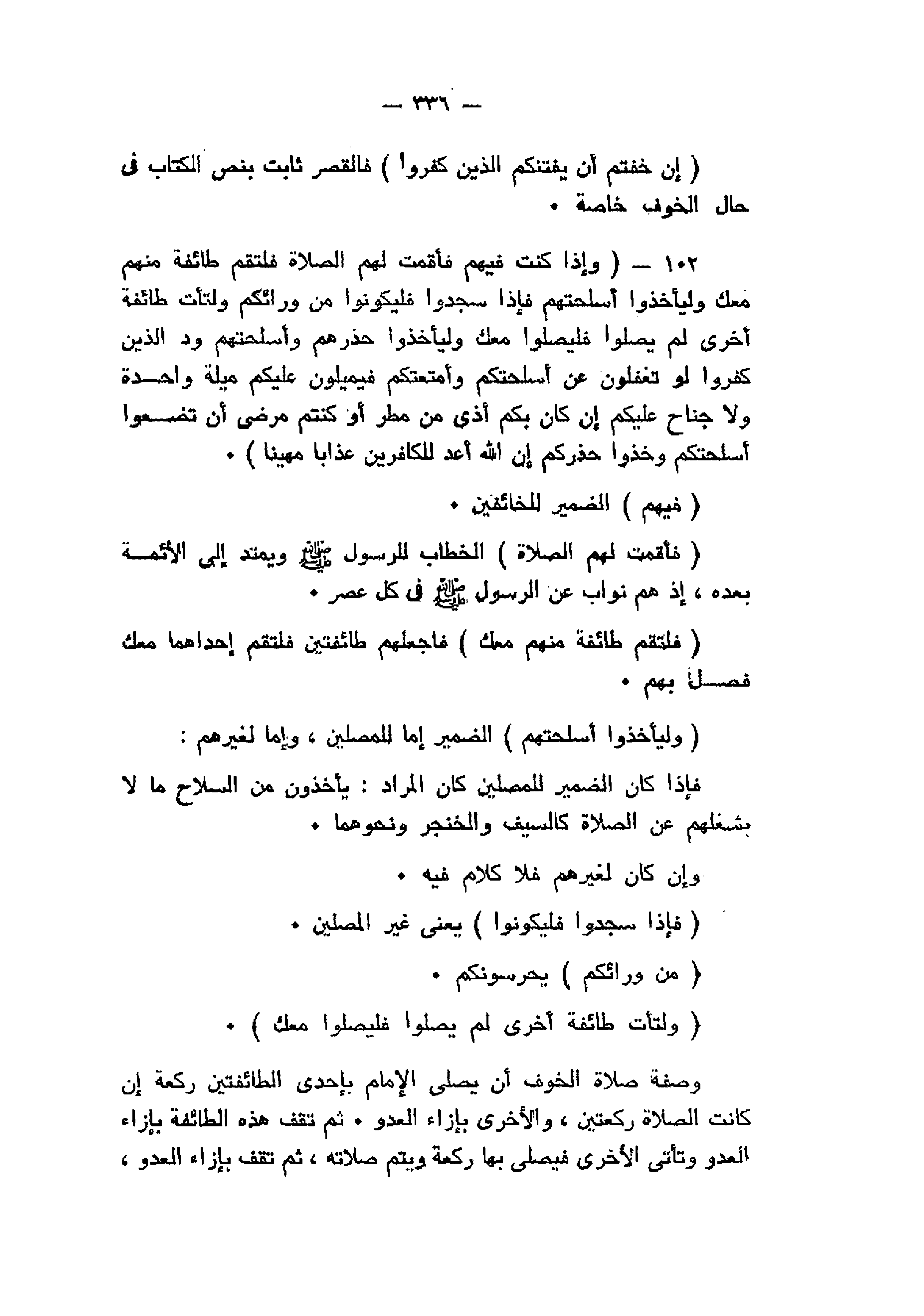 وَإِذا كُنْتَ فِيهِمْ فَأَقَمْتَ لَهُمُ الصَّلاةَ فَلْتَقُمْ طائِفَةٌ مِنْهُمْ مَعَكَ وَلْيَأْخُذُوا أَسْلِحَتَهُمْ فَإِذا سَجَدُوا فَلْيَكُونُوا مِنْ وَرائِكُمْ وَلْتَأْتِ طائِفَةٌ أُخْرى لَمْ يُصَلُّوا فَلْيُصَلُّوا مَعَكَ وَلْيَأْخُذُوا حِذْرَهُمْ وَأَسْلِحَتَهُمْ وَدَّ الَّذِينَ كَفَرُوا لَوْ تَغْفُلُونَ عَنْ أَسْلِحَتِكُمْ وَأَمْتِعَتِكُمْ فَيَمِيلُونَ عَلَيْكُمْ مَيْلَةً واحِدَةً وَلا جُناحَ عَلَيْكُمْ إِنْ كانَ بِكُمْ أَذىً مِنْ مَطَرٍ أَوْ كُنْتُمْ مَرْضى أَنْ تَضَعُوا أَسْلِحَتَكُمْ وَخُذُوا حِذْرَكُمْ إِنَّ اللَّهَ أَعَدَّ لِلْكافِرِينَ عَذاباً مُهِيناً (102)
