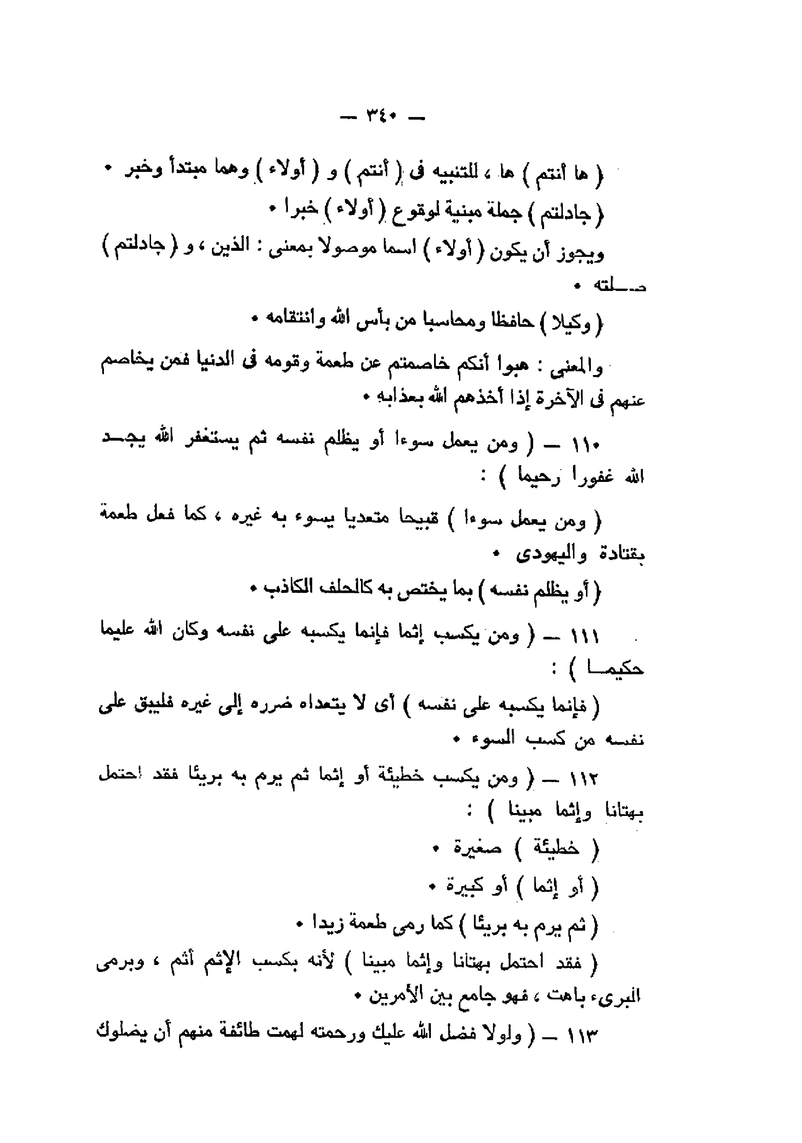 وَمَنْ يَعْمَلْ سُوءاً أَوْ يَظْلِمْ نَفْسَهُ ثُمَّ يَسْتَغْفِرِ اللَّهَ يَجِدِ اللَّهَ غَفُوراً رَحِيماً (110) وَمَنْ يَكْسِبْ إِثْماً فَإِنَّما يَكْسِبُهُ عَلى نَفْسِهِ وَكانَ اللَّهُ عَلِيماً حَكِيماً (111) وَمَنْ يَكْسِبْ خَطِيئَةً أَوْ إِثْماً ثُمَّ يَرْمِ بِهِ بَرِيئاً فَقَدِ احْتَمَلَ بُهْتاناً وَإِثْماً مُبِيناً (112) وَلَوْلا فَضْلُ اللَّهِ عَلَيْكَ وَرَحْمَتُهُ لَهَمَّتْ طائِفَةٌ مِنْهُمْ أَنْ يُضِلُّوكَ وَما يُضِلُّونَ إِلاَّ أَنْفُسَهُمْ وَما يَضُرُّونَكَ مِنْ شَيْءٍ وَأَنْزَلَ اللَّهُ عَلَيْكَ الْكِتابَ وَالْحِكْمَةَ وَعَلَّمَكَ ما لَمْ تَكُنْ تَعْلَمُ وَكانَ فَضْلُ اللَّهِ عَلَيْكَ عَظِيماً (113)