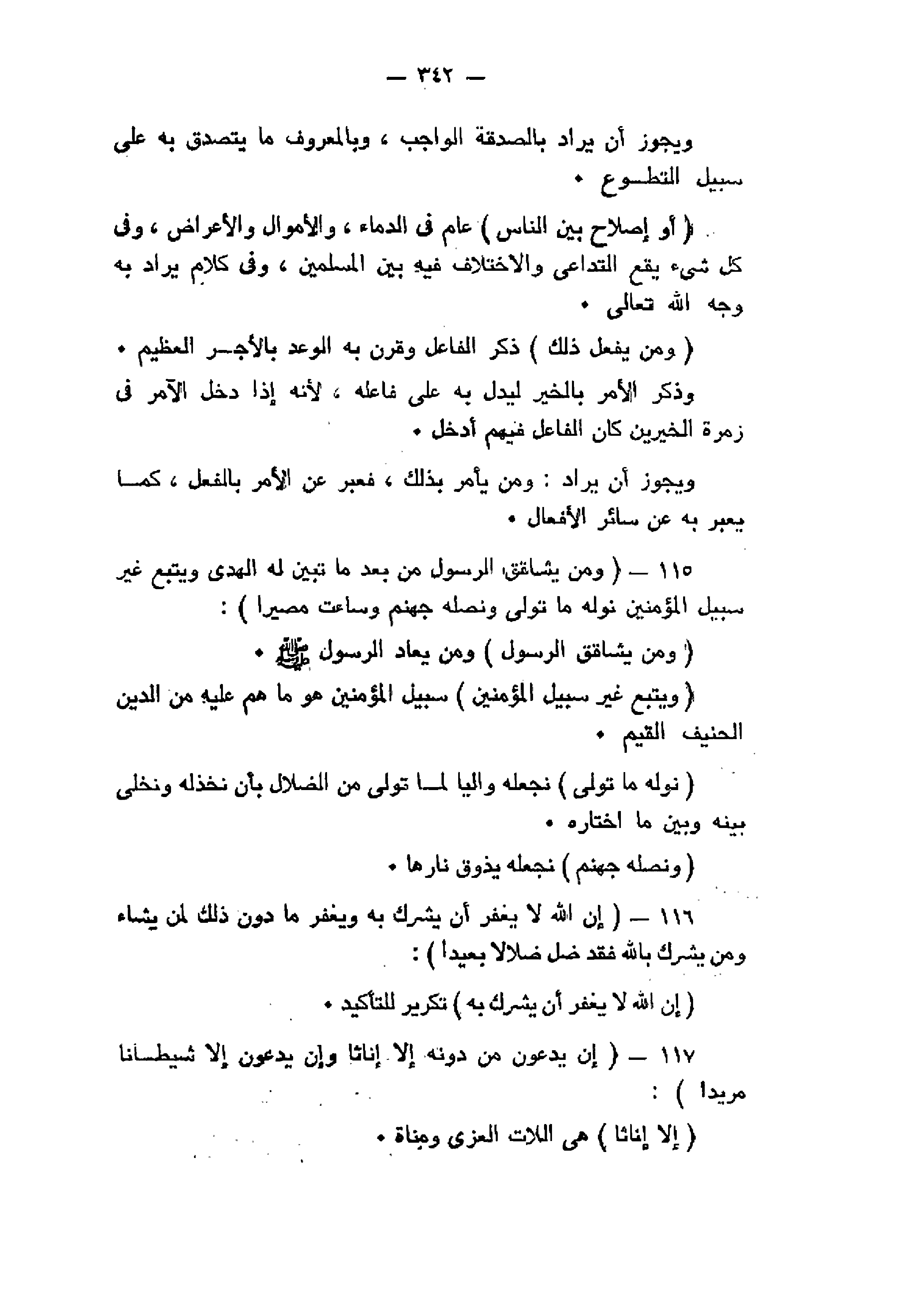 وَمَنْ يُشاقِقِ الرَّسُولَ مِنْ بَعْدِ ما تَبَيَّنَ لَهُ الْهُدى وَيَتَّبِعْ غَيْرَ سَبِيلِ الْمُؤْمِنِينَ نُوَلِّهِ ما تَوَلَّى وَنُصْلِهِ جَهَنَّمَ وَساءَتْ مَصِيراً (115) إِنَّ اللَّهَ لا يَغْفِرُ أَنْ يُشْرَكَ بِهِ وَيَغْفِرُ ما دُونَ ذلِكَ لِمَنْ يَشاءُ وَمَنْ يُشْرِكْ بِاللَّهِ فَقَدْ ضَلَّ ضَلالاً بَعِيداً (116) إِنْ يَدْعُونَ مِنْ دُونِهِ إِلاَّ إِناثاً وَإِنْ يَدْعُونَ إِلاَّ شَيْطاناً مَرِيداً (117)
