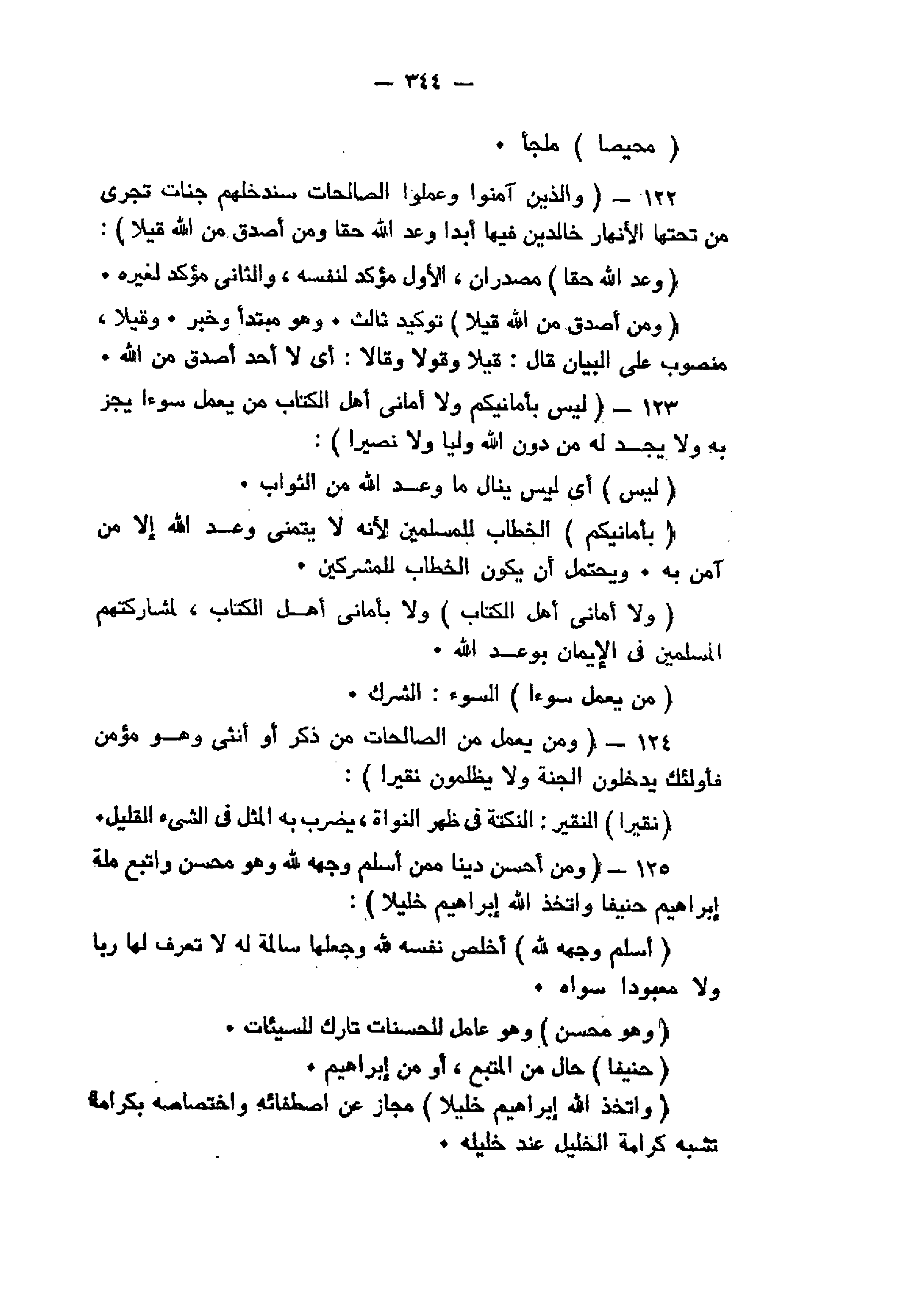 وَالَّذِينَ آمَنُوا وَعَمِلُوا الصَّالِحاتِ سَنُدْخِلُهُمْ جَنَّاتٍ تَجْرِي مِنْ تَحْتِهَا الْأَنْهارُ خالِدِينَ فِيها أَبَداً وَعْدَ اللَّهِ حَقًّا وَمَنْ أَصْدَقُ مِنَ اللَّهِ قِيلاً (122) لَيْسَ بِأَمانِيِّكُمْ وَلا أَمانِيِّ أَهْلِ الْكِتابِ مَنْ يَعْمَلْ سُوءاً يُجْزَ بِهِ وَلا يَجِدْ لَهُ مِنْ دُونِ اللَّهِ وَلِيًّا وَلا نَصِيراً (123) وَمَنْ يَعْمَلْ مِنَ الصَّالِحاتِ مِنْ ذَكَرٍ أَوْ أُنْثى وَهُوَ مُؤْمِنٌ فَأُولئِكَ يَدْخُلُونَ الْجَنَّةَ وَلا يُظْلَمُونَ نَقِيراً (124) وَمَنْ أَحْسَنُ دِيناً مِمَّنْ أَسْلَمَ وَجْهَهُ لِلَّهِ وَهُوَ مُحْسِنٌ وَاتَّبَعَ مِلَّةَ إِبْراهِيمَ حَنِيفاً وَاتَّخَذَ اللَّهُ إِبْراهِيمَ خَلِيلاً (125)