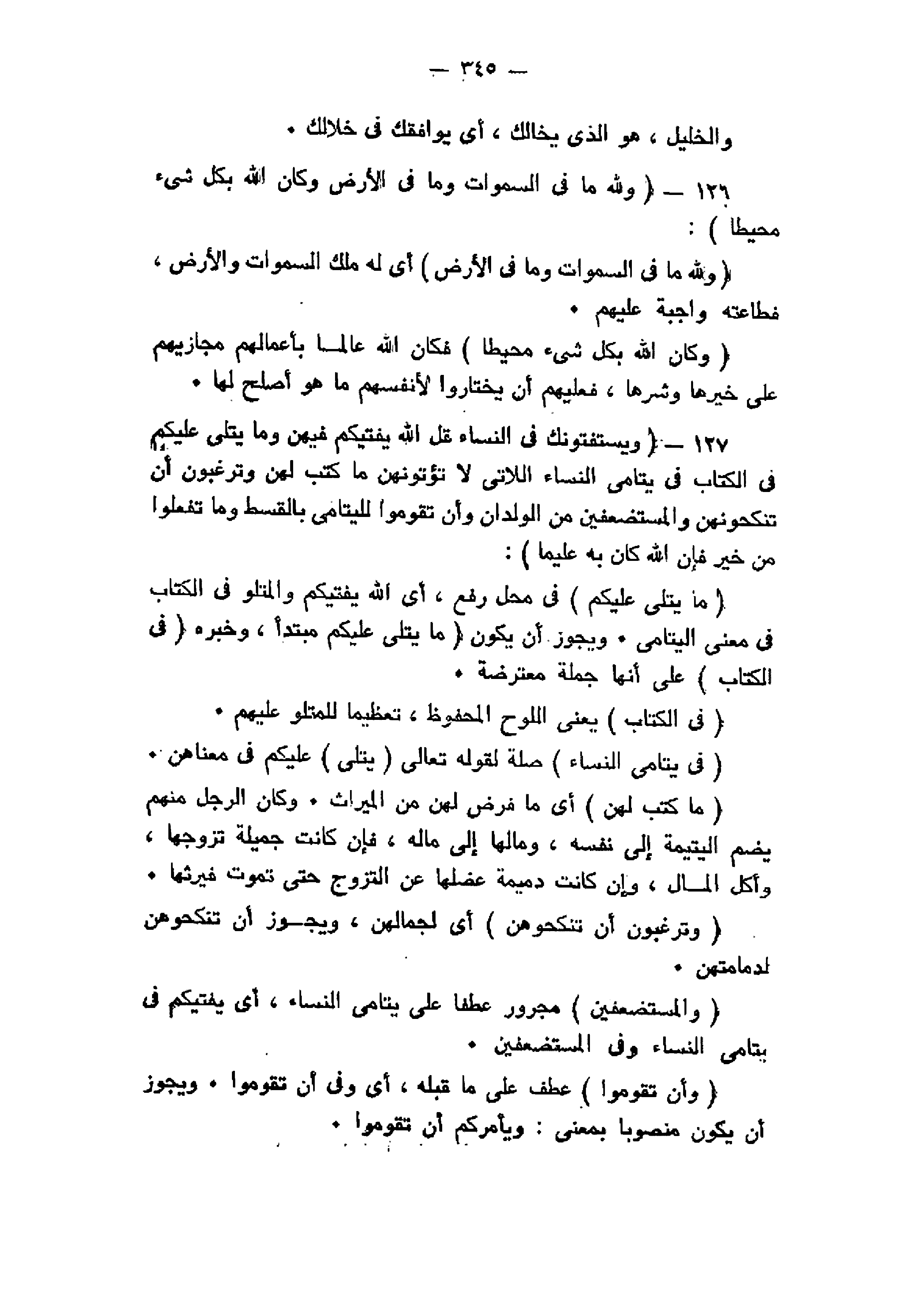 وَلِلَّهِ ما فِي السَّماواتِ وَما فِي الْأَرْضِ وَكانَ اللَّهُ بِكُلِّ شَيْءٍ مُحِيطاً (126) وَيَسْتَفْتُونَكَ فِي النِّساءِ قُلِ اللَّهُ يُفْتِيكُمْ فِيهِنَّ وَما يُتْلى عَلَيْكُمْ فِي الْكِتابِ فِي يَتامَى النِّساءِ اللاَّتِي لا تُؤْتُونَهُنَّ ما كُتِبَ لَهُنَّ وَتَرْغَبُونَ أَنْ تَنْكِحُوهُنَّ وَالْمُسْتَضْعَفِينَ مِنَ الْوِلْدانِ وَأَنْ تَقُومُوا لِلْيَتامى بِالْقِسْطِ وَما تَفْعَلُوا مِنْ خَيْرٍ فَإِنَّ اللَّهَ كانَ بِهِ عَلِيماً (127)
