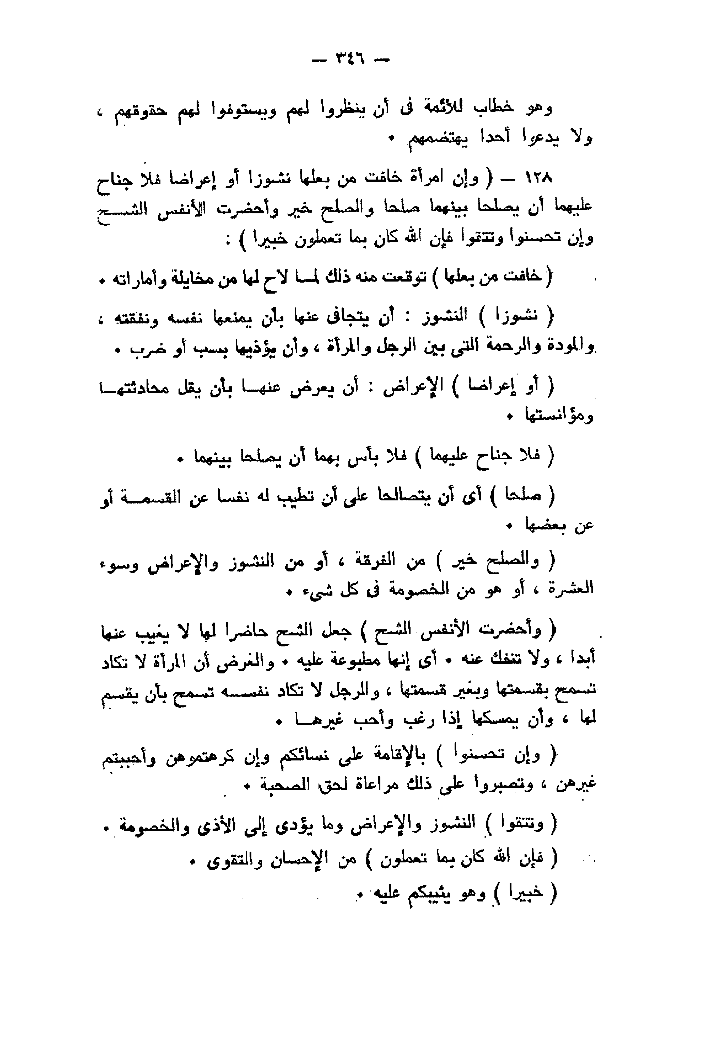 128- وَإِنِ امْرَأَةٌ خافَتْ مِنْ بَعْلِها نُشُوزاً أَوْ إِعْراضاً فَلا جُناحَ عَلَيْهِما أَنْ يُصْلِحا بَيْنَهُما صُلْحاً وَالصُّلْحُ خَيْرٌ وَأُحْضِرَتِ الْأَنْفُسُ الشُّحَّ وَإِنْ تُحْسِنُوا وَتَتَّقُوا فَإِنَّ اللَّهَ كانَ بِما تَعْمَلُونَ خَبِيراً: