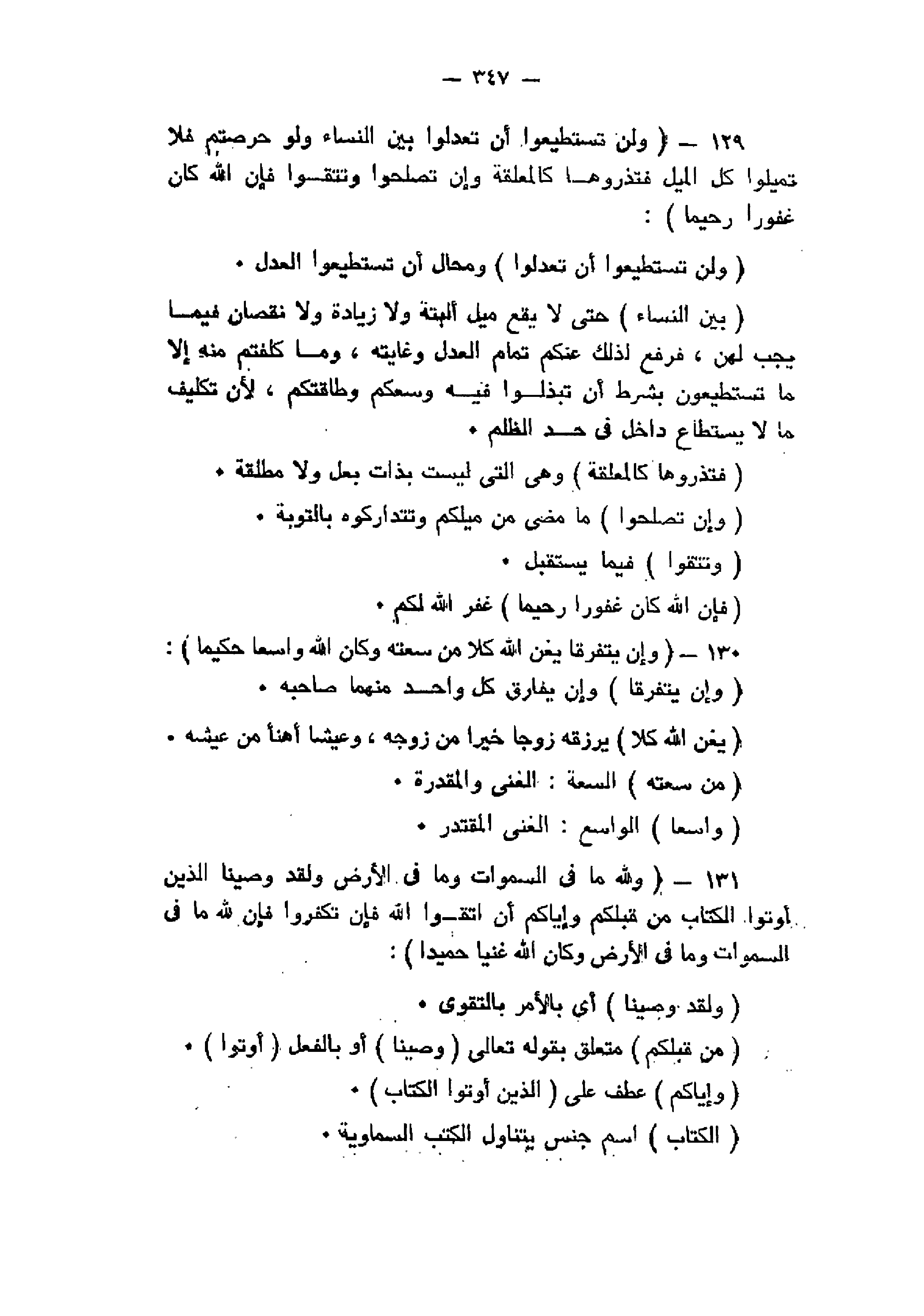 وَلَنْ تَسْتَطِيعُوا أَنْ تَعْدِلُوا بَيْنَ النِّساءِ وَلَوْ حَرَصْتُمْ فَلا تَمِيلُوا كُلَّ الْمَيْلِ فَتَذَرُوها كَالْمُعَلَّقَةِ وَإِنْ تُصْلِحُوا وَتَتَّقُوا فَإِنَّ اللَّهَ كانَ غَفُوراً رَحِيماً (129) وَإِنْ يَتَفَرَّقا يُغْنِ اللَّهُ كُلاًّ مِنْ سَعَتِهِ وَكانَ اللَّهُ واسِعاً حَكِيماً (130) وَلِلَّهِ ما فِي السَّماواتِ وَما فِي الْأَرْضِ وَلَقَدْ وَصَّيْنَا الَّذِينَ أُوتُوا الْكِتابَ مِنْ قَبْلِكُمْ وَإِيَّاكُمْ أَنِ اتَّقُوا اللَّهَ وَإِنْ تَكْفُرُوا فَإِنَّ لِلَّهِ ما فِي السَّماواتِ وَما فِي الْأَرْضِ وَكانَ اللَّهُ غَنِيًّا حَمِيداً (131)