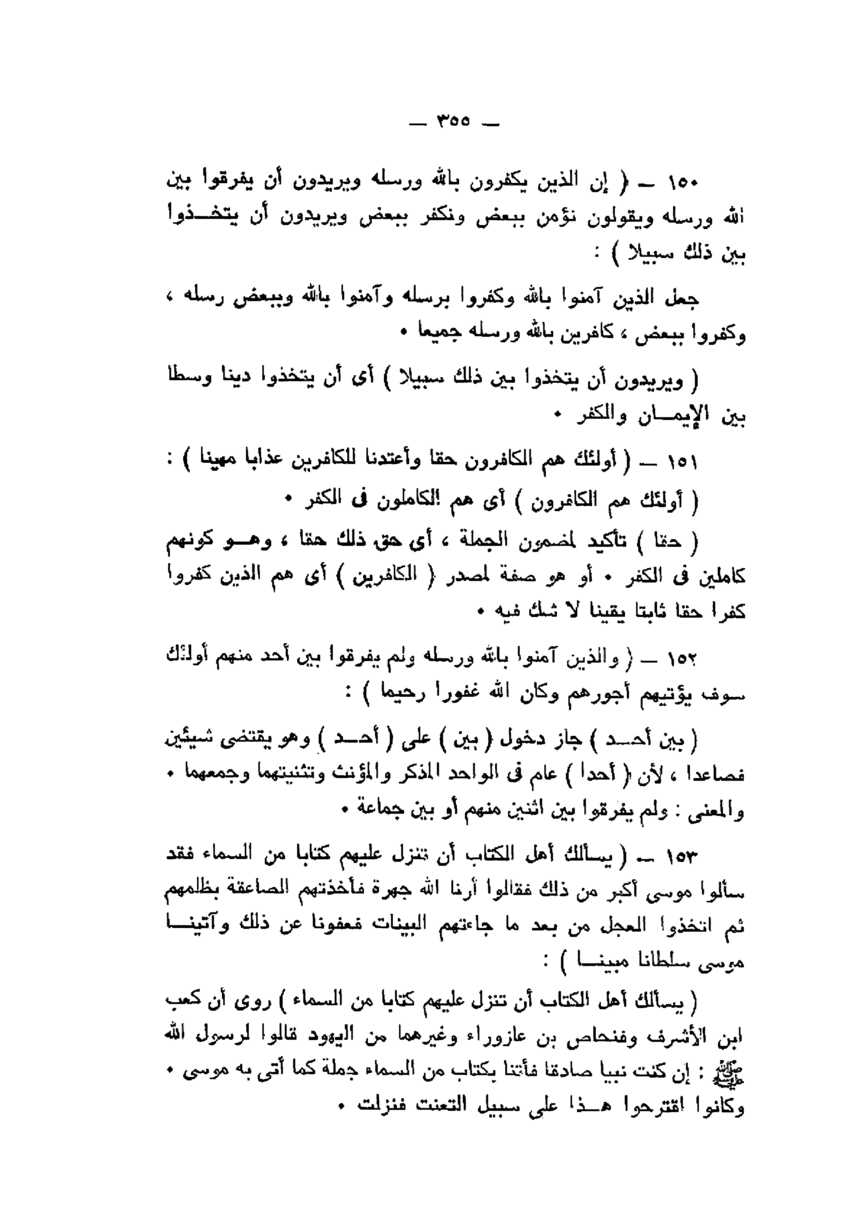 إِنَّ الَّذِينَ يَكْفُرُونَ بِاللَّهِ وَرُسُلِهِ وَيُرِيدُونَ أَنْ يُفَرِّقُوا بَيْنَ اللَّهِ وَرُسُلِهِ وَيَقُولُونَ نُؤْمِنُ بِبَعْضٍ وَنَكْفُرُ بِبَعْضٍ وَيُرِيدُونَ أَنْ يَتَّخِذُوا بَيْنَ ذلِكَ سَبِيلاً (150) أُولئِكَ هُمُ الْكافِرُونَ حَقًّا وَأَعْتَدْنا لِلْكافِرِينَ عَذاباً مُهِيناً (151) وَالَّذِينَ آمَنُوا بِاللَّهِ وَرُسُلِهِ وَلَمْ يُفَرِّقُوا بَيْنَ أَحَدٍ مِنْهُمْ أُولئِكَ سَوْفَ يُؤْتِيهِمْ أُجُورَهُمْ وَكانَ اللَّهُ غَفُوراً رَحِيماً (152) يَسْئَلُكَ أَهْلُ الْكِتابِ أَنْ تُنَزِّلَ عَلَيْهِمْ كِتاباً مِنَ السَّماءِ فَقَدْ سَأَلُوا مُوسى أَكْبَرَ مِنْ ذلِكَ فَقالُوا أَرِنَا اللَّهَ جَهْرَةً فَأَخَذَتْهُمُ الصَّاعِقَةُ بِظُلْمِهِمْ ثُمَّ اتَّخَذُوا الْعِجْلَ مِنْ بَعْدِ ما جاءَتْهُمُ الْبَيِّناتُ فَعَفَوْنا عَنْ ذلِكَ وَآتَيْنا مُوسى سُلْطاناً مُبِيناً (153)