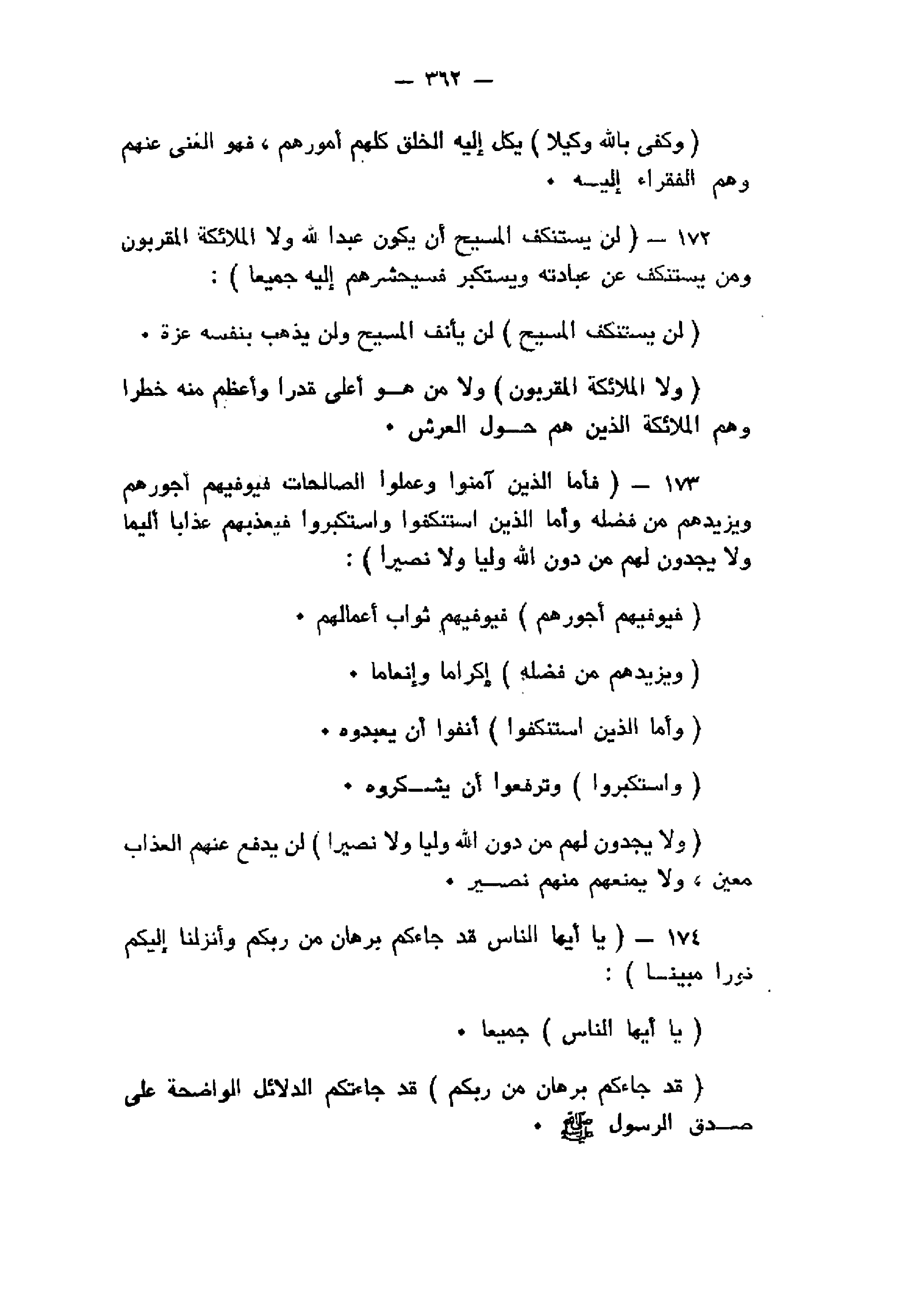 لَنْ يَسْتَنْكِفَ الْمَسِيحُ أَنْ يَكُونَ عَبْداً لِلَّهِ وَلا الْمَلائِكَةُ الْمُقَرَّبُونَ وَمَنْ يَسْتَنْكِفْ عَنْ عِبادَتِهِ وَيَسْتَكْبِرْ فَسَيَحْشُرُهُمْ إِلَيْهِ جَمِيعاً (172) فَأَمَّا الَّذِينَ آمَنُوا وَعَمِلُوا الصَّالِحاتِ فَيُوَفِّيهِمْ أُجُورَهُمْ وَيَزِيدُهُمْ مِنْ فَضْلِهِ وَأَمَّا الَّذِينَ اسْتَنْكَفُوا وَاسْتَكْبَرُوا فَيُعَذِّبُهُمْ عَذاباً أَلِيماً وَلا يَجِدُونَ لَهُمْ مِنْ دُونِ اللَّهِ وَلِيًّا وَلا نَصِيراً (173) يا أَيُّهَا النَّاسُ قَدْ جاءَكُمْ بُرْهانٌ مِنْ رَبِّكُمْ وَأَنْزَلْنا إِلَيْكُمْ نُوراً مُبِيناً (174)