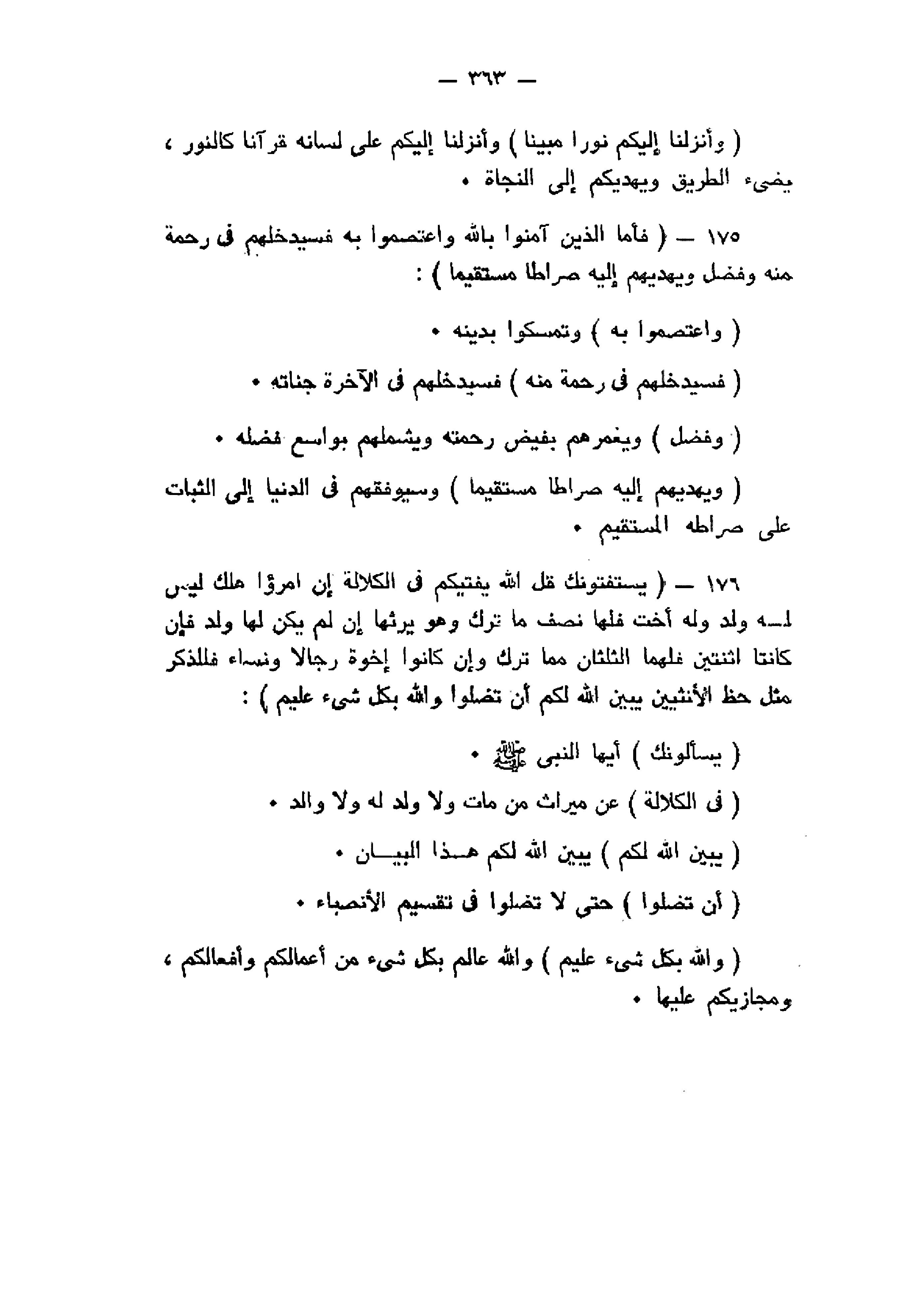 فَأَمَّا الَّذِينَ آمَنُوا بِاللَّهِ وَاعْتَصَمُوا بِهِ فَسَيُدْخِلُهُمْ فِي رَحْمَةٍ مِنْهُ وَفَضْلٍ وَيَهْدِيهِمْ إِلَيْهِ صِراطاً مُسْتَقِيماً (175) يَسْتَفْتُونَكَ قُلِ اللَّهُ يُفْتِيكُمْ فِي الْكَلالَةِ إِنِ امْرُؤٌ هَلَكَ لَيْسَ لَهُ وَلَدٌ وَلَهُ أُخْتٌ فَلَها نِصْفُ ما تَرَكَ وَهُوَ يَرِثُها إِنْ لَمْ يَكُنْ لَها وَلَدٌ فَإِنْ كانَتَا اثْنَتَيْنِ فَلَهُمَا الثُّلُثانِ مِمَّا تَرَكَ وَإِنْ كانُوا إِخْوَةً رِجالاً وَنِساءً فَلِلذَّكَرِ مِثْلُ حَظِّ الْأُنْثَيَيْنِ يُبَيِّنُ اللَّهُ لَكُمْ أَنْ تَضِلُّوا وَاللَّهُ بِكُلِّ شَيْءٍ عَلِيمٌ (176)