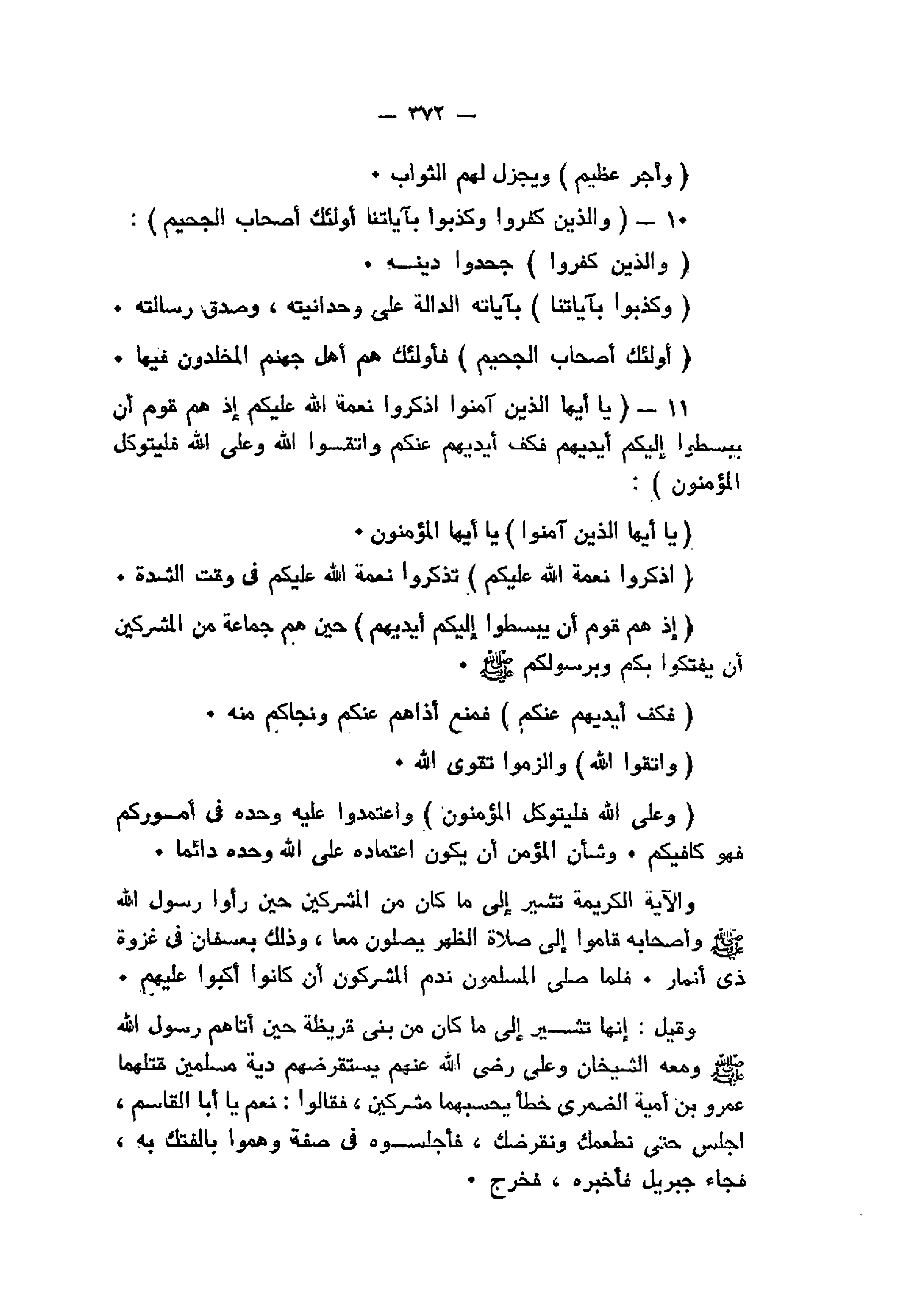 وَالَّذِينَ كَفَرُوا وَكَذَّبُوا بِآياتِنا أُولئِكَ أَصْحابُ الْجَحِيمِ (10) يا أَيُّهَا الَّذِينَ آمَنُوا اذْكُرُوا نِعْمَتَ اللَّهِ عَلَيْكُمْ إِذْ هَمَّ قَوْمٌ أَنْ يَبْسُطُوا إِلَيْكُمْ أَيْدِيَهُمْ فَكَفَّ أَيْدِيَهُمْ عَنْكُمْ وَاتَّقُوا اللَّهَ وَعَلَى اللَّهِ فَلْيَتَوَكَّلِ الْمُؤْمِنُونَ (11)