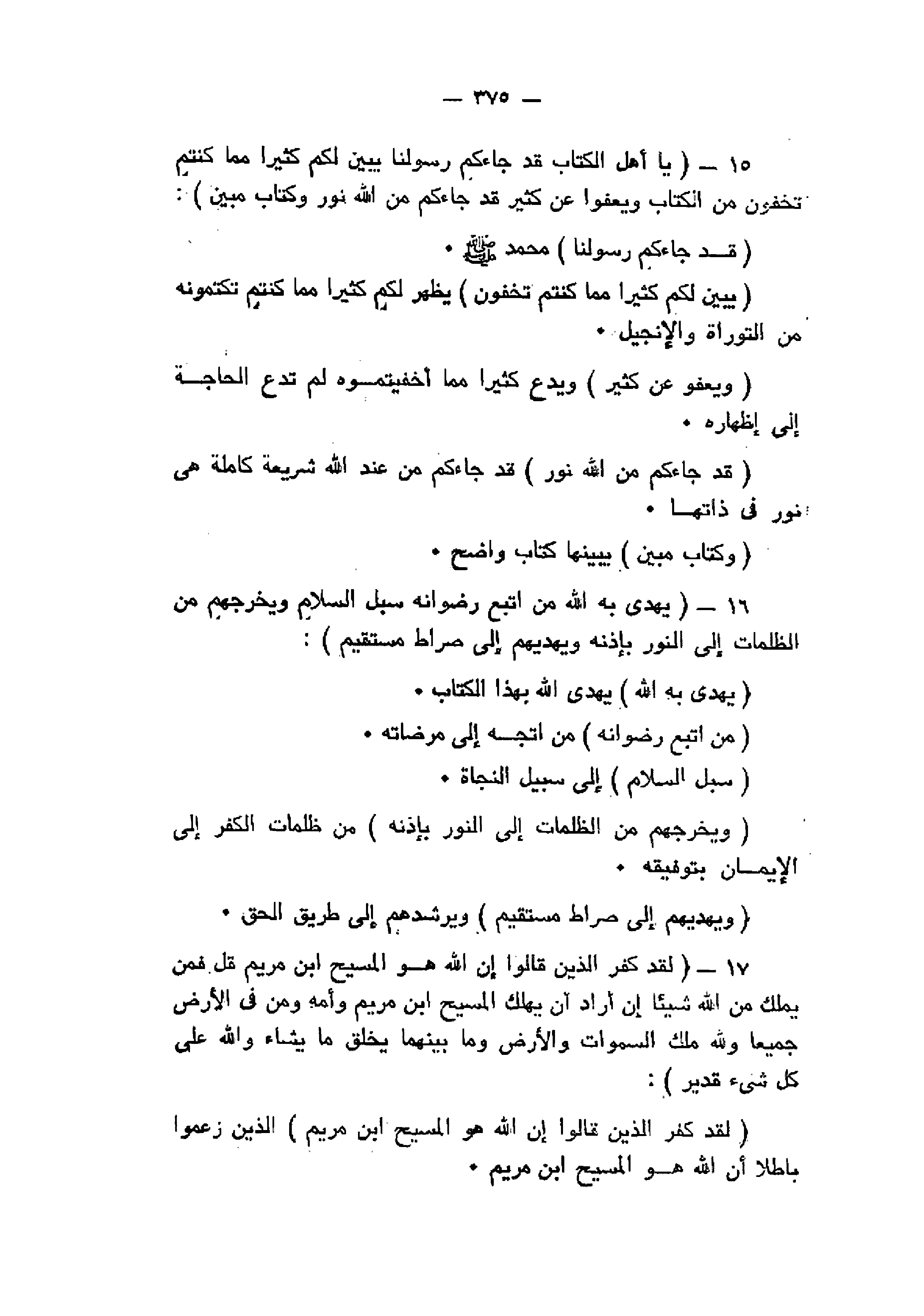 يا أَهْلَ الْكِتابِ قَدْ جاءَكُمْ رَسُولُنا يُبَيِّنُ لَكُمْ كَثِيراً مِمَّا كُنْتُمْ تُخْفُونَ مِنَ الْكِتابِ وَيَعْفُوا عَنْ كَثِيرٍ قَدْ جاءَكُمْ مِنَ اللَّهِ نُورٌ وَكِتابٌ مُبِينٌ (15) يَهْدِي بِهِ اللَّهُ مَنِ اتَّبَعَ رِضْوانَهُ سُبُلَ السَّلامِ وَيُخْرِجُهُمْ مِنَ الظُّلُماتِ إِلَى النُّورِ بِإِذْنِهِ وَيَهْدِيهِمْ إِلى صِراطٍ مُسْتَقِيمٍ (16) لَقَدْ كَفَرَ الَّذِينَ قالُوا إِنَّ اللَّهَ هُوَ الْمَسِيحُ ابْنُ مَرْيَمَ قُلْ فَمَنْ يَمْلِكُ مِنَ اللَّهِ شَيْئاً إِنْ أَرادَ أَنْ يُهْلِكَ الْمَسِيحَ ابْنَ مَرْيَمَ وَأُمَّهُ وَمَنْ فِي الْأَرْضِ جَمِيعاً وَلِلَّهِ مُلْكُ السَّماواتِ وَالْأَرْضِ وَما بَيْنَهُما يَخْلُقُ ما يَشاءُ وَاللَّهُ عَلى كُلِّ شَيْءٍ قَدِيرٌ (17)