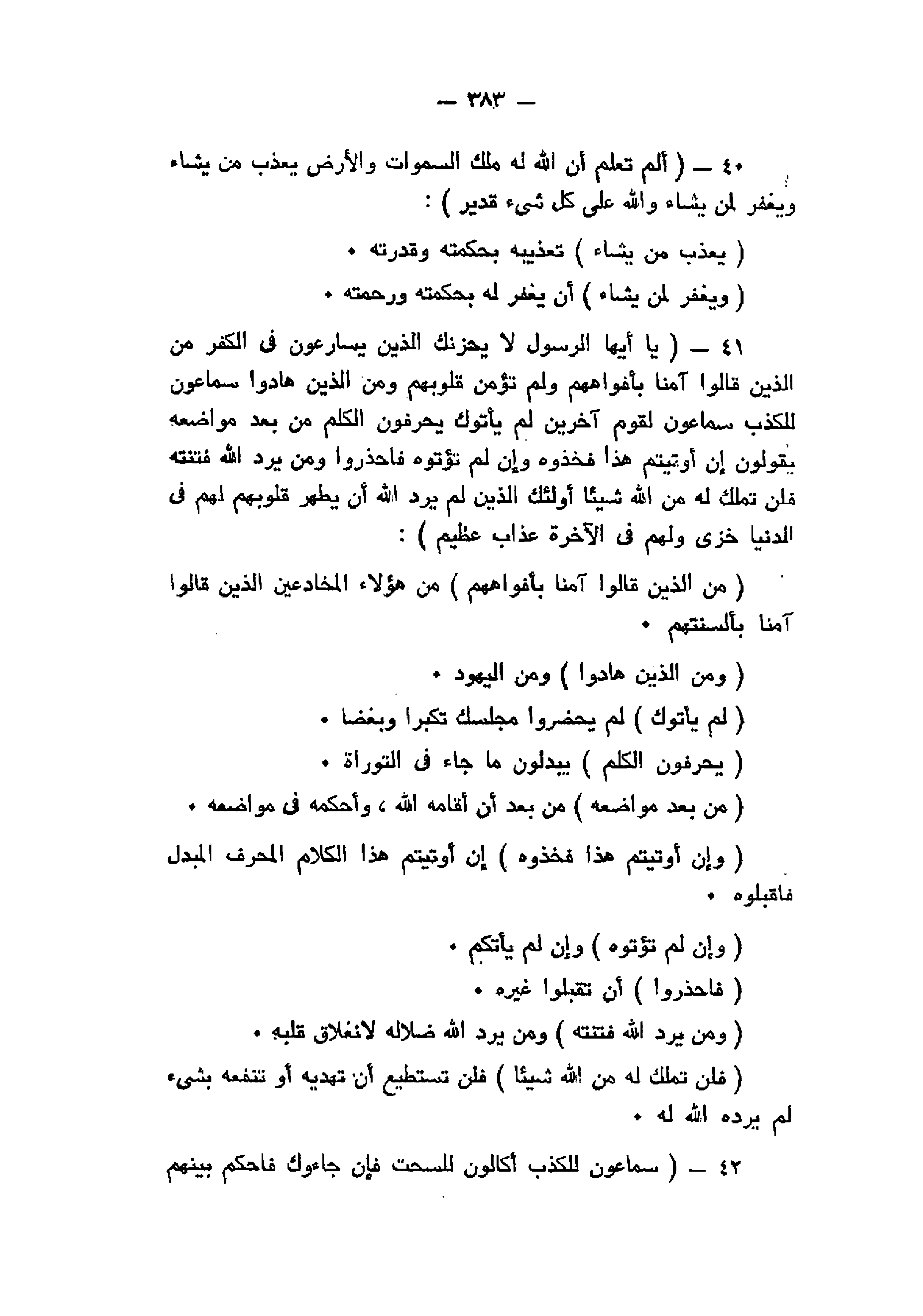 أَلَمْ تَعْلَمْ أَنَّ اللَّهَ لَهُ مُلْكُ السَّماواتِ وَالْأَرْضِ يُعَذِّبُ مَنْ يَشاءُ وَيَغْفِرُ لِمَنْ يَشاءُ وَاللَّهُ عَلى كُلِّ شَيْءٍ قَدِيرٌ (40) يا أَيُّهَا الرَّسُولُ لا يَحْزُنْكَ الَّذِينَ يُسارِعُونَ فِي الْكُفْرِ مِنَ الَّذِينَ قالُوا آمَنَّا بِأَفْواهِهِمْ وَلَمْ تُؤْمِنْ قُلُوبُهُمْ وَمِنَ الَّذِينَ هادُوا سَمَّاعُونَ لِلْكَذِبِ سَمَّاعُونَ لِقَوْمٍ آخَرِينَ لَمْ يَأْتُوكَ يُحَرِّفُونَ الْكَلِمَ مِنْ بَعْدِ مَواضِعِهِ يَقُولُونَ إِنْ أُوتِيتُمْ هذا فَخُذُوهُ وَإِنْ لَمْ تُؤْتَوْهُ فَاحْذَرُوا وَمَنْ يُرِدِ اللَّهُ فِتْنَتَهُ فَلَنْ تَمْلِكَ لَهُ مِنَ اللَّهِ شَيْئاً أُولئِكَ الَّذِينَ لَمْ يُرِدِ اللَّهُ أَنْ يُطَهِّرَ قُلُوبَهُمْ لَهُمْ فِي الدُّنْيا خِزْيٌ وَلَهُمْ فِي الْآخِرَةِ عَذابٌ عَظِيمٌ (41)