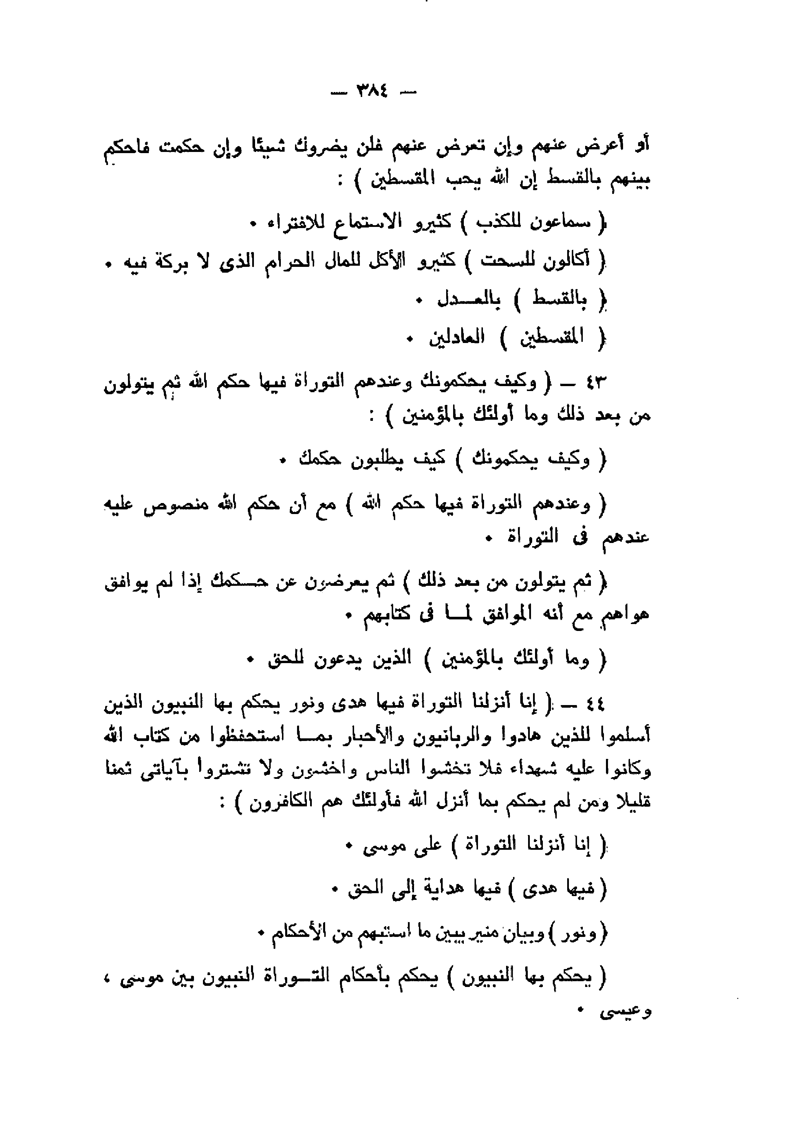 سَمَّاعُونَ لِلْكَذِبِ أَكَّالُونَ لِلسُّحْتِ فَإِنْ جاؤُكَ فَاحْكُمْ بَيْنَهُمْ أَوْ أَعْرِضْ عَنْهُمْ وَإِنْ تُعْرِضْ عَنْهُمْ فَلَنْ يَضُرُّوكَ شَيْئاً وَإِنْ حَكَمْتَ فَاحْكُمْ بَيْنَهُمْ بِالْقِسْطِ إِنَّ اللَّهَ يُحِبُّ الْمُقْسِطِينَ (42) وَكَيْفَ يُحَكِّمُونَكَ وَعِنْدَهُمُ التَّوْراةُ فِيها حُكْمُ اللَّهِ ثُمَّ يَتَوَلَّوْنَ مِنْ بَعْدِ ذلِكَ وَما أُولئِكَ بِالْمُؤْمِنِينَ (43) إِنَّا أَنْزَلْنَا التَّوْراةَ فِيها هُدىً وَنُورٌ يَحْكُمُ بِهَا النَّبِيُّونَ الَّذِينَ أَسْلَمُوا لِلَّذِينَ هادُوا وَالرَّبَّانِيُّونَ وَالْأَحْبارُ بِمَا اسْتُحْفِظُوا مِنْ كِتابِ اللَّهِ وَكانُوا عَلَيْهِ شُهَداءَ فَلا تَخْشَوُا النَّاسَ وَاخْشَوْنِ وَلا تَشْتَرُوا بِآياتِي ثَمَناً قَلِيلاً وَمَنْ لَمْ يَحْكُمْ بِما أَنْزَلَ اللَّهُ فَأُولئِكَ هُمُ الْكافِرُونَ (44)
