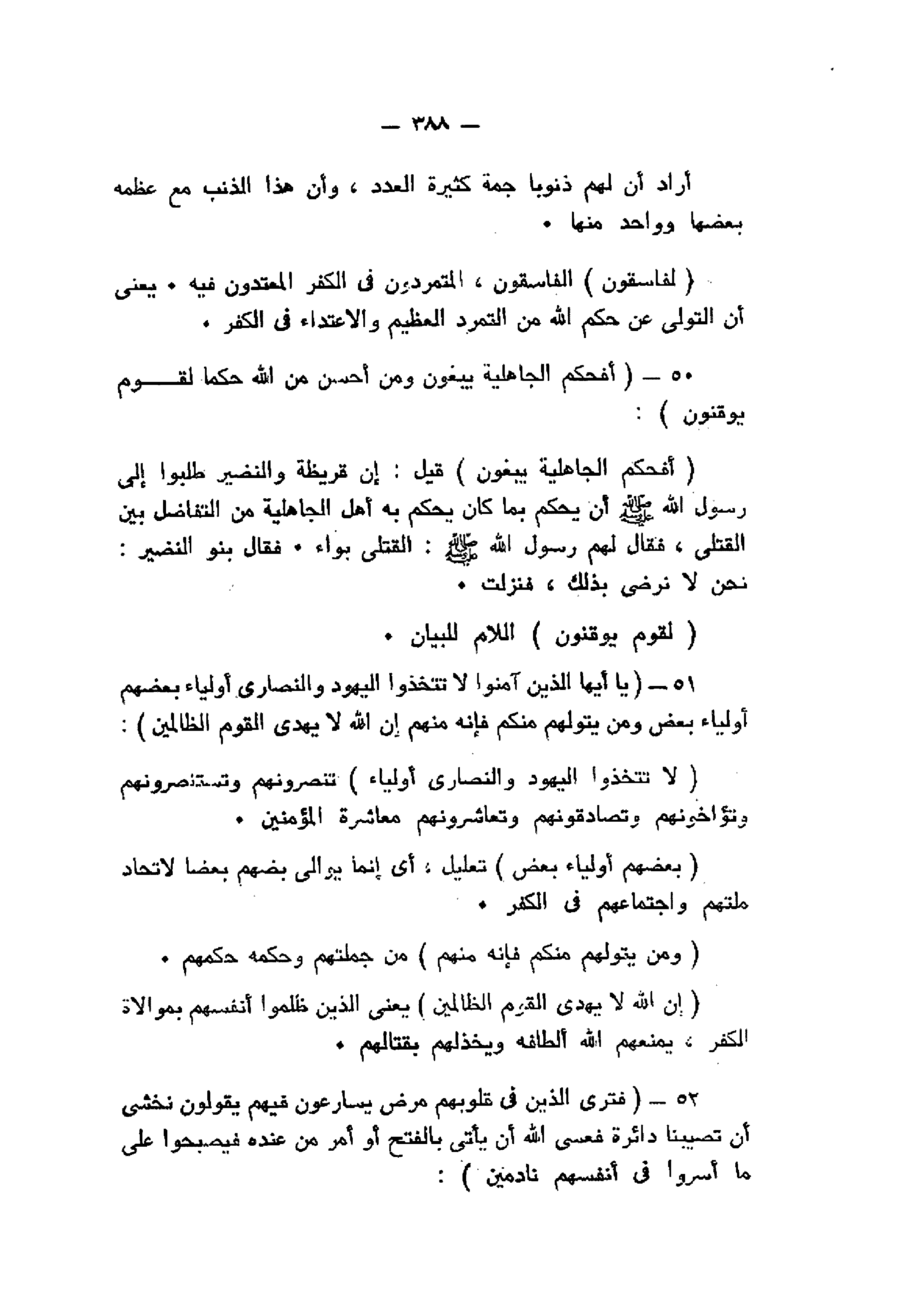 أَفَحُكْمَ الْجاهِلِيَّةِ يَبْغُونَ وَمَنْ أَحْسَنُ مِنَ اللَّهِ حُكْماً لِقَوْمٍ يُوقِنُونَ (50) يا أَيُّهَا الَّذِينَ آمَنُوا لا تَتَّخِذُوا الْيَهُودَ وَالنَّصارى أَوْلِياءَ بَعْضُهُمْ أَوْلِياءُ بَعْضٍ وَمَنْ يَتَوَلَّهُمْ مِنْكُمْ فَإِنَّهُ مِنْهُمْ إِنَّ اللَّهَ لا يَهْدِي الْقَوْمَ الظَّالِمِينَ (51) فَتَرَى الَّذِينَ فِي قُلُوبِهِمْ مَرَضٌ يُسارِعُونَ فِيهِمْ يَقُولُونَ نَخْشى أَنْ تُصِيبَنا دائِرَةٌ فَعَسَى اللَّهُ أَنْ يَأْتِيَ بِالْفَتْحِ أَوْ أَمْرٍ مِنْ عِنْدِهِ فَيُصْبِحُوا عَلى ما أَسَرُّوا فِي أَنْفُسِهِمْ نادِمِينَ (52)
