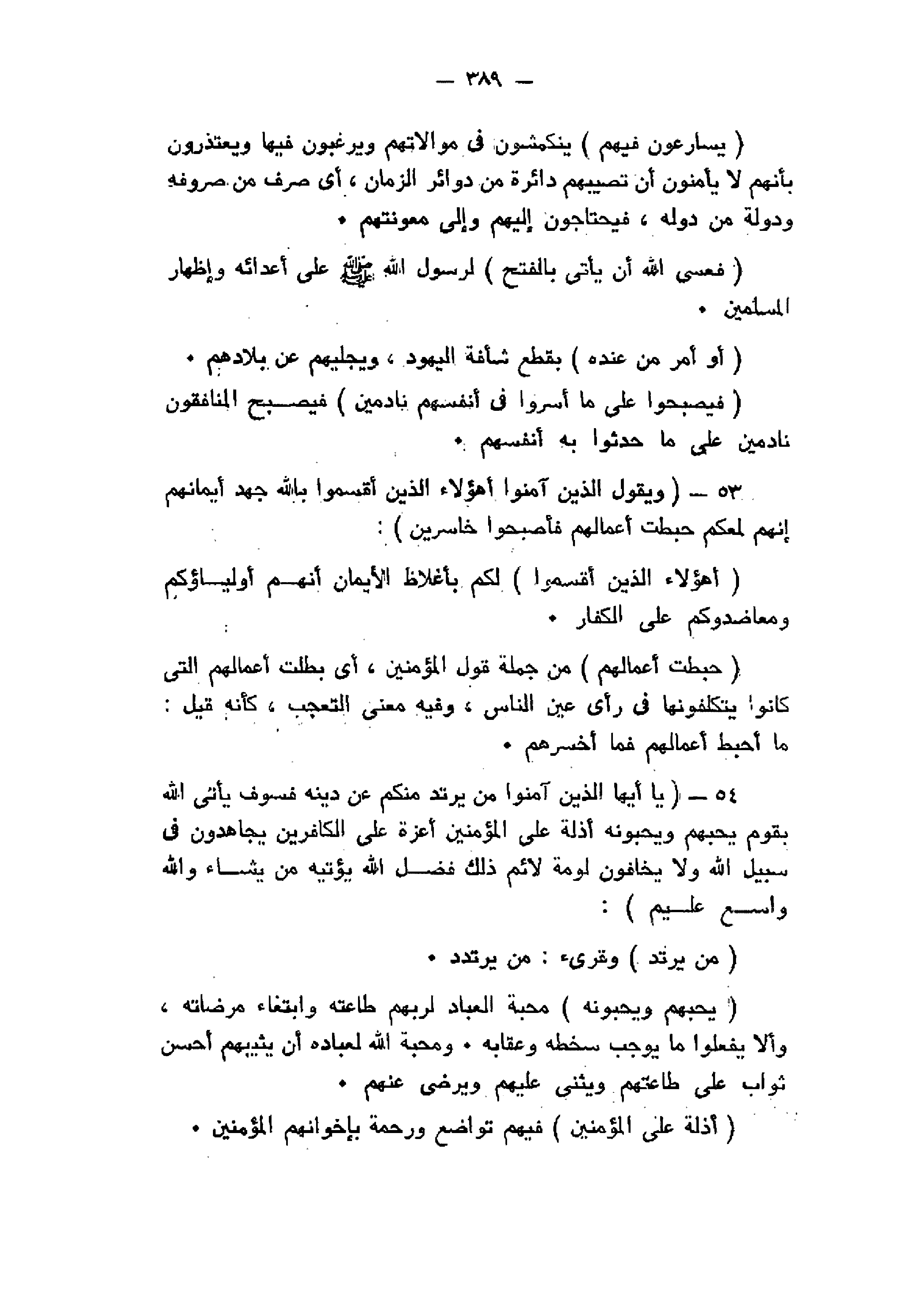 وَيَقُولُ الَّذِينَ آمَنُوا أَهؤُلاءِ الَّذِينَ أَقْسَمُوا بِاللَّهِ جَهْدَ أَيْمانِهِمْ إِنَّهُمْ لَمَعَكُمْ حَبِطَتْ أَعْمالُهُمْ فَأَصْبَحُوا خاسِرِينَ (53) يا أَيُّهَا الَّذِينَ آمَنُوا مَنْ يَرْتَدَّ مِنْكُمْ عَنْ دِينِهِ فَسَوْفَ يَأْتِي اللَّهُ بِقَوْمٍ يُحِبُّهُمْ وَيُحِبُّونَهُ أَذِلَّةٍ عَلَى الْمُؤْمِنِينَ أَعِزَّةٍ عَلَى الْكافِرِينَ يُجاهِدُونَ فِي سَبِيلِ اللَّهِ وَلا يَخافُونَ لَوْمَةَ لائِمٍ ذلِكَ فَضْلُ اللَّهِ يُؤْتِيهِ مَنْ يَشاءُ وَاللَّهُ واسِعٌ عَلِيمٌ (54)