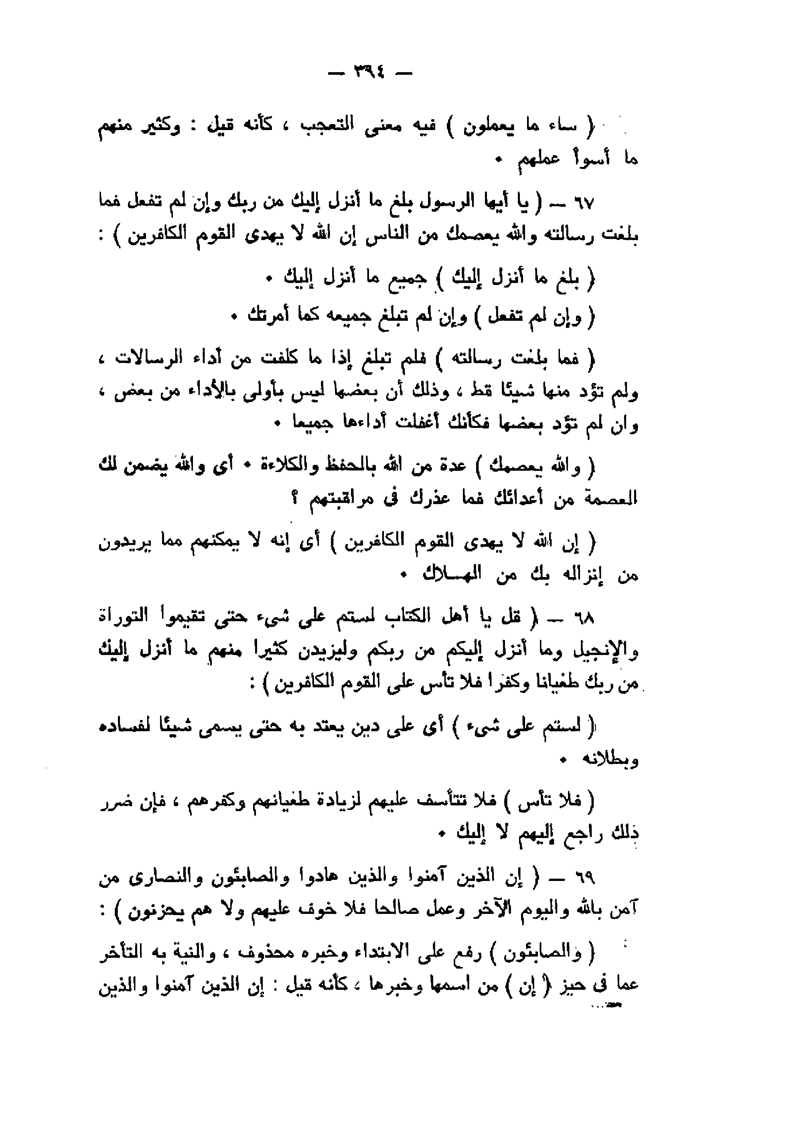 يا أَيُّهَا الرَّسُولُ بَلِّغْ ما أُنْزِلَ إِلَيْكَ مِنْ رَبِّكَ وَإِنْ لَمْ تَفْعَلْ فَما بَلَّغْتَ رِسالَتَهُ وَاللَّهُ يَعْصِمُكَ مِنَ النَّاسِ إِنَّ اللَّهَ لا يَهْدِي الْقَوْمَ الْكافِرِينَ (67) قُلْ يا أَهْلَ الْكِتابِ لَسْتُمْ عَلى شَيْءٍ حَتَّى تُقِيمُوا التَّوْراةَ وَالْإِنْجِيلَ وَما أُنْزِلَ إِلَيْكُمْ مِنْ رَبِّكُمْ وَلَيَزِيدَنَّ كَثِيراً مِنْهُمْ ما أُنْزِلَ إِلَيْكَ مِنْ رَبِّكَ طُغْياناً وَكُفْراً فَلا تَأْسَ عَلَى الْقَوْمِ الْكافِرِينَ (68) إِنَّ الَّذِينَ آمَنُوا وَالَّذِينَ هادُوا وَالصَّابِئُونَ وَالنَّصارى مَنْ آمَنَ بِاللَّهِ وَالْيَوْمِ الْآخِرِ وَعَمِلَ صالِحاً فَلا خَوْفٌ عَلَيْهِمْ وَلا هُمْ يَحْزَنُونَ (69)