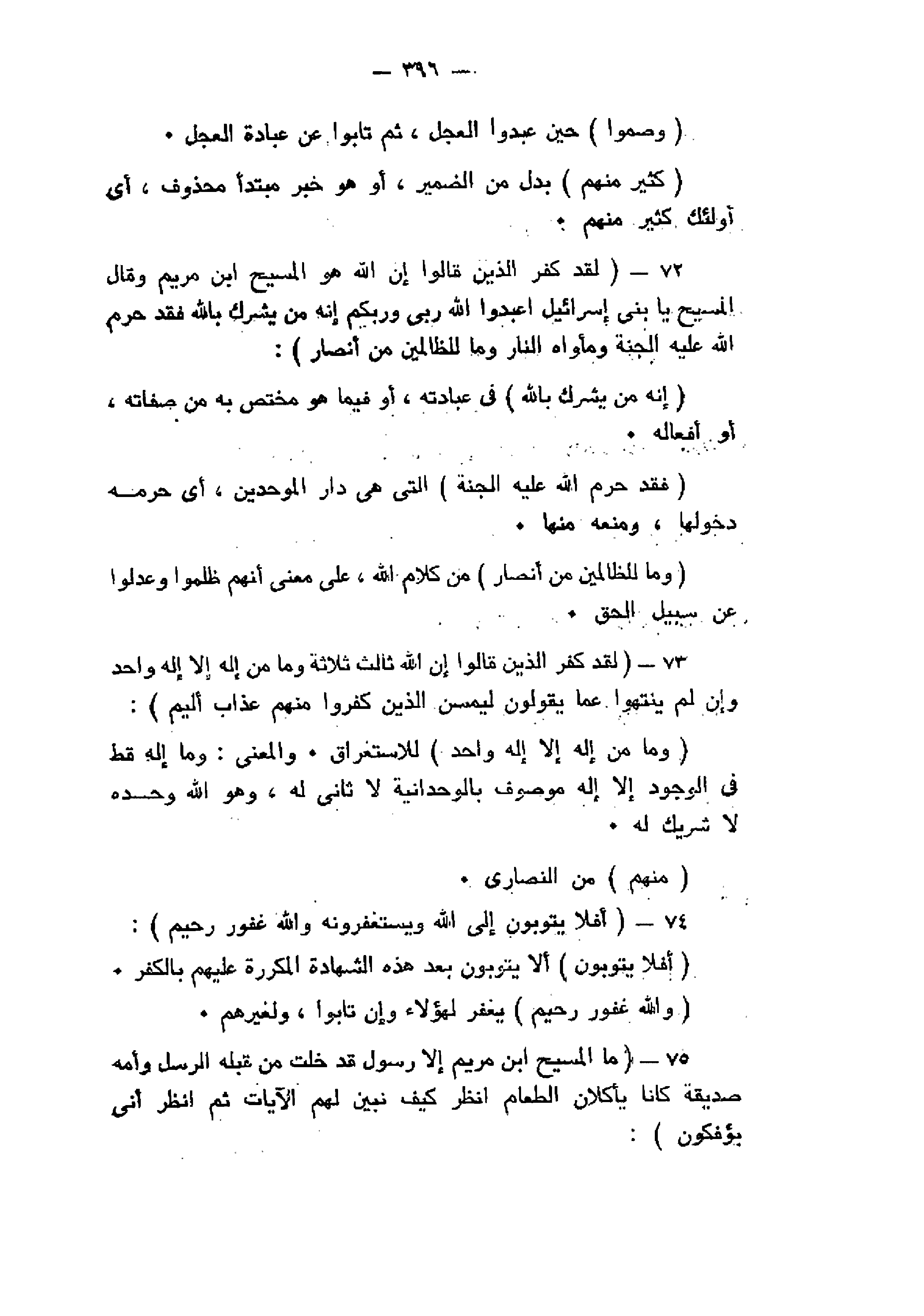 لَقَدْ كَفَرَ الَّذِينَ قالُوا إِنَّ اللَّهَ هُوَ الْمَسِيحُ ابْنُ مَرْيَمَ وَقالَ الْمَسِيحُ يا بَنِي إِسْرائِيلَ اعْبُدُوا اللَّهَ رَبِّي وَرَبَّكُمْ إِنَّهُ مَنْ يُشْرِكْ بِاللَّهِ فَقَدْ حَرَّمَ اللَّهُ عَلَيْهِ الْجَنَّةَ وَمَأْواهُ النَّارُ وَما لِلظَّالِمِينَ مِنْ أَنْصارٍ (72) لَقَدْ كَفَرَ الَّذِينَ قالُوا إِنَّ اللَّهَ ثالِثُ ثَلاثَةٍ وَما مِنْ إِلهٍ إِلاَّ إِلهٌ واحِدٌ وَإِنْ لَمْ يَنْتَهُوا عَمَّا يَقُولُونَ لَيَمَسَّنَّ الَّذِينَ كَفَرُوا مِنْهُمْ عَذابٌ أَلِيمٌ (73) أَفَلا يَتُوبُونَ إِلَى اللَّهِ وَيَسْتَغْفِرُونَهُ وَاللَّهُ غَفُورٌ رَحِيمٌ (74) مَا الْمَسِيحُ ابْنُ مَرْيَمَ إِلاَّ رَسُولٌ قَدْ خَلَتْ مِنْ قَبْلِهِ الرُّسُلُ وَأُمُّهُ صِدِّيقَةٌ كانا يَأْكُلانِ الطَّعامَ انْظُرْ كَيْفَ نُبَيِّنُ لَهُمُ الْآياتِ ثُمَّ انْظُرْ أَنَّى يُؤْفَكُونَ (75)
