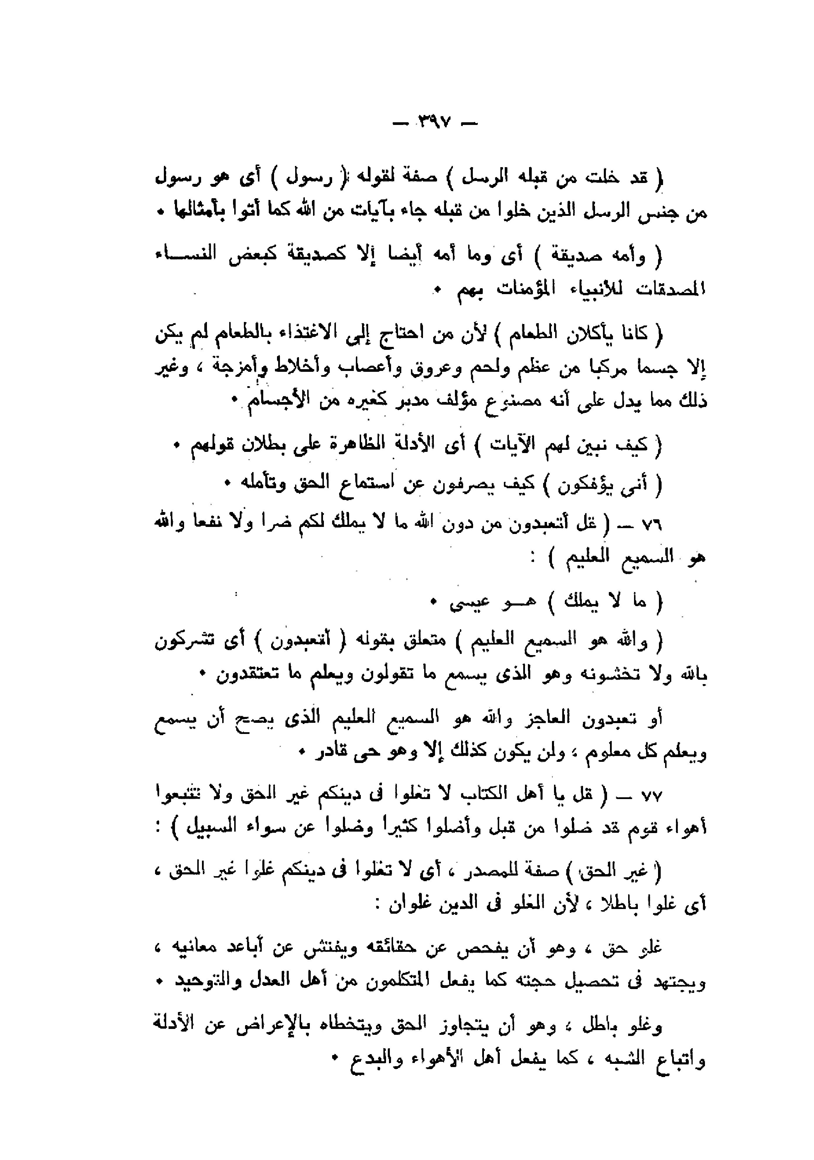 قُلْ أَتَعْبُدُونَ مِنْ دُونِ اللَّهِ ما لا يَمْلِكُ لَكُمْ ضَرًّا وَلا نَفْعاً وَاللَّهُ هُوَ السَّمِيعُ الْعَلِيمُ (76) قُلْ يا أَهْلَ الْكِتابِ لا تَغْلُوا فِي دِينِكُمْ غَيْرَ الْحَقِّ وَلا تَتَّبِعُوا أَهْواءَ قَوْمٍ قَدْ ضَلُّوا مِنْ قَبْلُ وَأَضَلُّوا كَثِيراً وَضَلُّوا عَنْ سَواءِ السَّبِيلِ (77)