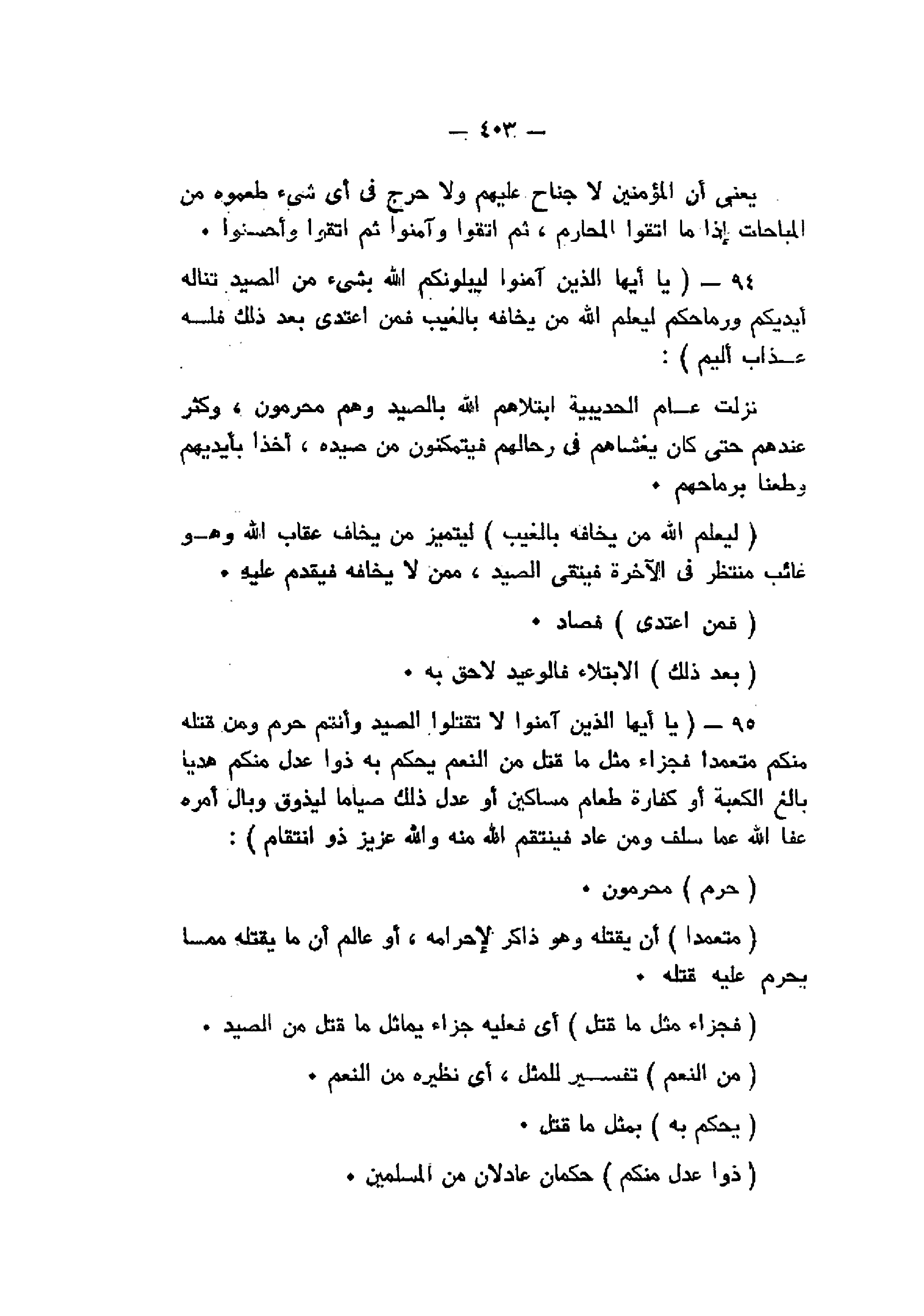 يا أَيُّهَا الَّذِينَ آمَنُوا لَيَبْلُوَنَّكُمُ اللَّهُ بِشَيْءٍ مِنَ الصَّيْدِ تَنالُهُ أَيْدِيكُمْ وَرِماحُكُمْ لِيَعْلَمَ اللَّهُ مَنْ يَخافُهُ بِالْغَيْبِ فَمَنِ اعْتَدى بَعْدَ ذلِكَ فَلَهُ عَذابٌ أَلِيمٌ (94) يا أَيُّهَا الَّذِينَ آمَنُوا لا تَقْتُلُوا الصَّيْدَ وَأَنْتُمْ حُرُمٌ وَمَنْ قَتَلَهُ مِنْكُمْ مُتَعَمِّداً فَجَزاءٌ مِثْلُ ما قَتَلَ مِنَ النَّعَمِ يَحْكُمُ بِهِ ذَوا عَدْلٍ مِنْكُمْ هَدْياً بالِغَ الْكَعْبَةِ أَوْ كَفَّارَةٌ طَعامُ مَساكِينَ أَوْ عَدْلُ ذلِكَ صِياماً لِيَذُوقَ وَبالَ أَمْرِهِ عَفَا اللَّهُ عَمَّا سَلَفَ وَمَنْ عادَ فَيَنْتَقِمُ اللَّهُ مِنْهُ وَاللَّهُ عَزِيزٌ ذُو انْتِقامٍ (95)
