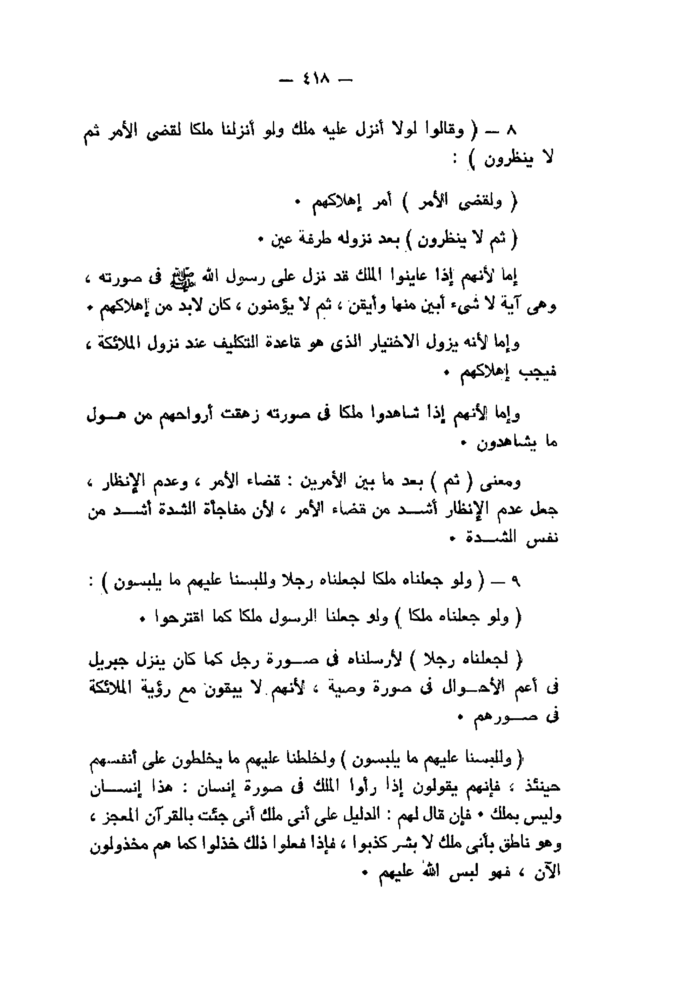 8- وَقالُوا لَوْلا أُنْزِلَ عَلَيْهِ مَلَكٌ وَلَوْ أَنْزَلْنا مَلَكاً لَقُضِيَ الْأَمْرُ ثُمَّ لا يُنْظَرُونَ: