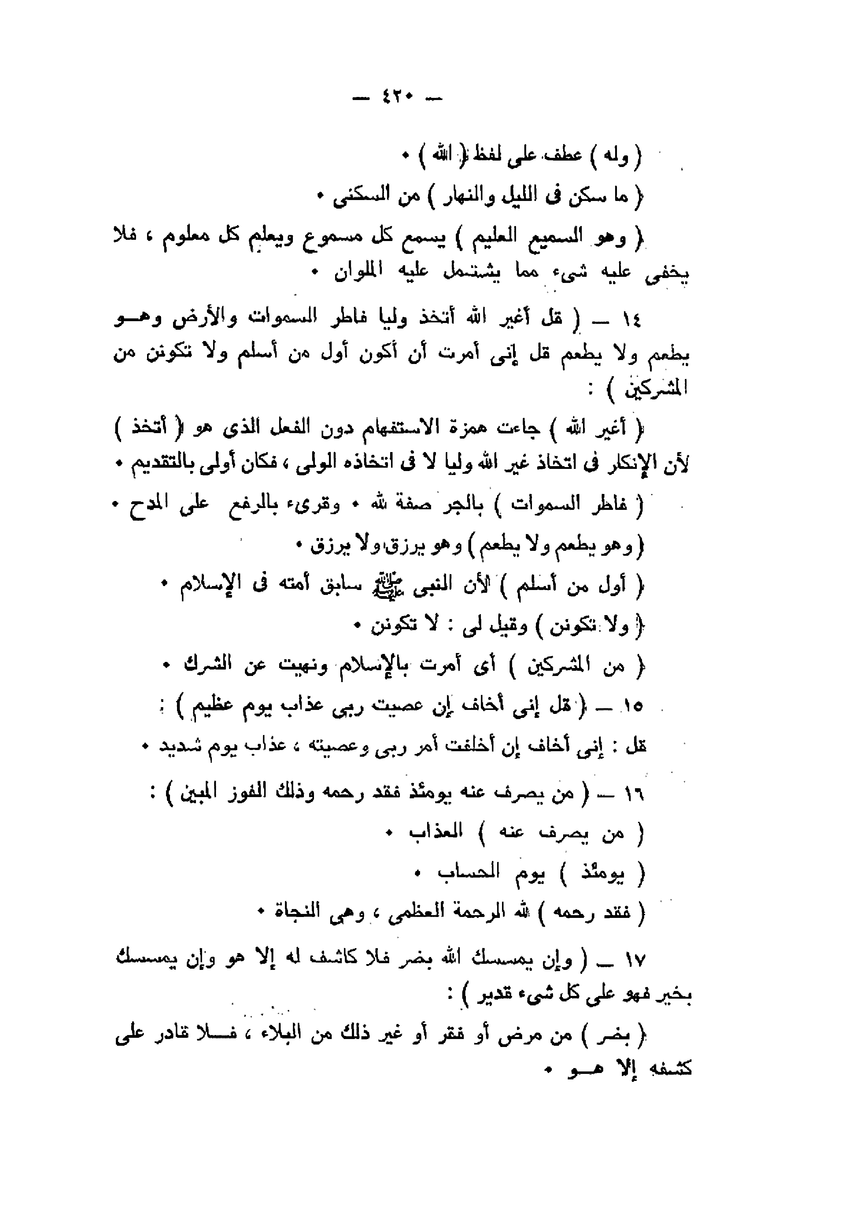 قُلْ أَغَيْرَ اللَّهِ أَتَّخِذُ وَلِيًّا فاطِرِ السَّماواتِ وَالْأَرْضِ وَهُوَ يُطْعِمُ وَلا يُطْعَمُ قُلْ إِنِّي أُمِرْتُ أَنْ أَكُونَ أَوَّلَ مَنْ أَسْلَمَ وَلا تَكُونَنَّ مِنَ الْمُشْرِكِينَ (14) قُلْ إِنِّي أَخافُ إِنْ عَصَيْتُ رَبِّي عَذابَ يَوْمٍ عَظِيمٍ (15) مَنْ يُصْرَفْ عَنْهُ يَوْمَئِذٍ فَقَدْ رَحِمَهُ وَذلِكَ الْفَوْزُ الْمُبِينُ (16) وَإِنْ يَمْسَسْكَ اللَّهُ بِضُرٍّ فَلا كاشِفَ لَهُ إِلاَّ هُوَ وَإِنْ يَمْسَسْكَ بِخَيْرٍ فَهُوَ عَلى كُلِّ شَيْءٍ قَدِيرٌ (17)