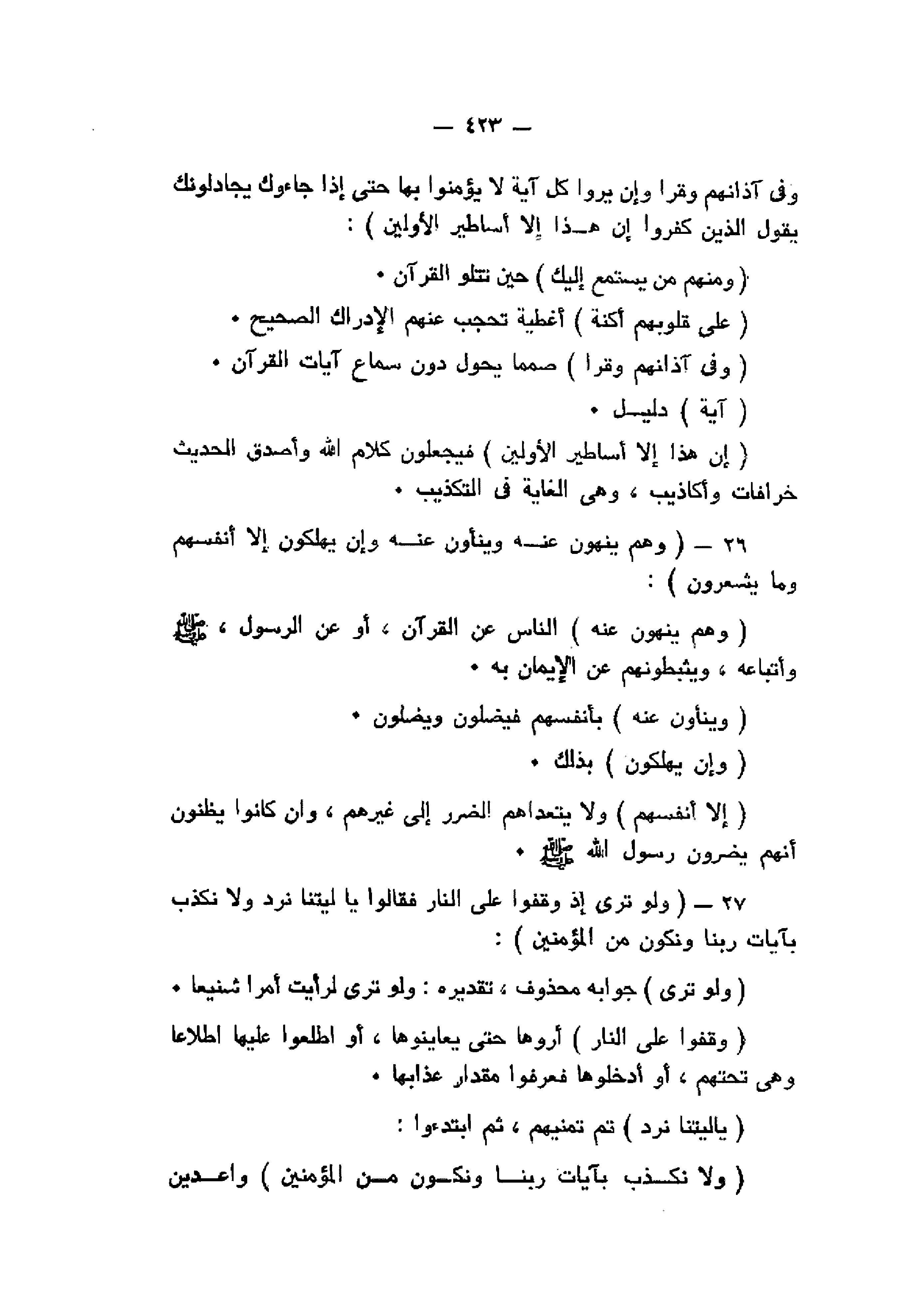 وَفِي آذانِهِمْ وَقْراً وَإِنْ يَرَوْا كُلَّ آيَةٍ لا يُؤْمِنُوا بِها حَتَّى إِذا جاؤُكَ يُجادِلُونَكَ يَقُولُ الَّذِينَ كَفَرُوا إِنْ هذا إِلَّا أَساطِيرُ الْأَوَّلِينَ